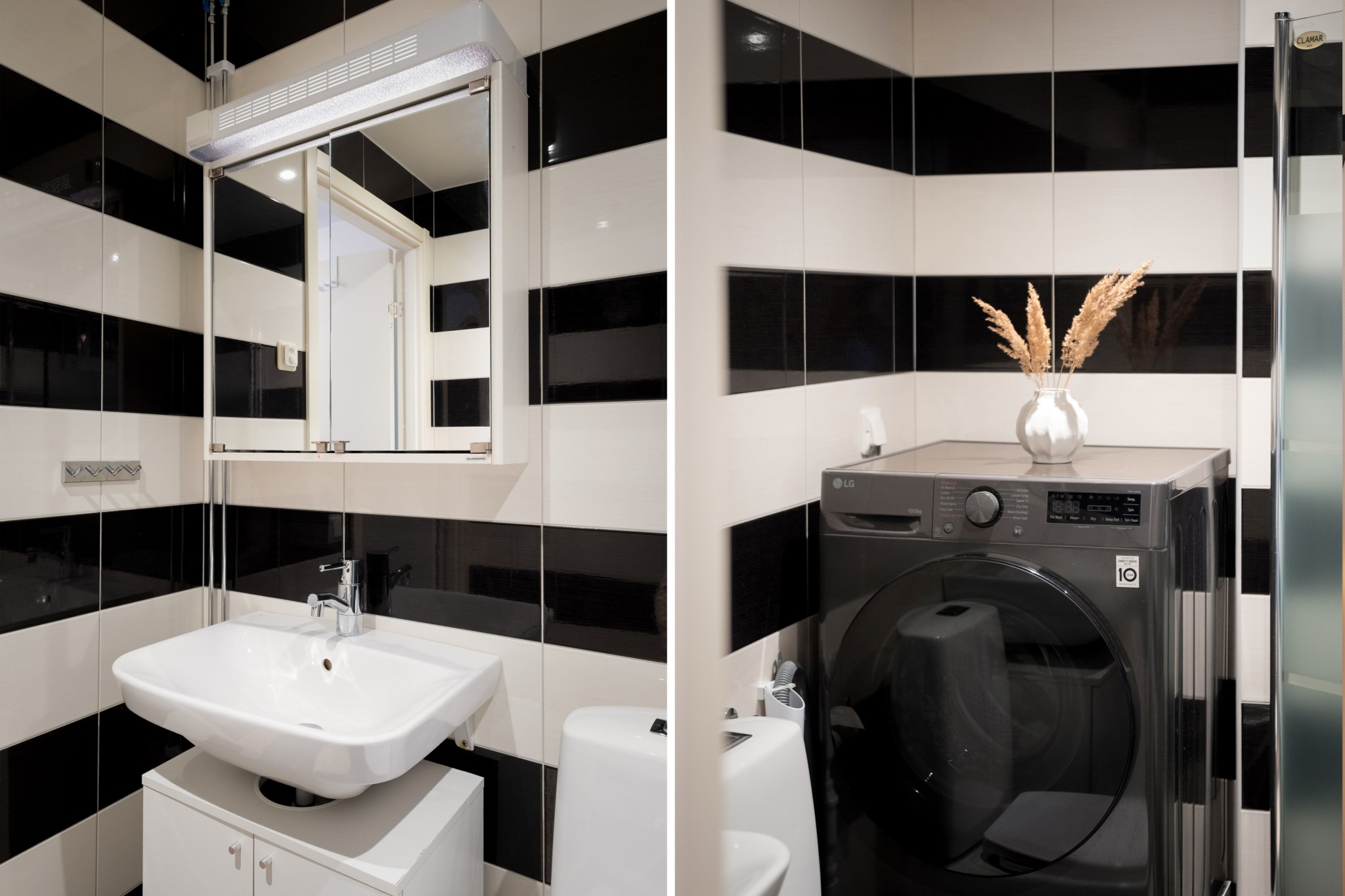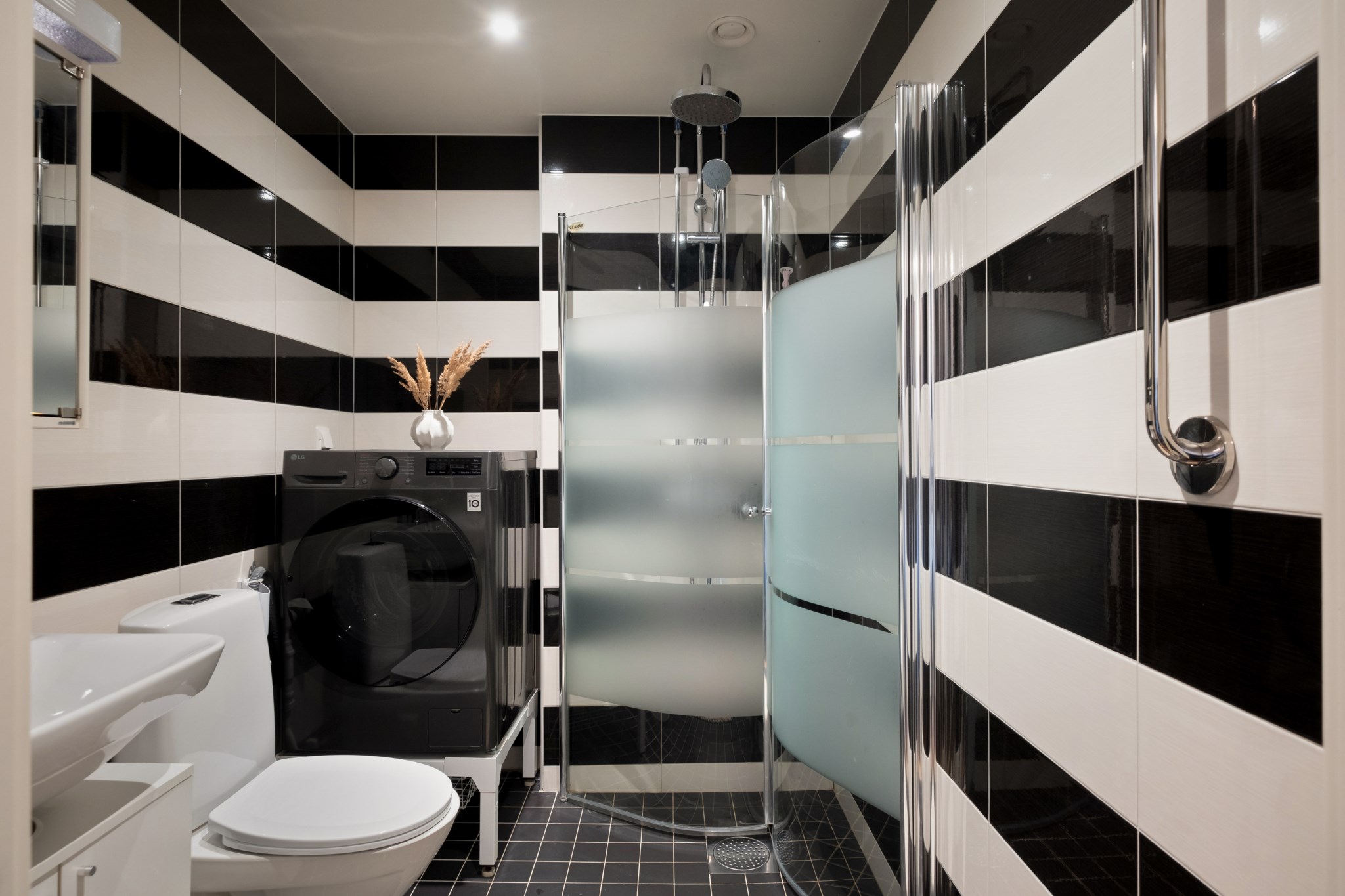 Fräscht helkaklat badrum. Badrumsutrustningen består av wc, handfat i kommod, spegel, dusch med vikbara glasväggar samt en mycket praktisk kombinerad tvättmaskin och torktumlare.