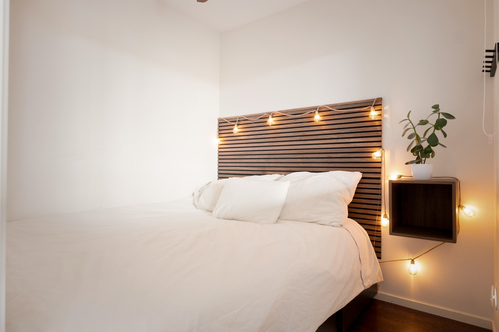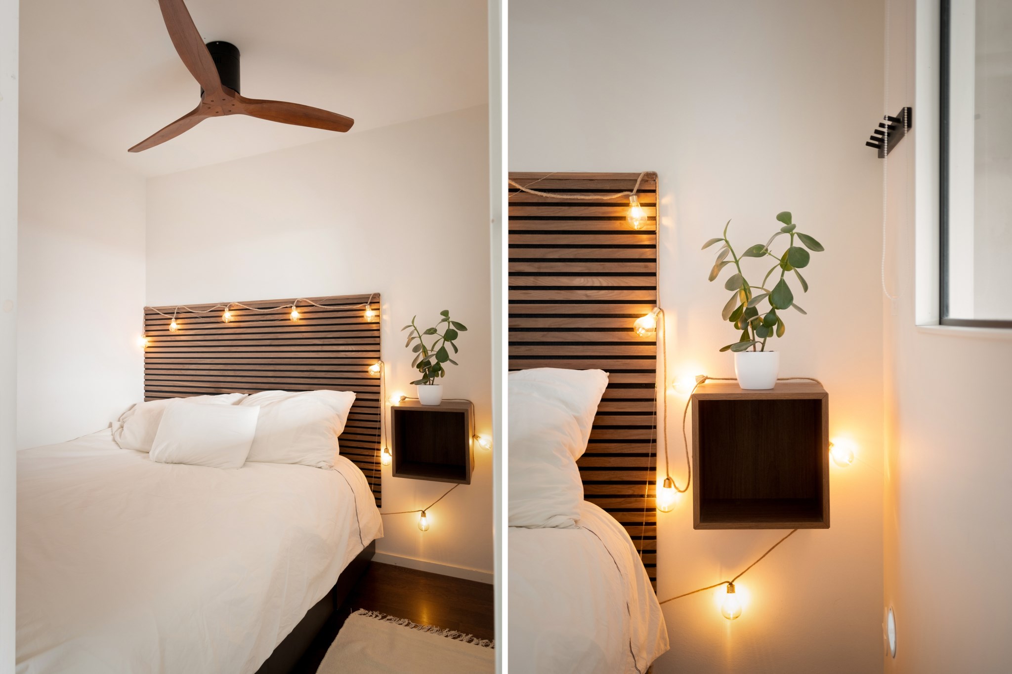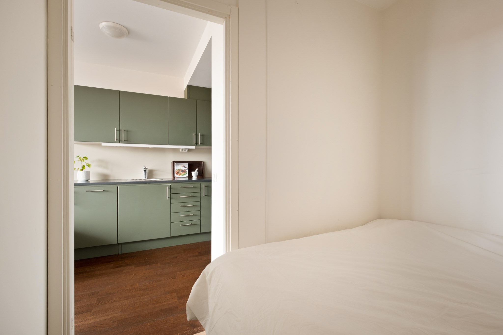 Smart planerad sovalkov med plats för dubbelsäng. Här finns även ett fönster mot vardagsrummet som bjuder på ett härligt ljusflöde i rummet.
