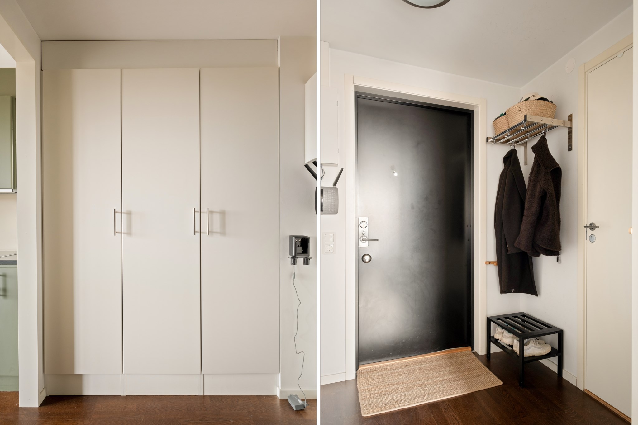 Ni välkomnas in i en rymlig hall med gott om plats för avhängning av ytterkläder direkt innanför dörren samt plats för ytterligare förvaring i stora garderober längs med väggen.