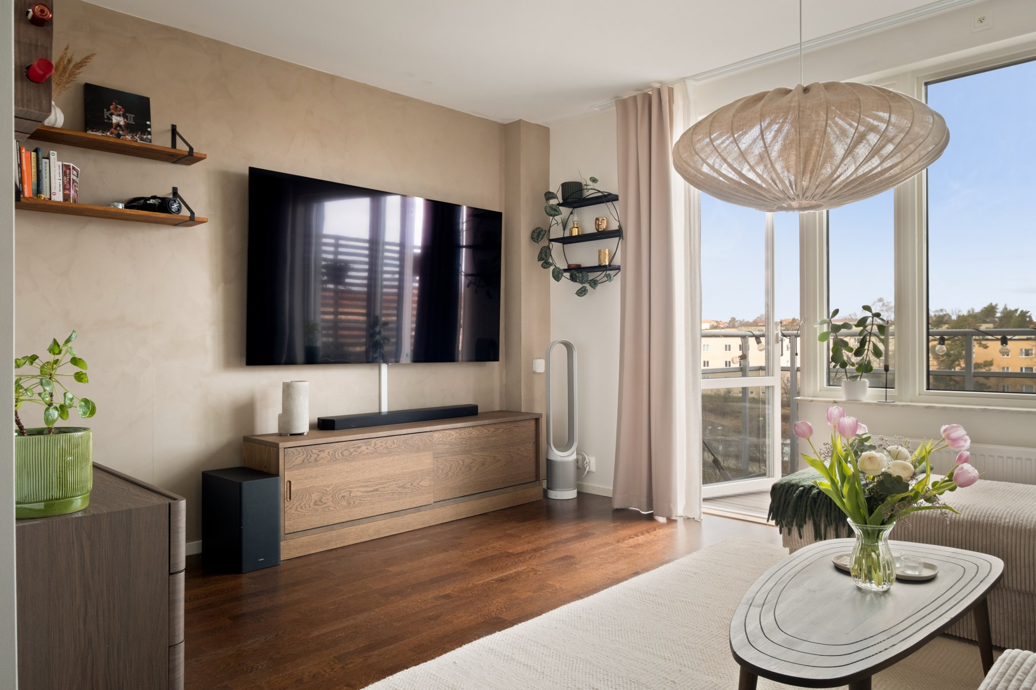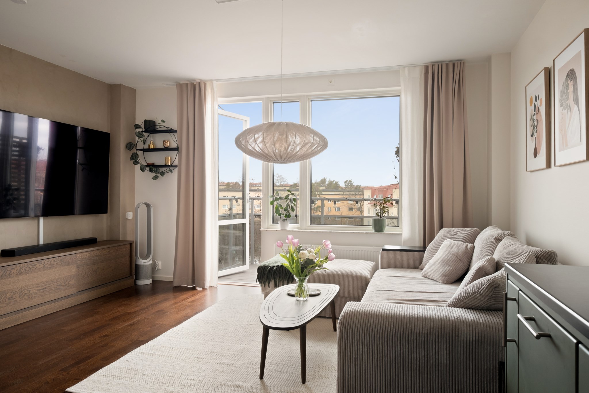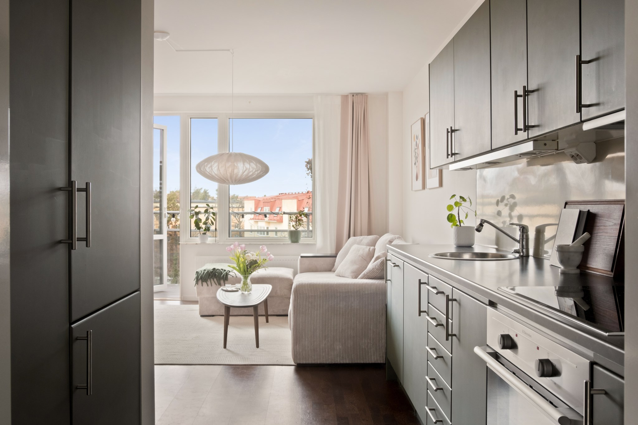 Öppen och social planlösning mellan kök och vardagsrum. Stilrent kök med fina materialval, bra arbetsytor och förvaring. Den maskinella utrustningen består av kyl/frys, diskmaskin, spis och fläkt. Från vardagsrummet nås bostadens underbara balkong med god möblerbar yta. En perfekt plats att njuta av morgonkaffet, läsa en bok i solen eller umgås med vänner under varma sommarkvällar.