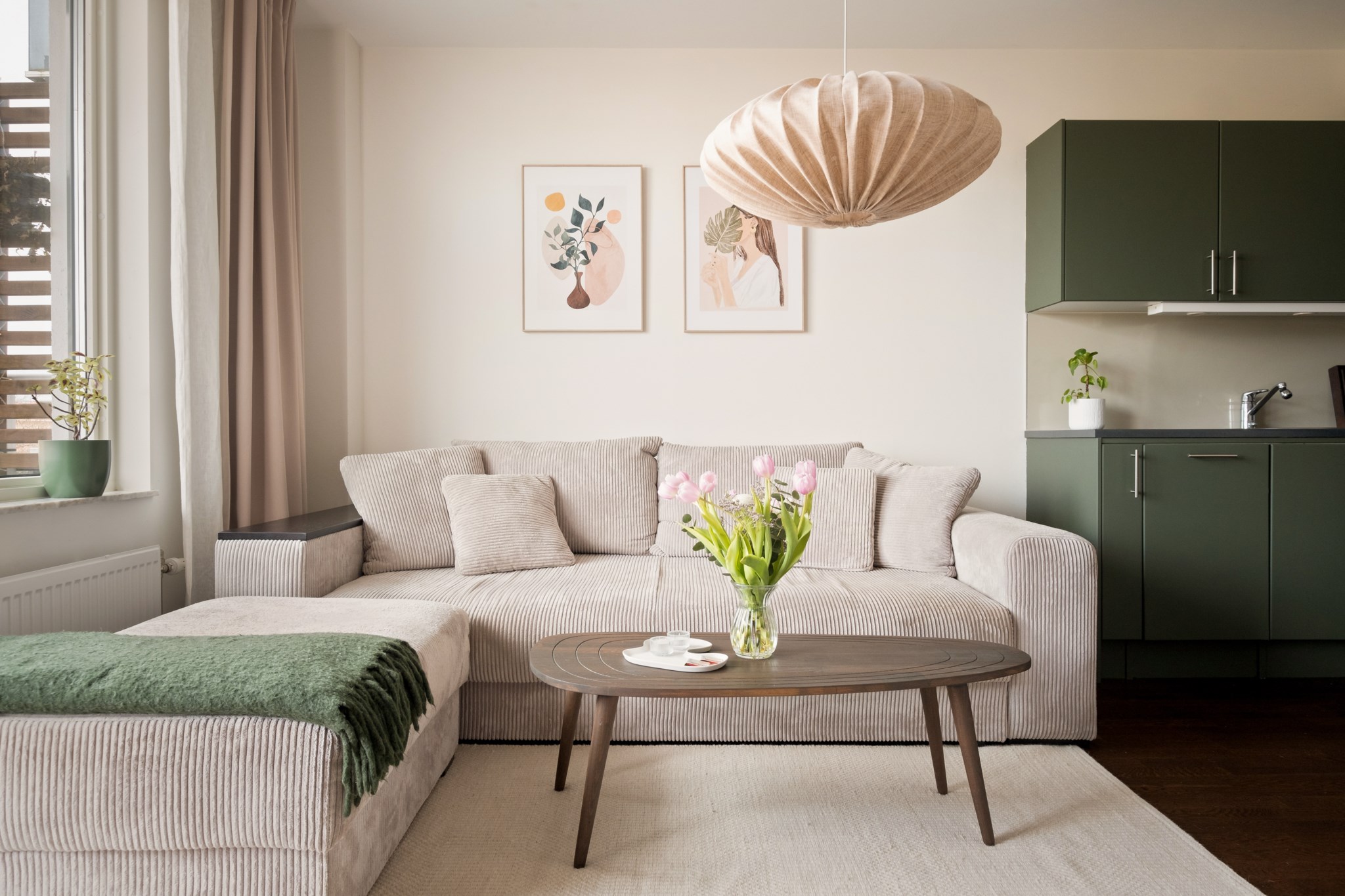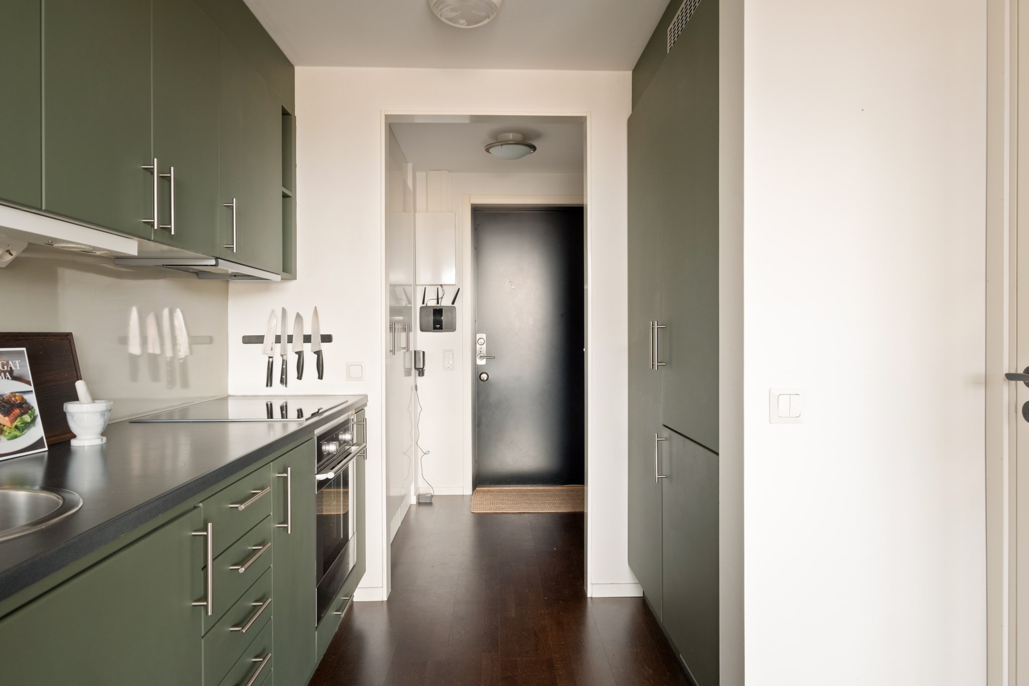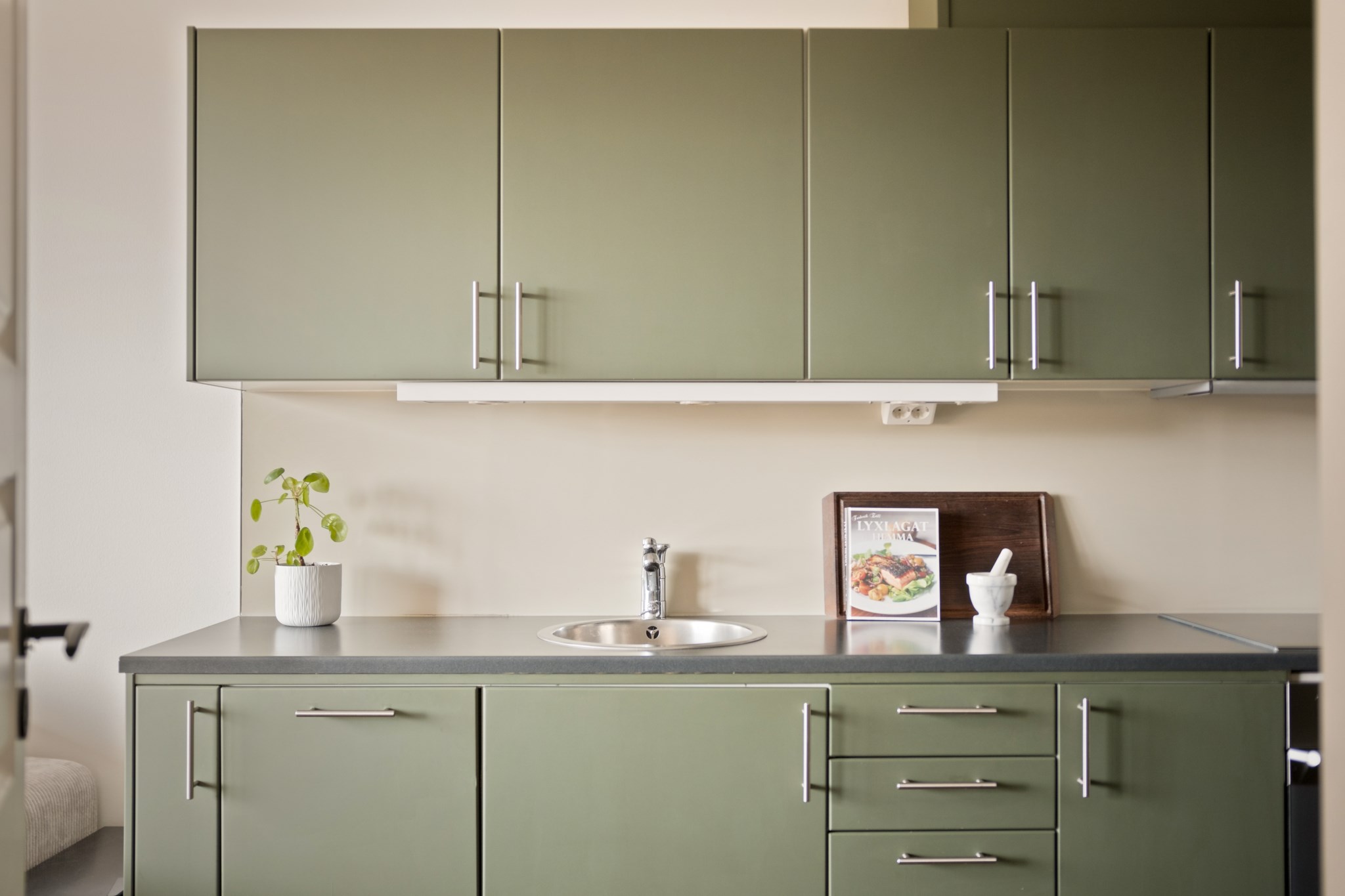 Öppen och social planlösning mellan kök och vardagsrum. Stilrent kök med fina materialval, bra arbetsytor och förvaring. Den maskinella utrustningen består av kyl/frys, diskmaskin, spis och fläkt. Från vardagsrummet nås bostadens underbara balkong med god möblerbar yta. En perfekt plats att njuta av morgonkaffet, läsa en bok i solen eller umgås med vänner under varma sommarkvällar.