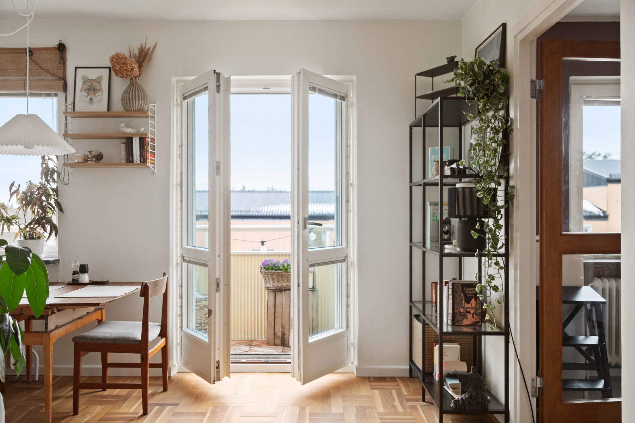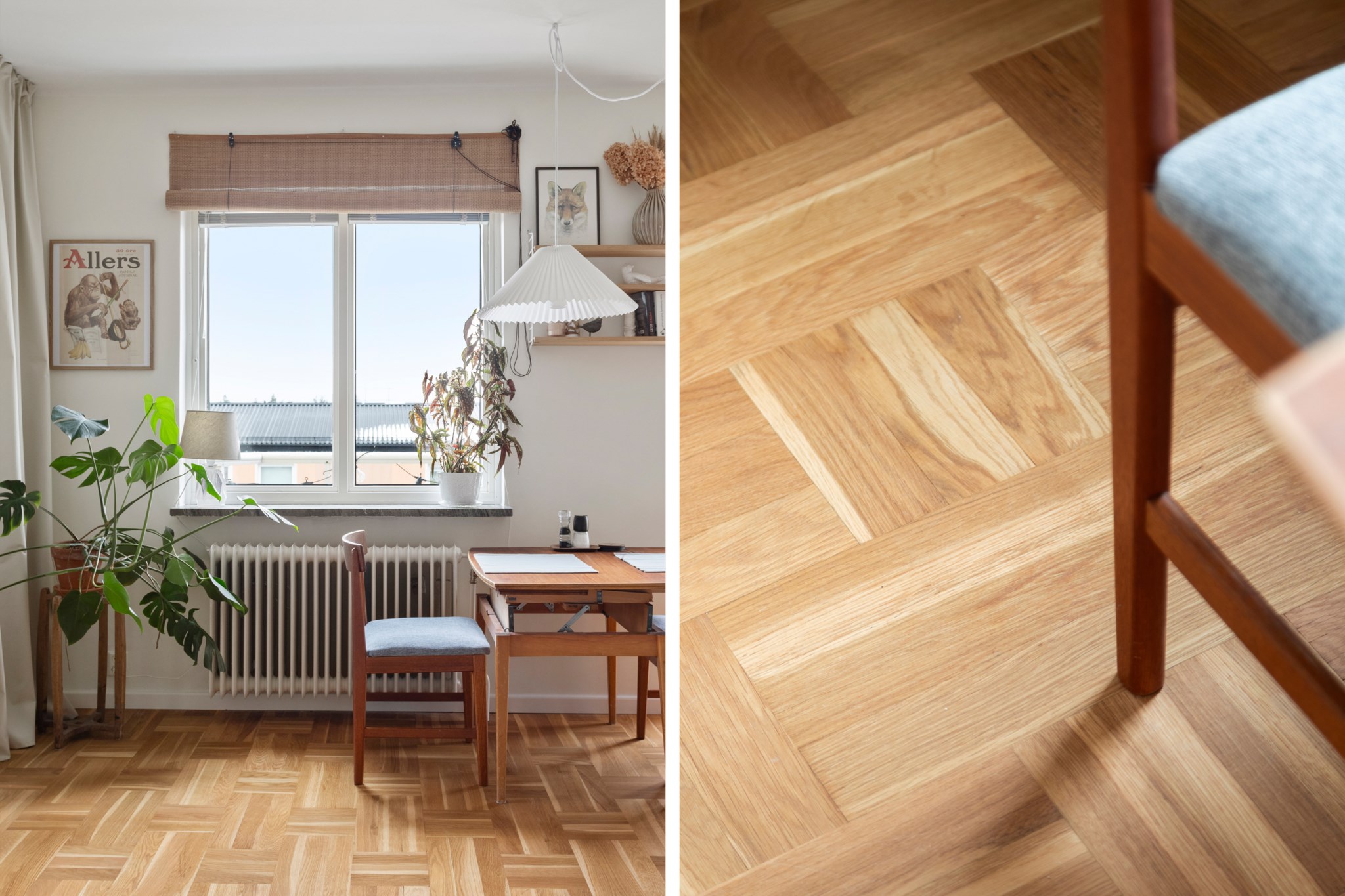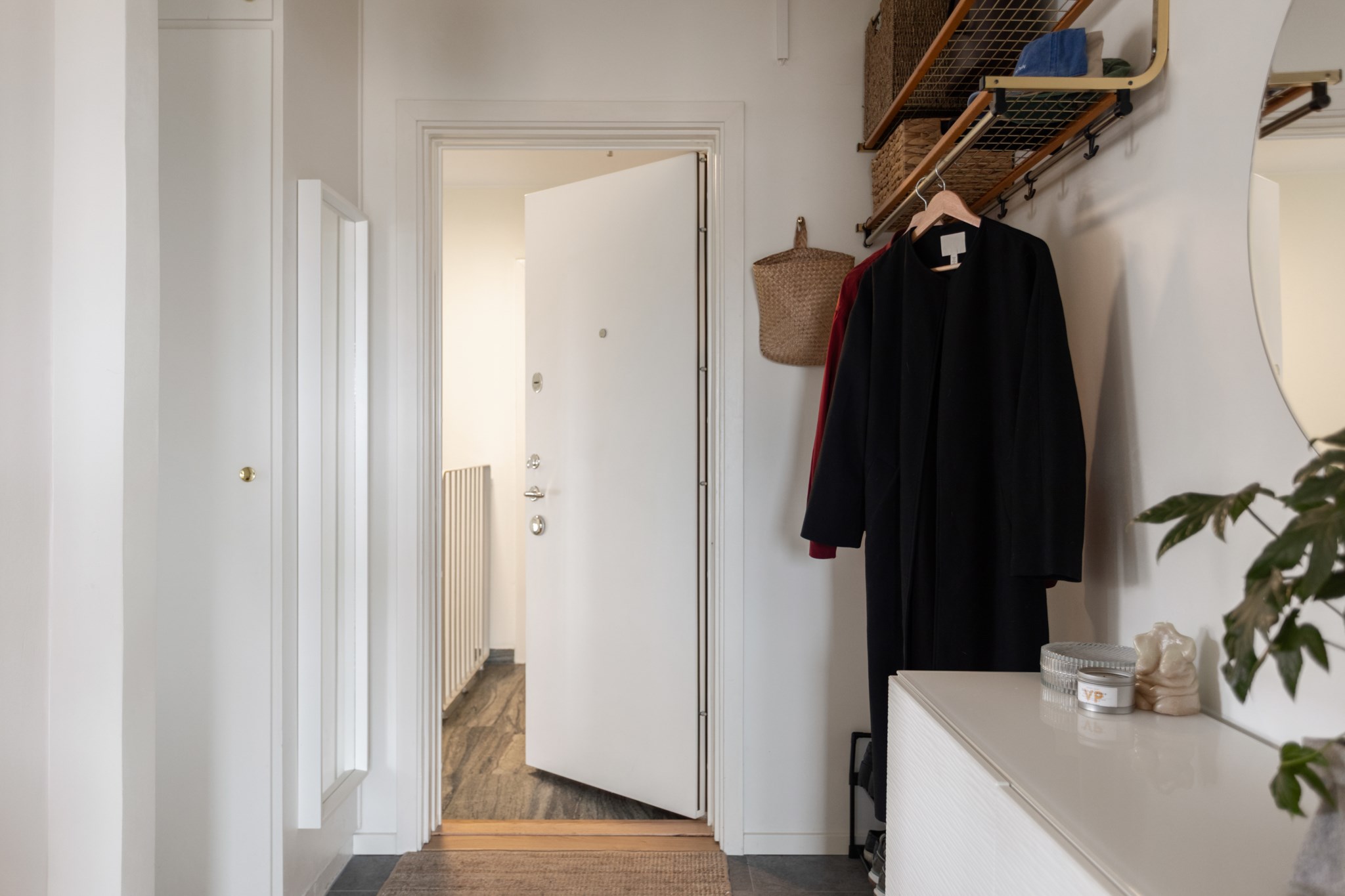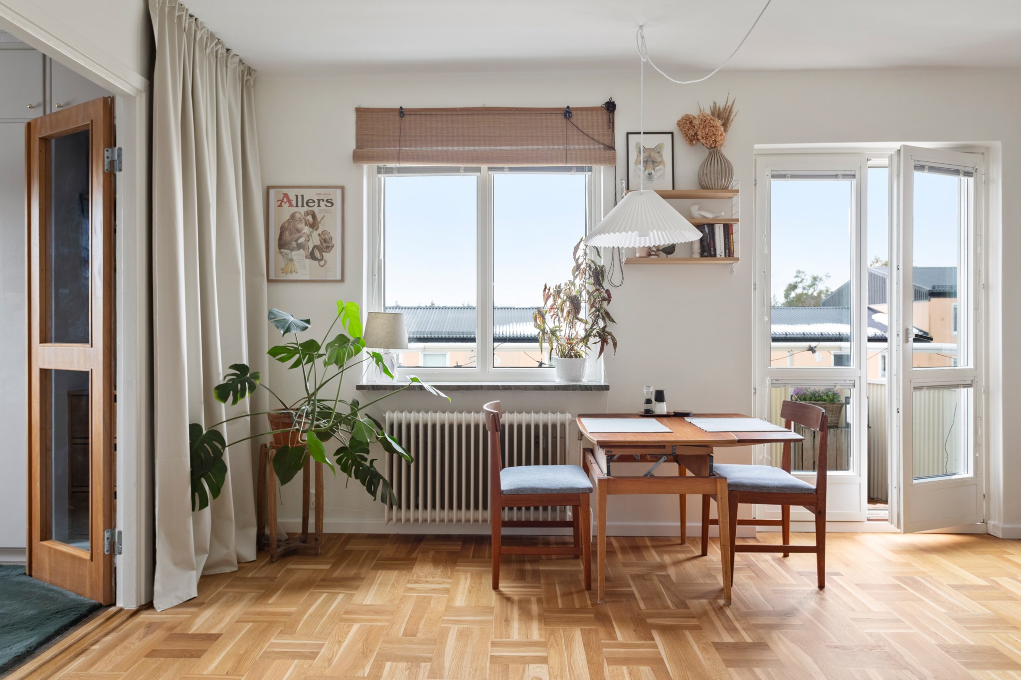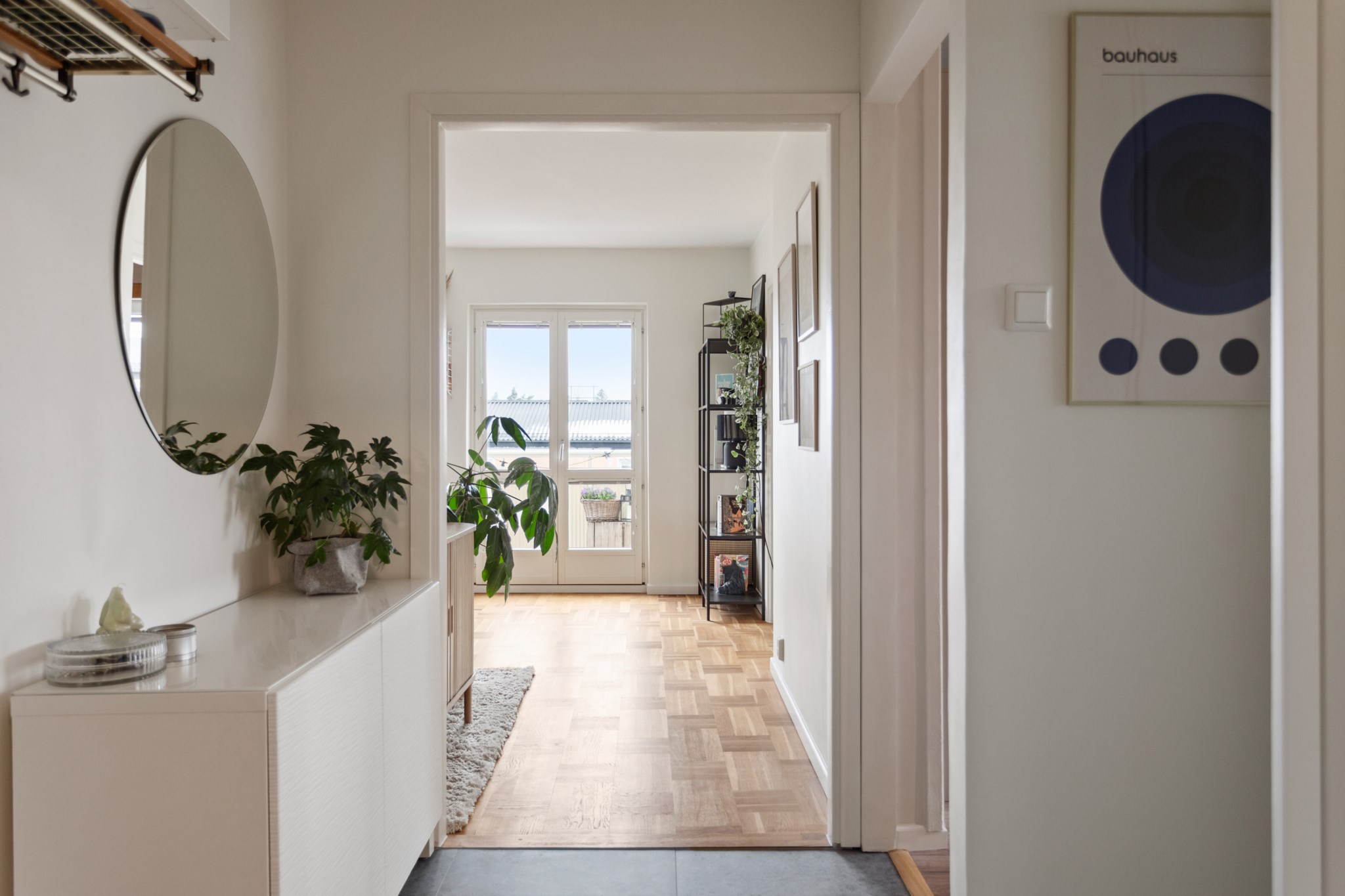 Redan i hallen märks det generösa ljusinsläppet som präglar bostaden. Det vackra parkettgolvet tillför karaktär och tillsammans med ljusa ytskikt skapas en harmonisk bas som ger hemmet ett lugnt och stilrent uttryck. Planlösningen är smart disponerad med en naturlig uppdelning mellan sociala och privata delar – lika funktionell i vardagen som vid middagar och sammankomster.
