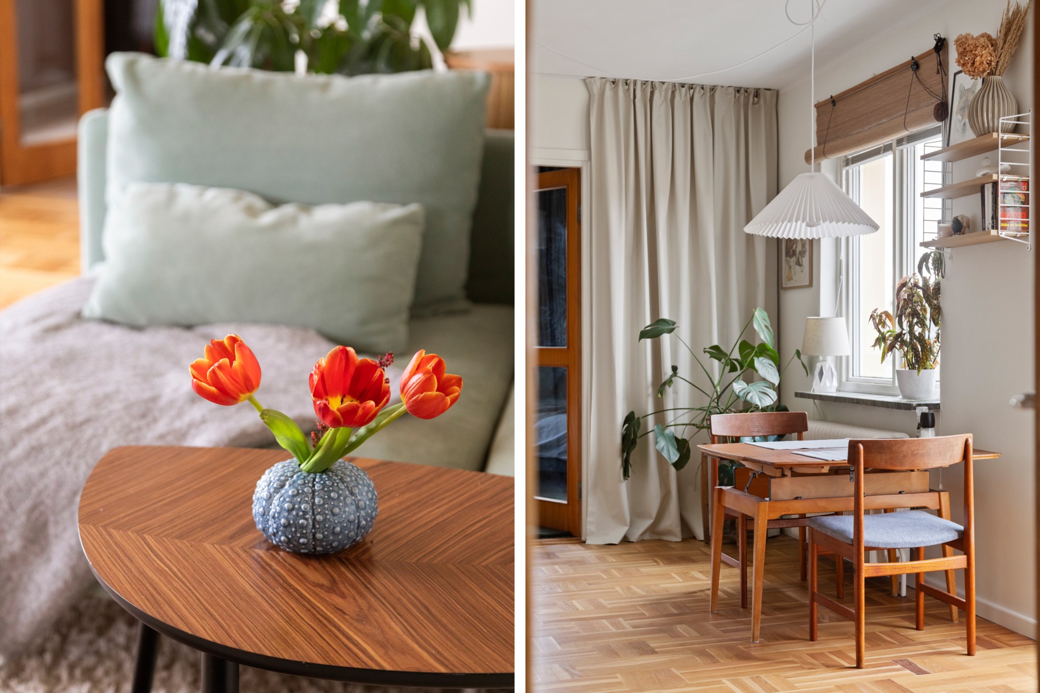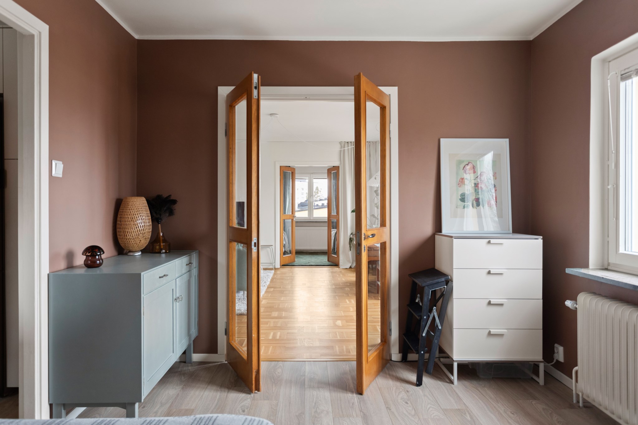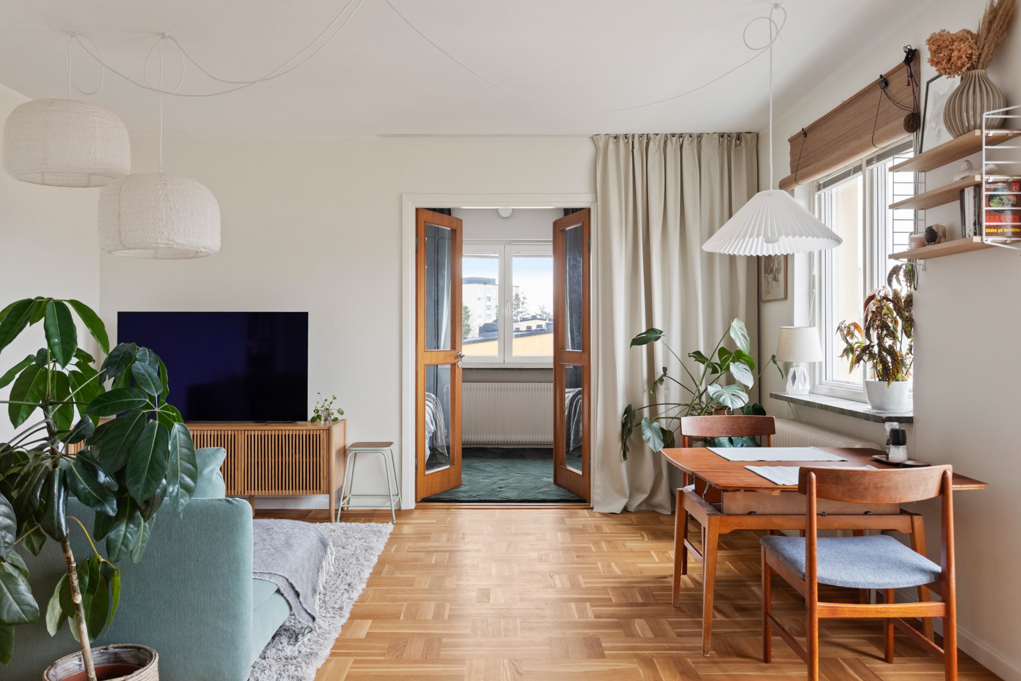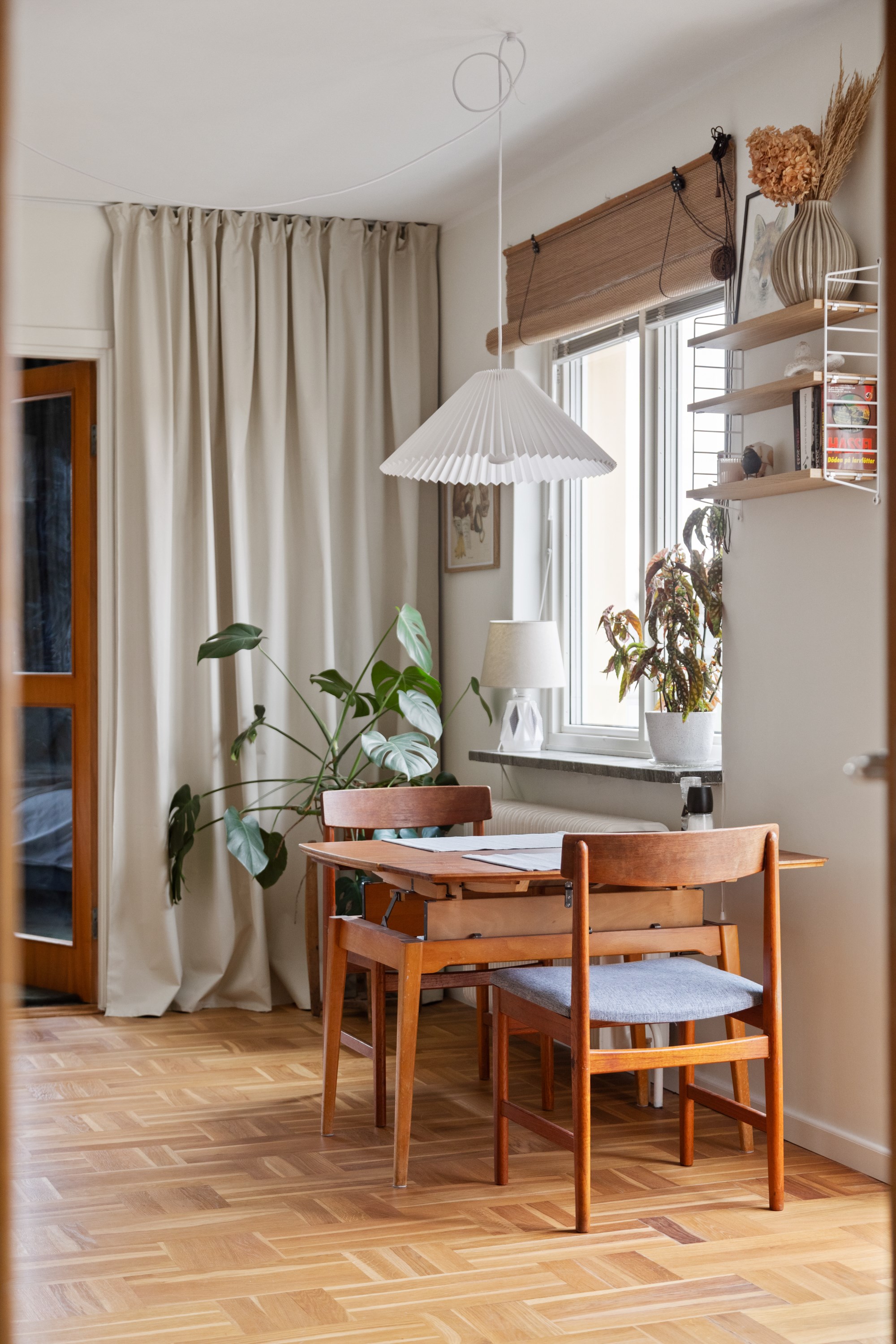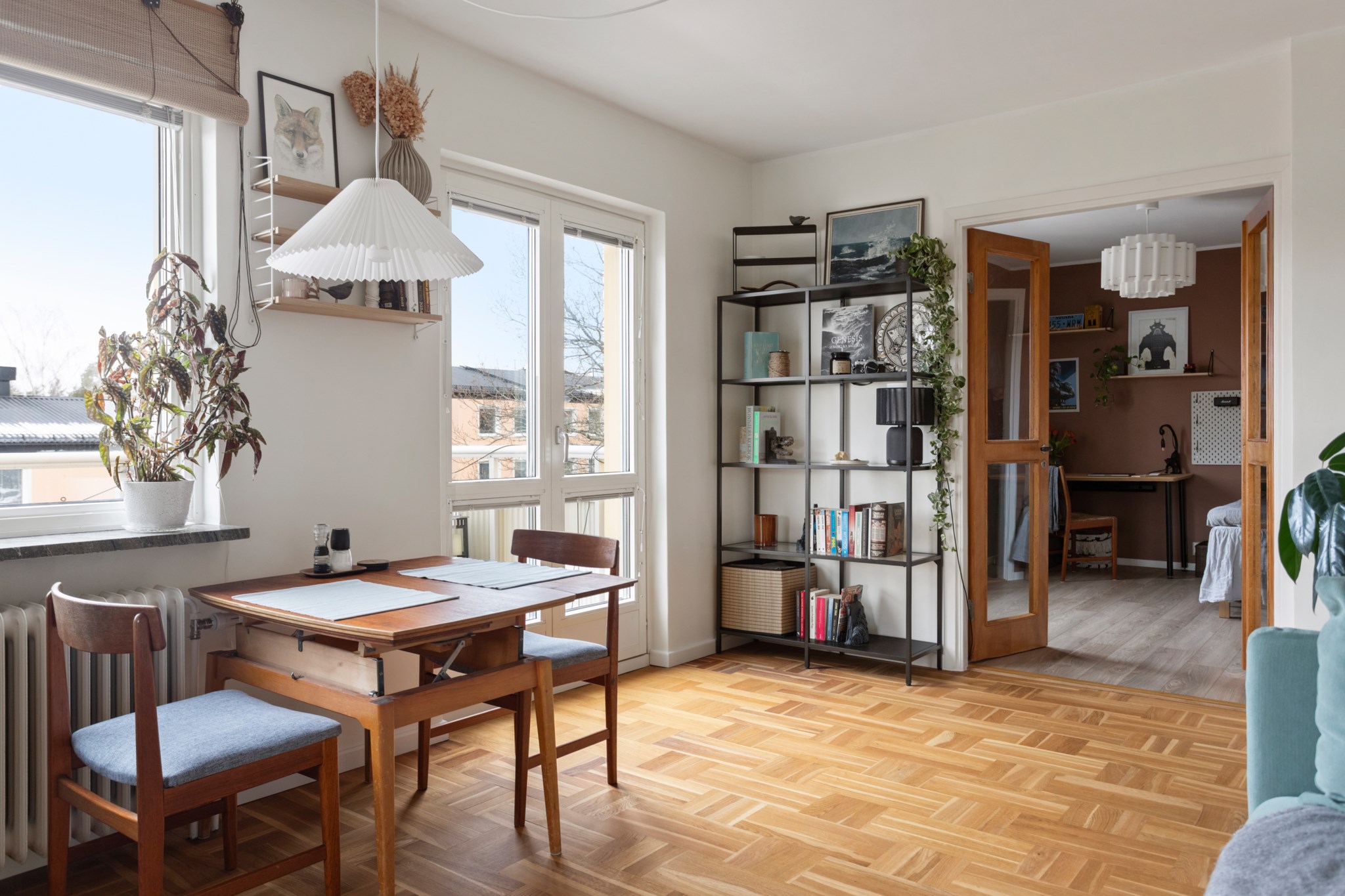 Redan i hallen märks det generösa ljusinsläppet som präglar bostaden. Det vackra parkettgolvet tillför karaktär och tillsammans med ljusa ytskikt skapas en harmonisk bas som ger hemmet ett lugnt och stilrent uttryck. Planlösningen är smart disponerad med en naturlig uppdelning mellan sociala och privata delar – lika funktionell i vardagen som vid middagar och sammankomster.