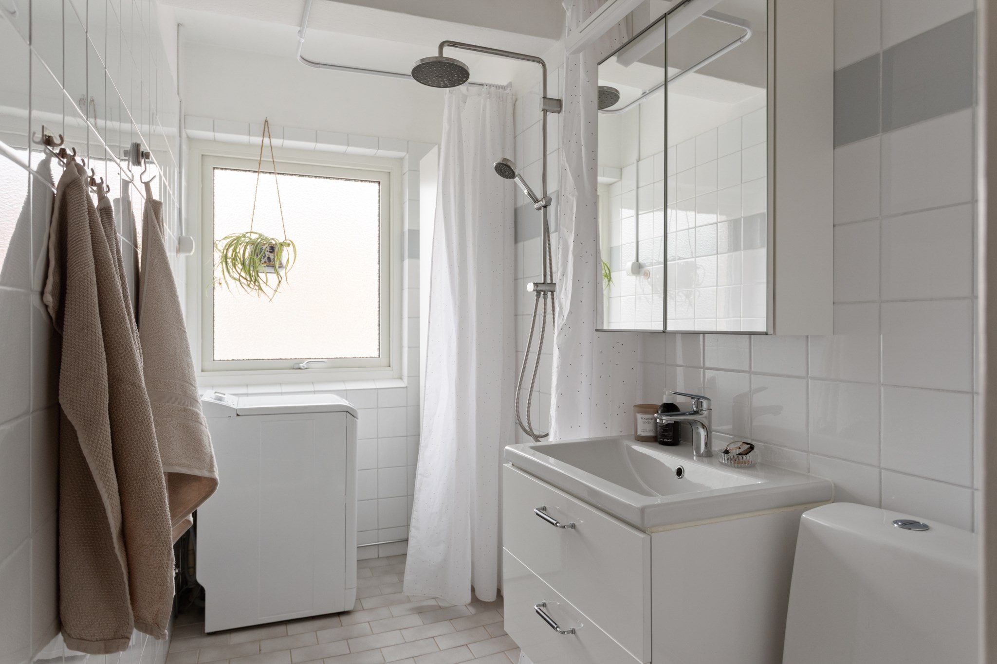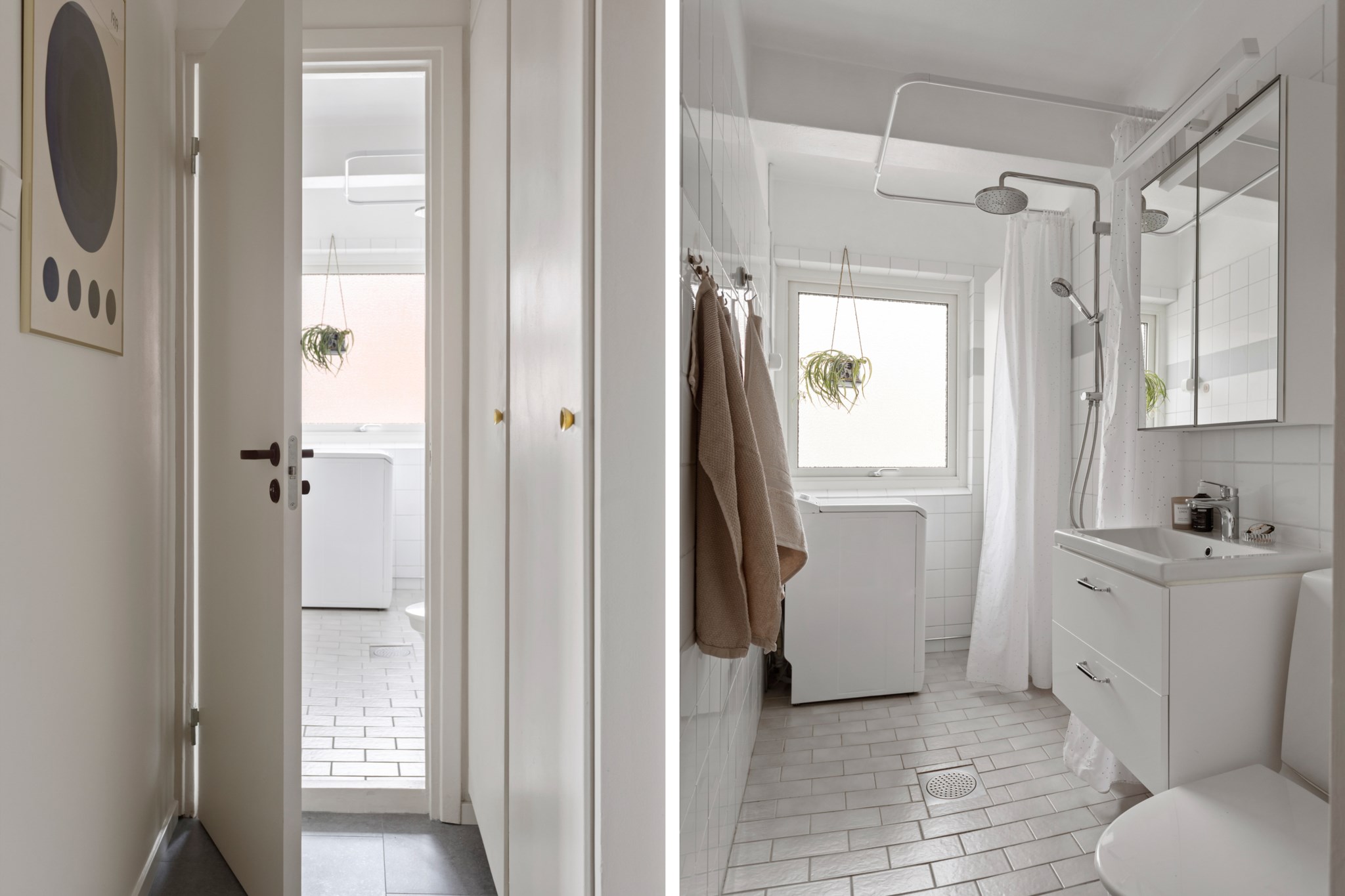 Badrummet är helkaklat i vitt med gråa klinker på golvet, en klassisk och tidlös kombination som skapar en ljus och fräsch känsla. De neutrala tonerna ger en harmonisk bas och gör rummet lätt att trivas i över tid.
