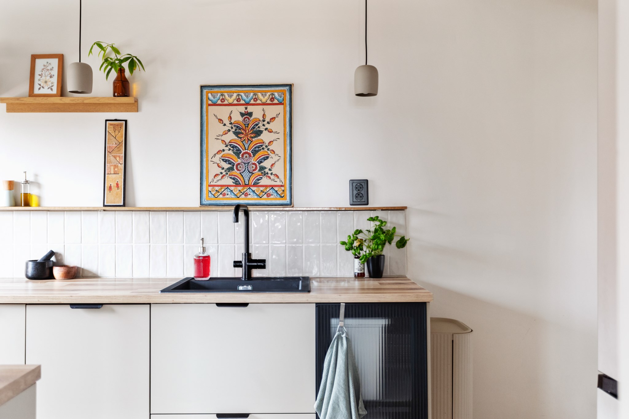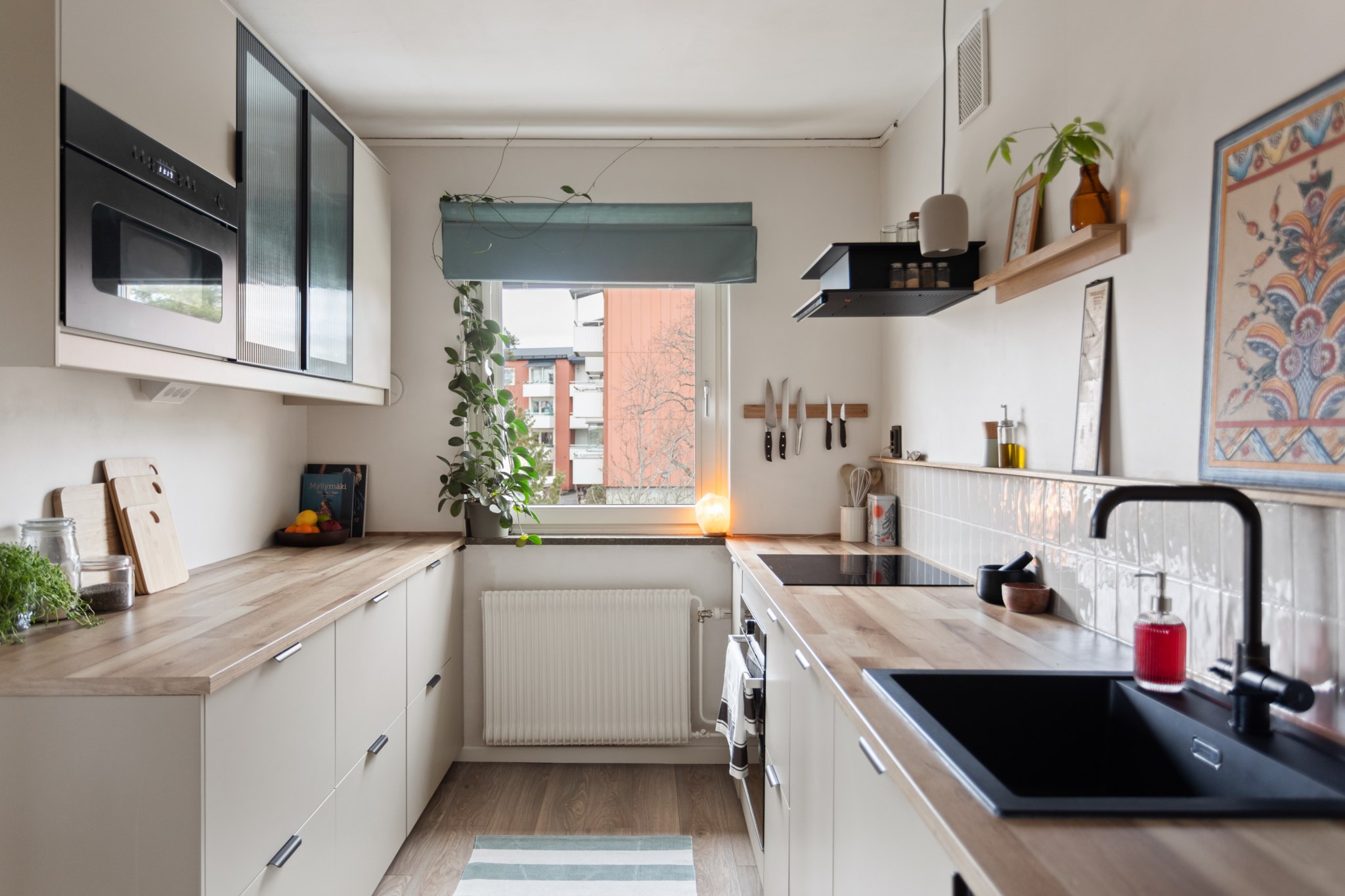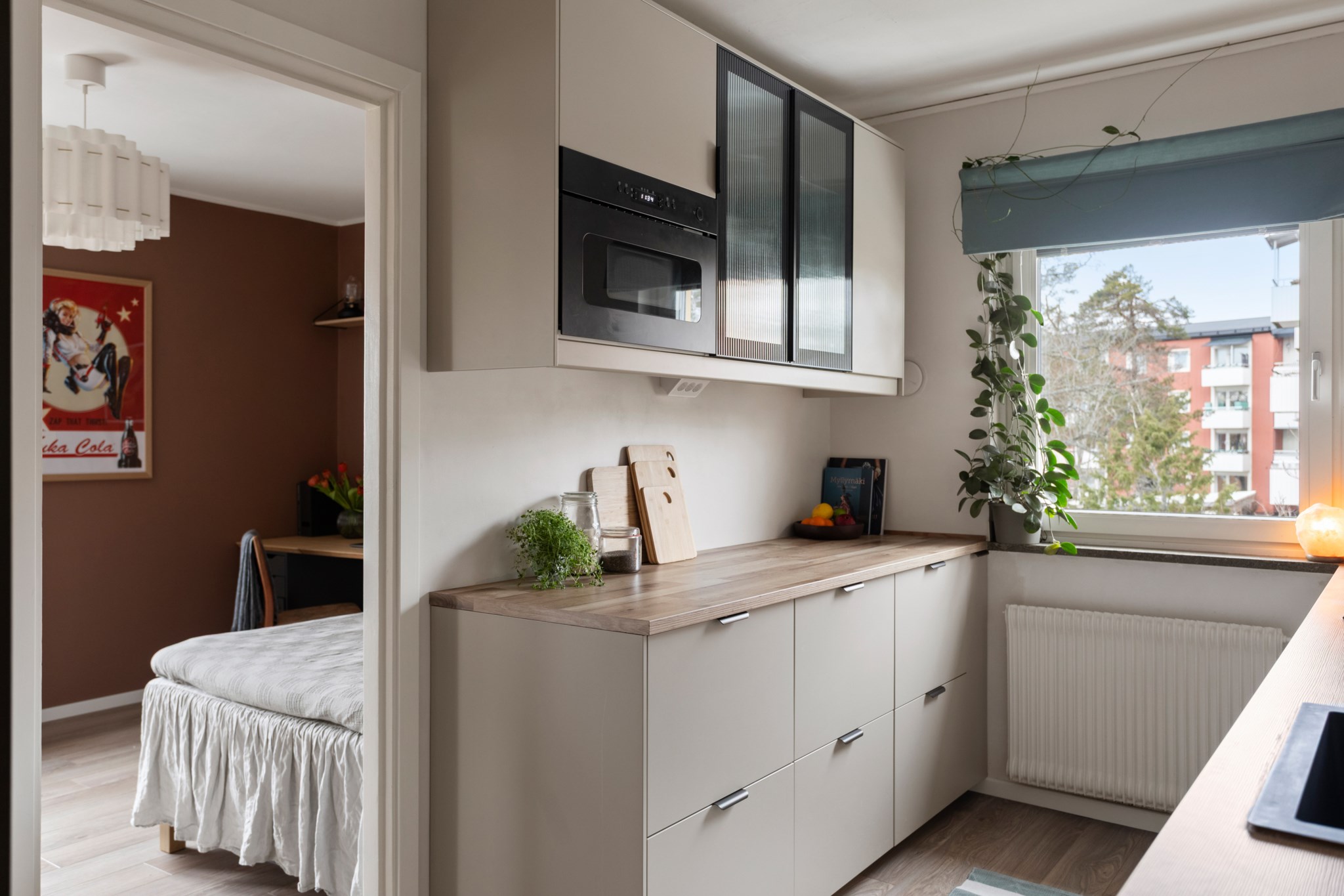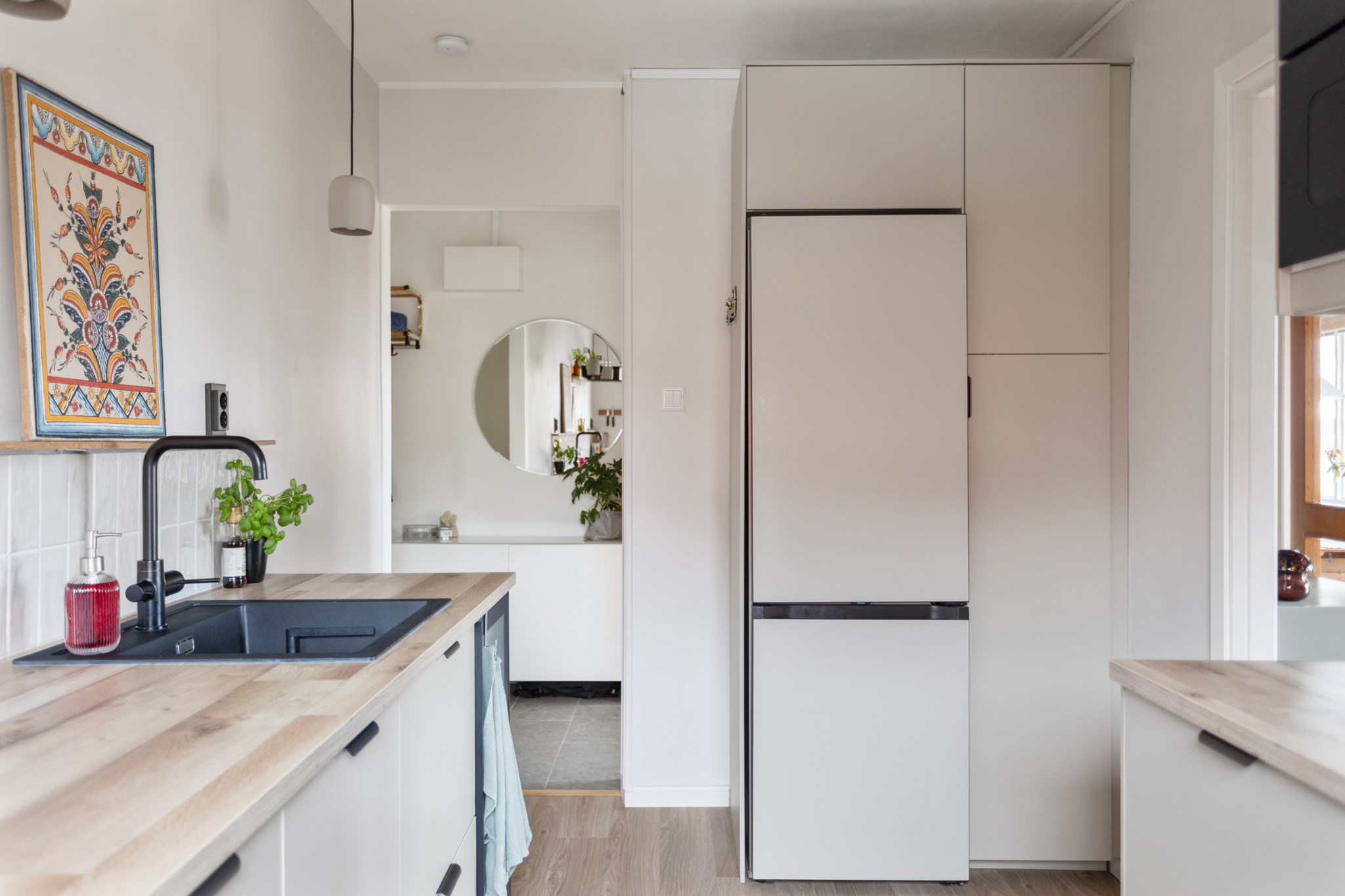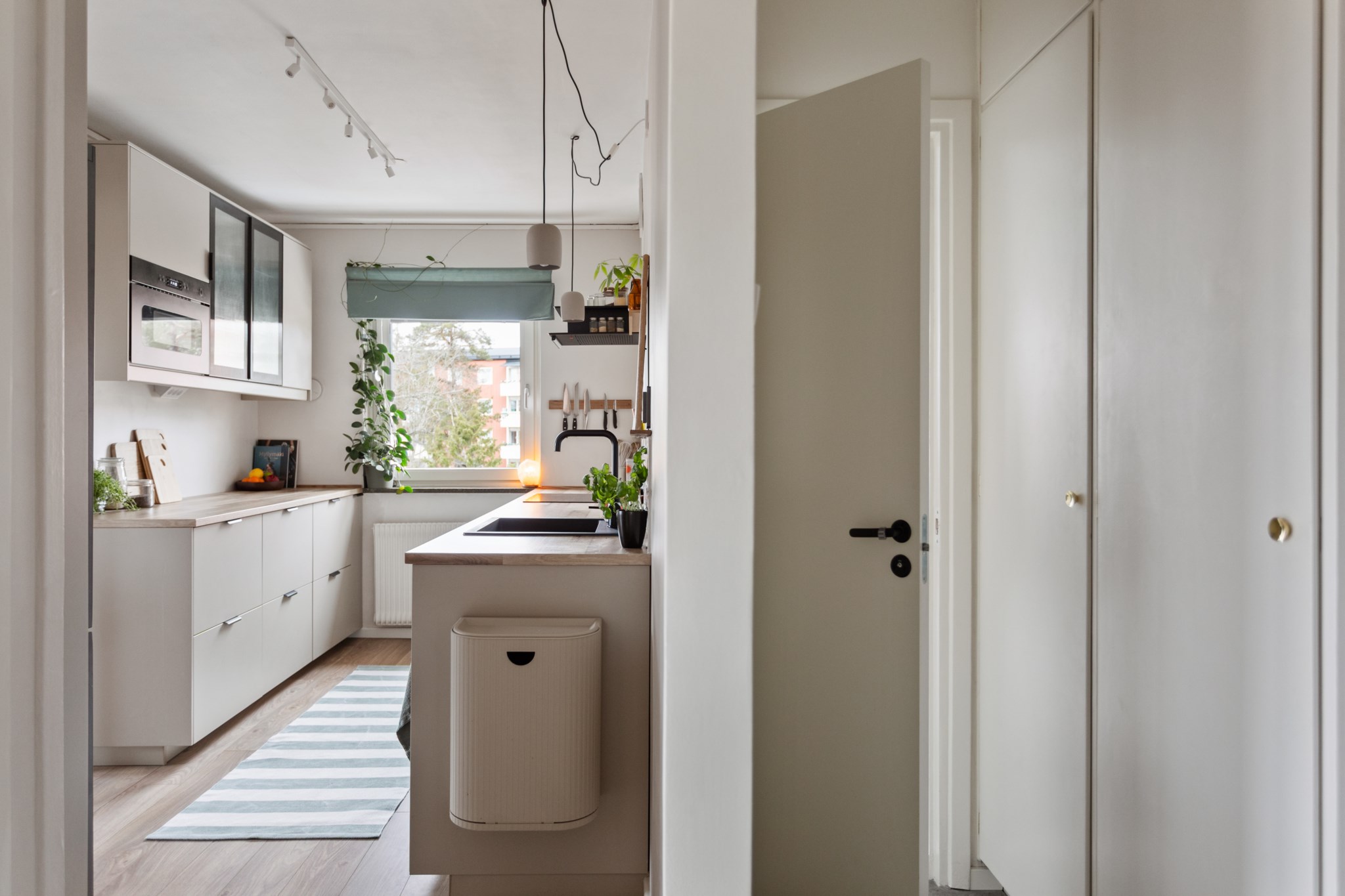 Köket är smakfullt renoverat i en modern och varm stil. Ljusa skåpsluckor kombineras med generösa arbetsytor i trä och stilrena detaljer. Här finns gott om förvaring och en naturlig arbetsgång som gör matlagningen både enkel och inspirerande. Fönstret ger ett fint ljusinsläpp även här och förstärker den luftiga känslan.