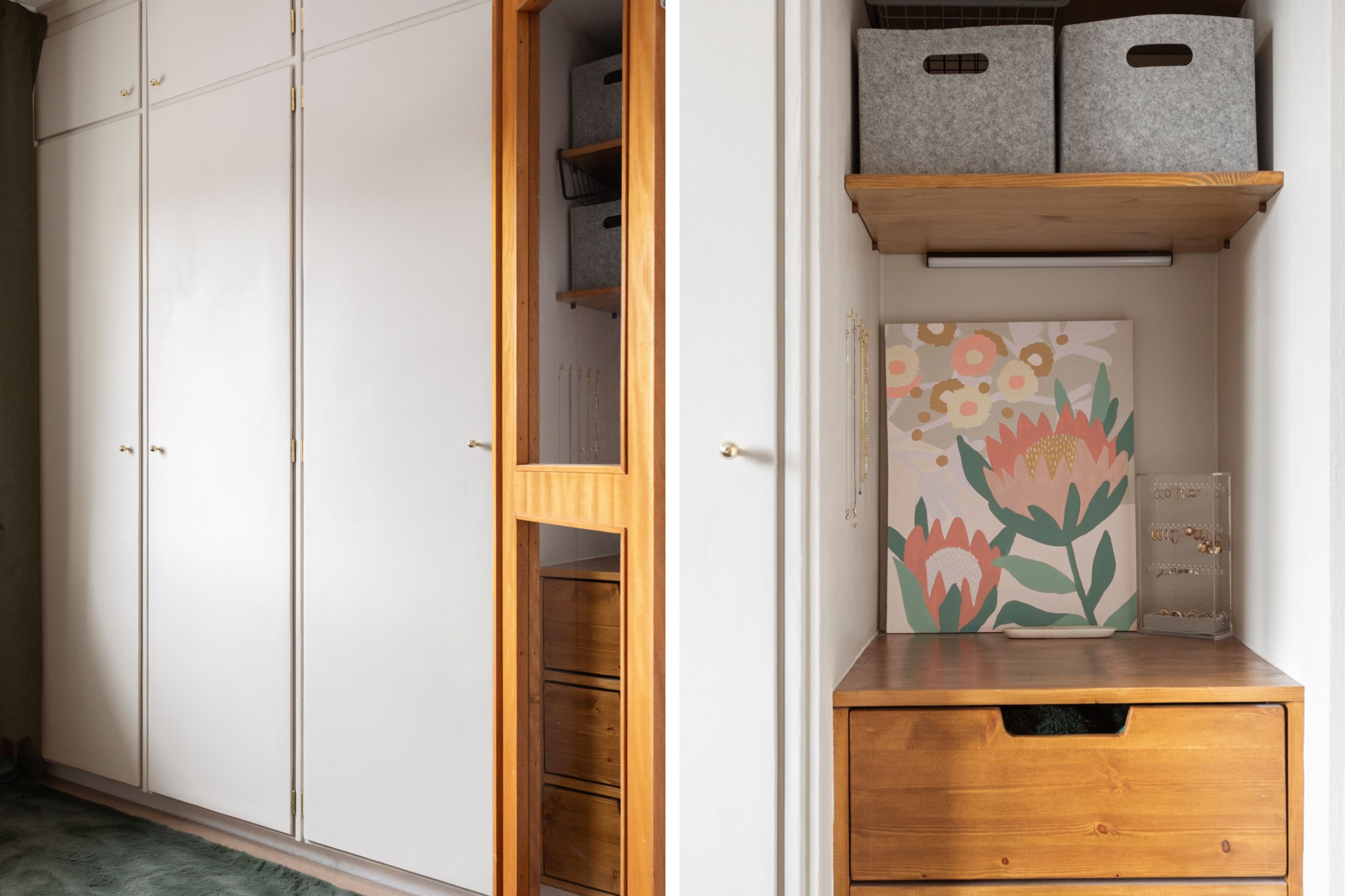 Förvaringsmöjligheterna är goda, med plats för större garderobslösning eller platsbyggd förvaring för den som önskar. Ett sovrum som kombinerar funktion och estetik – luftigt, stillsamt och inbjudande.