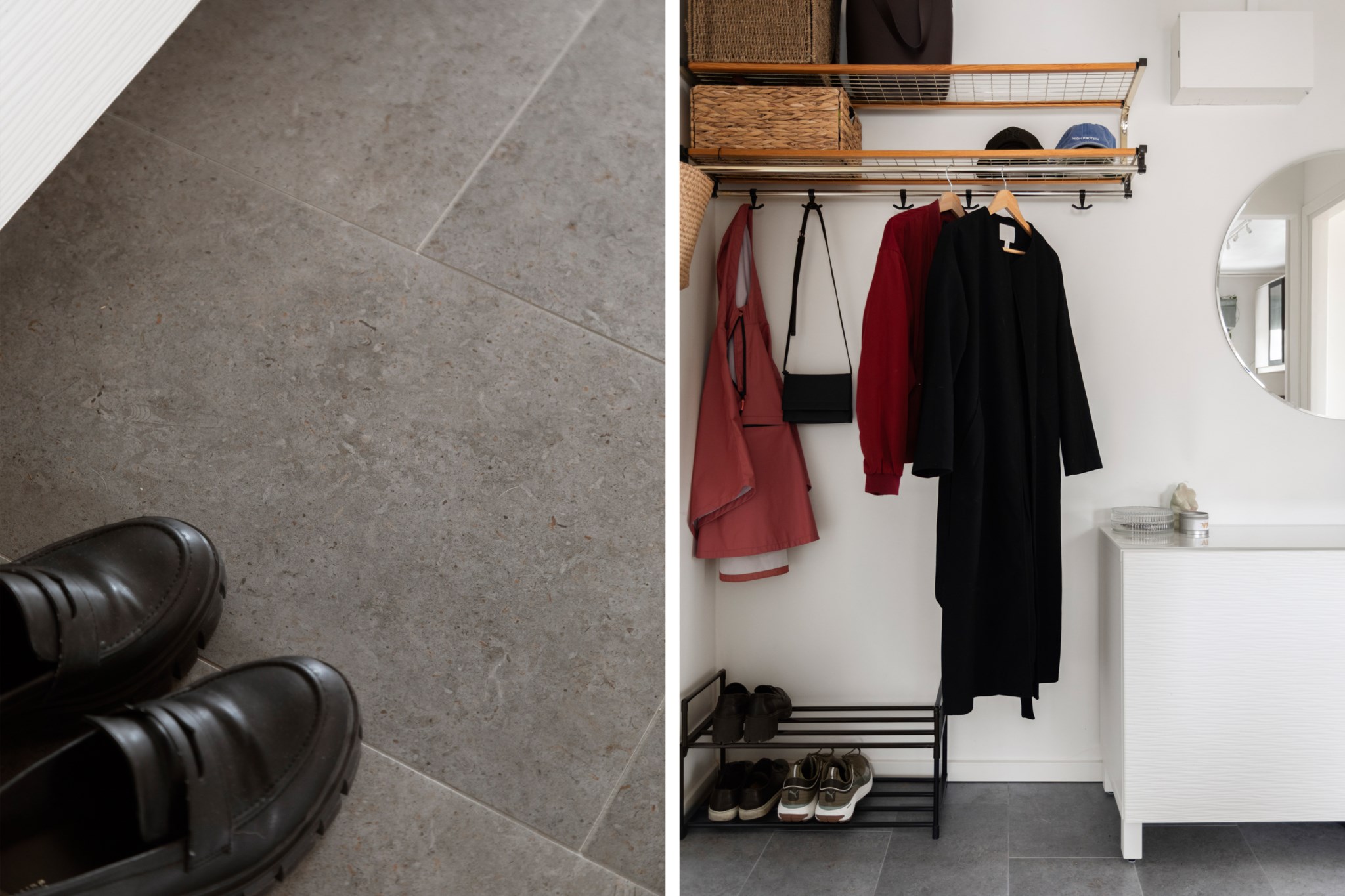 Välkomnande och kvadratmetersmart hall med goda avhängningsmöjligheter. Här finns plats för både hatthylla och byrå utan att det känns trångt. Golvet pryds av stilrena grå klinkers – både praktiskt och lättskött, perfekt under årets blötare dagar.
