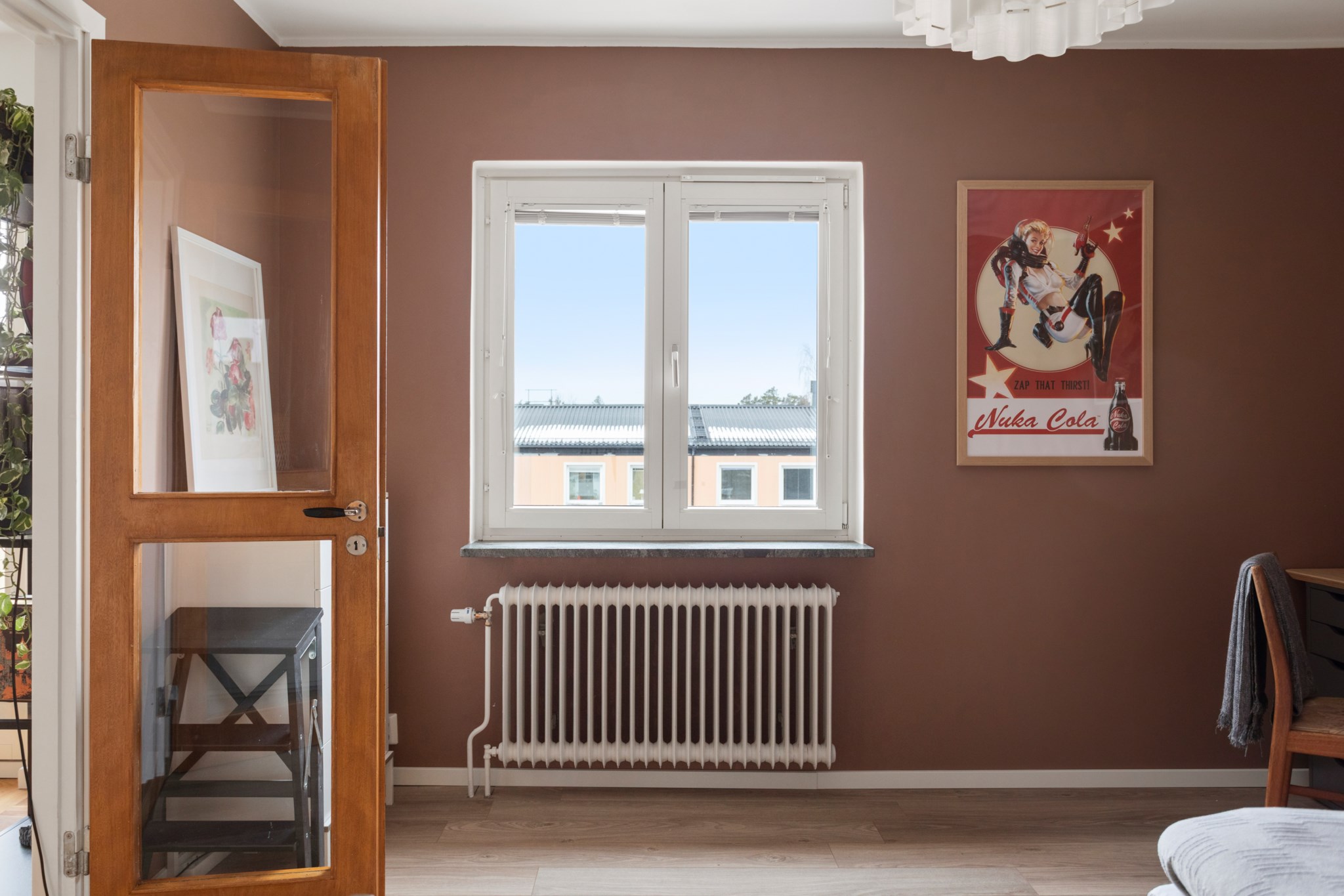 Vardagsrummet är generöst och lättmöblerat med plats för både matgrupp och soffdel. De stora fönsterpartierna suddar nästan ut gränsen mellan inne och ute och leder vidare till den trivsamma balkongen – en naturlig förlängning av bostaden under årets varmare månader. Här kan du starta dagen med morgonkaffe i solen eller avrunda kvällen i en lugn och ombonad miljö.