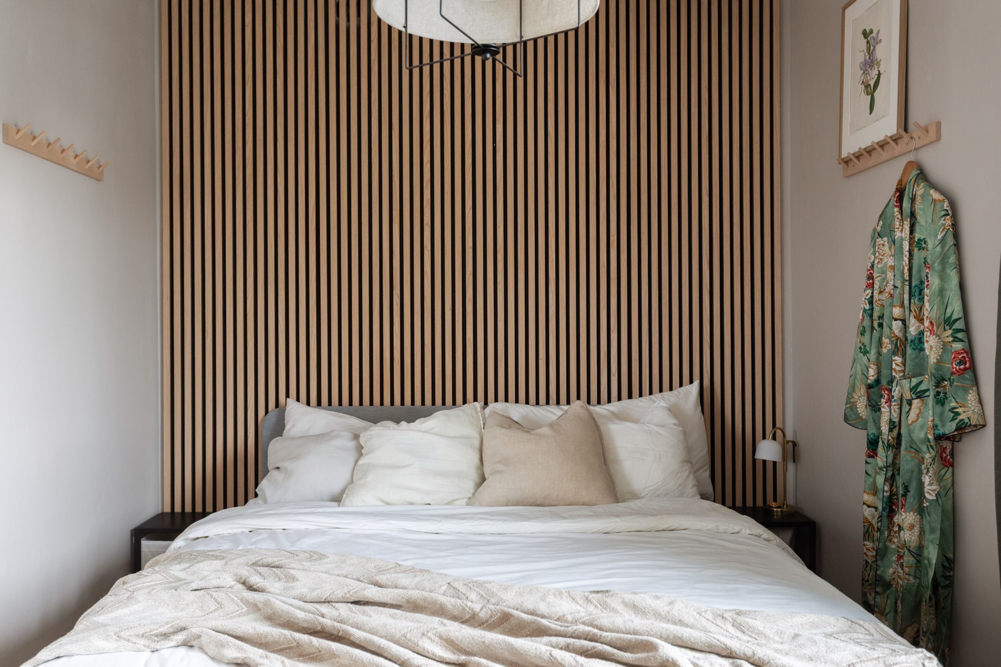 Det större sovrummet är en lugn och harmonisk plats att dra sig tillbaka till. Väggarna går i mjuka, behagliga toner som tillsammans med det fina ljusinsläppet skapar en varm och avkopplande atmosfär. Här ryms enkelt en dubbelsäng med tillhörande sängbord utan att kompromissa med rymden i rummet.