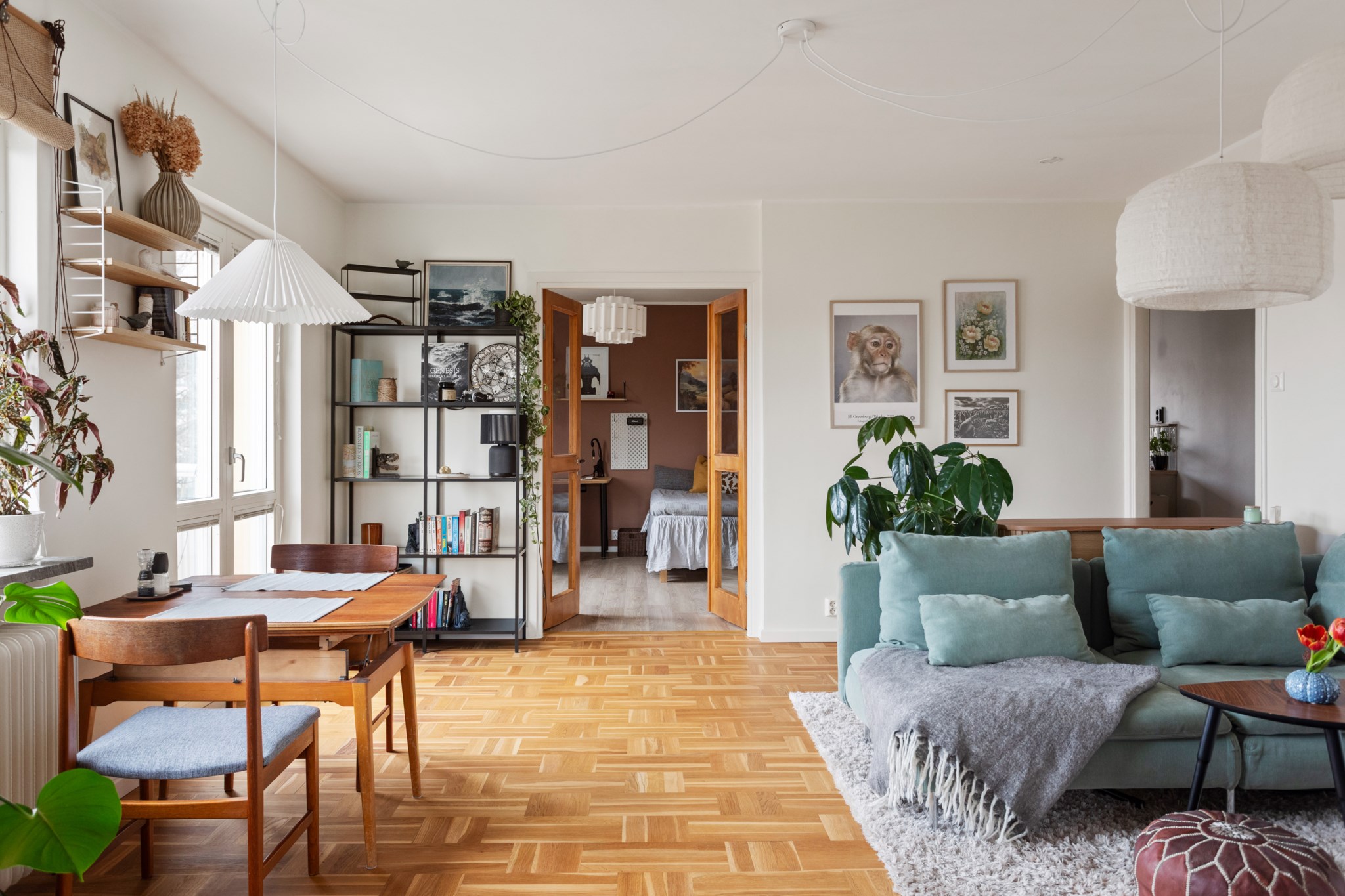 Redan vid första steget in möts du av ett fint ljusflöde som löper genom bostaden. Det vackra parkettgolvet ger karaktär och tillsammans med ljusa väggar skapas en lugn bas som låter inredningen ta plats. Planlösningen är väl genomtänkt med en tydlig uppdelning mellan sociala ytor och privata rum – perfekt för såväl vardagsliv som sociala tillställningar.