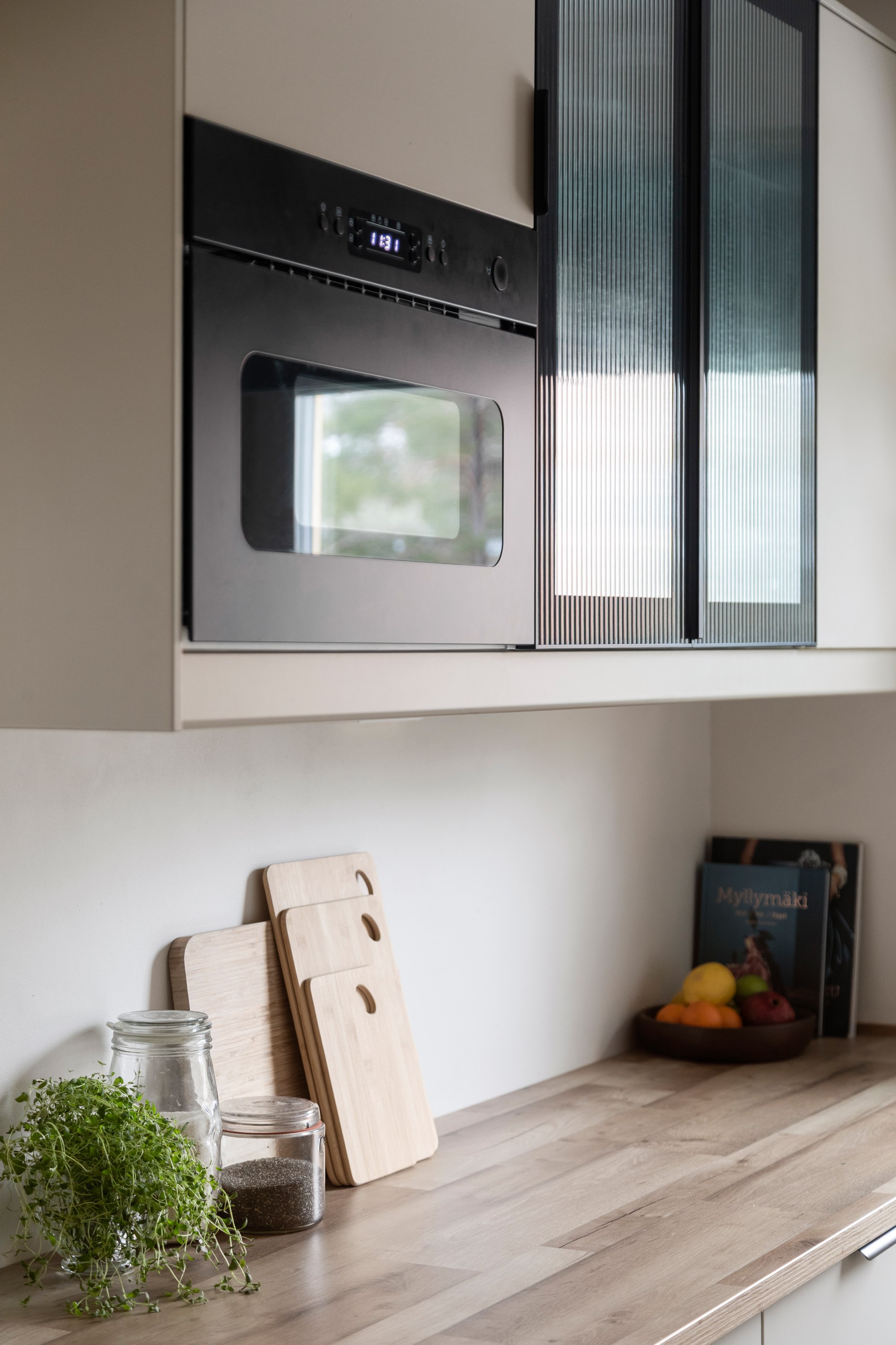 Köket är stilrent och funktionellt med gott om arbetsytor och förvaring. Materialvalen skapar en varm och modern känsla, samtidigt som planeringen gör köket praktiskt för både vardagsmatlagning och middagar med vänner.