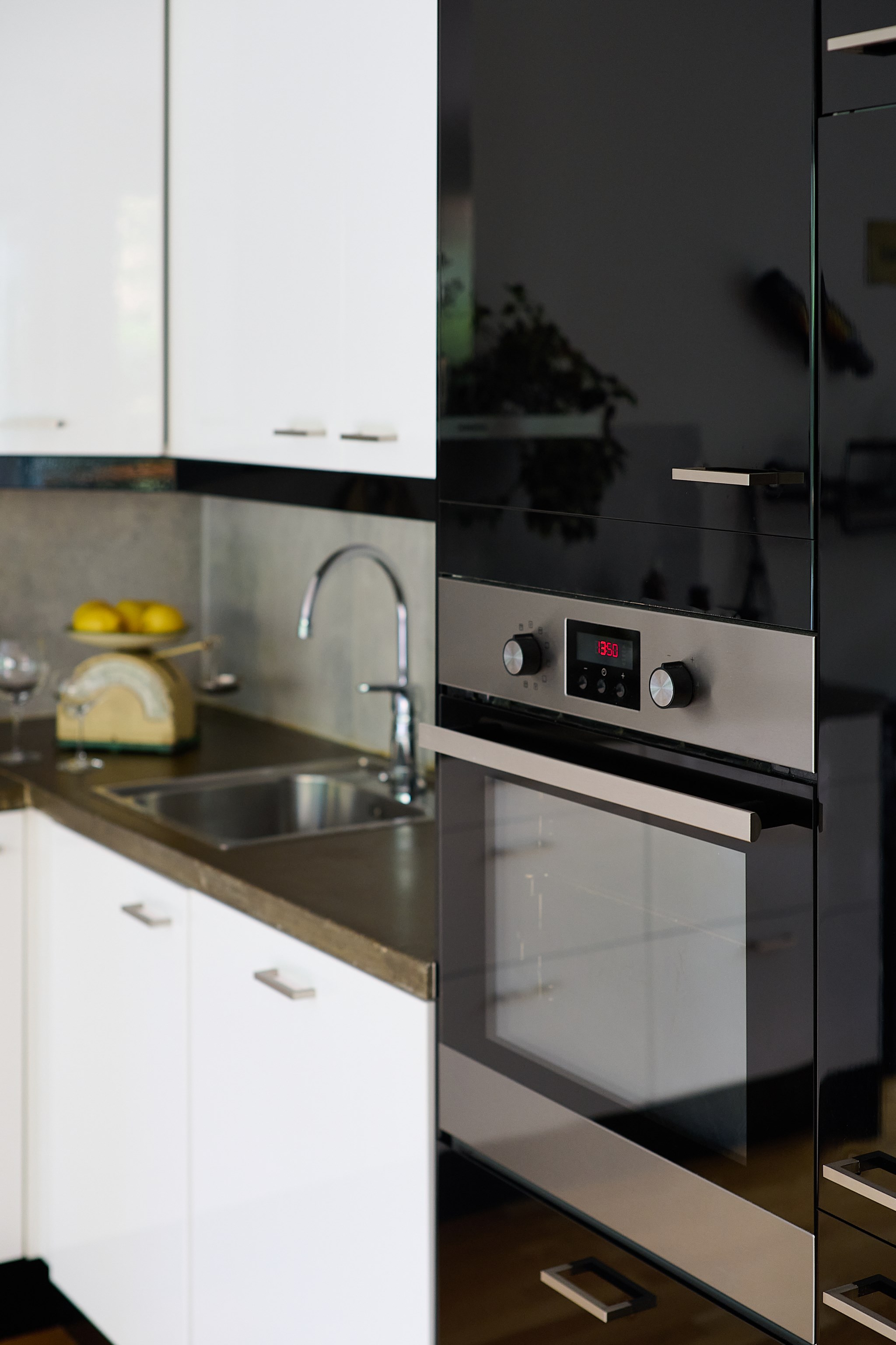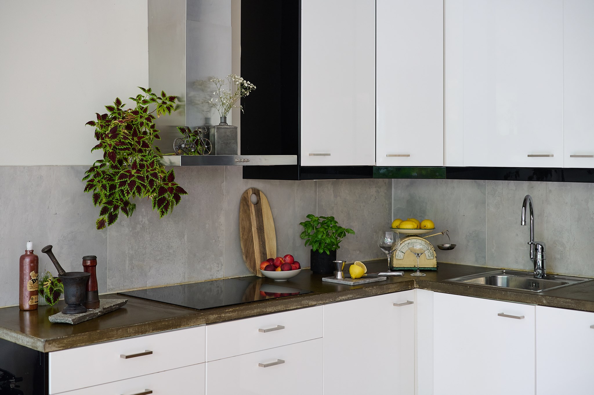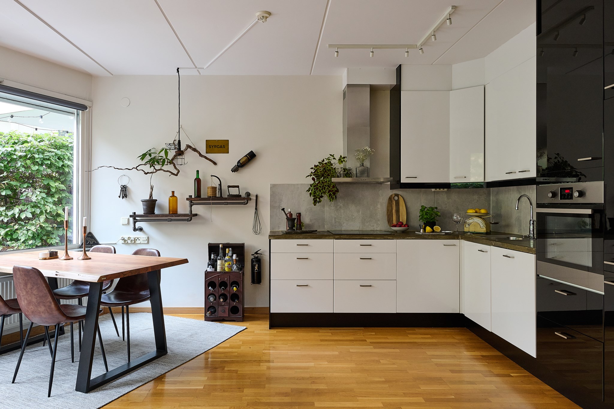 L-format kök med bra förvaring bakom vita och svarta luckor. Gedigen arbetsbänk på betongskiva med stänkskydd i grått kakel ovan. Köket är utrustat med kombinerad kyl/frys, ugn i arbetshöjd, diskmaskin, spishäll och spisfläkt. Intill köket finns en naturlig plats för matbord och stolar inför vackert fönsterparti.