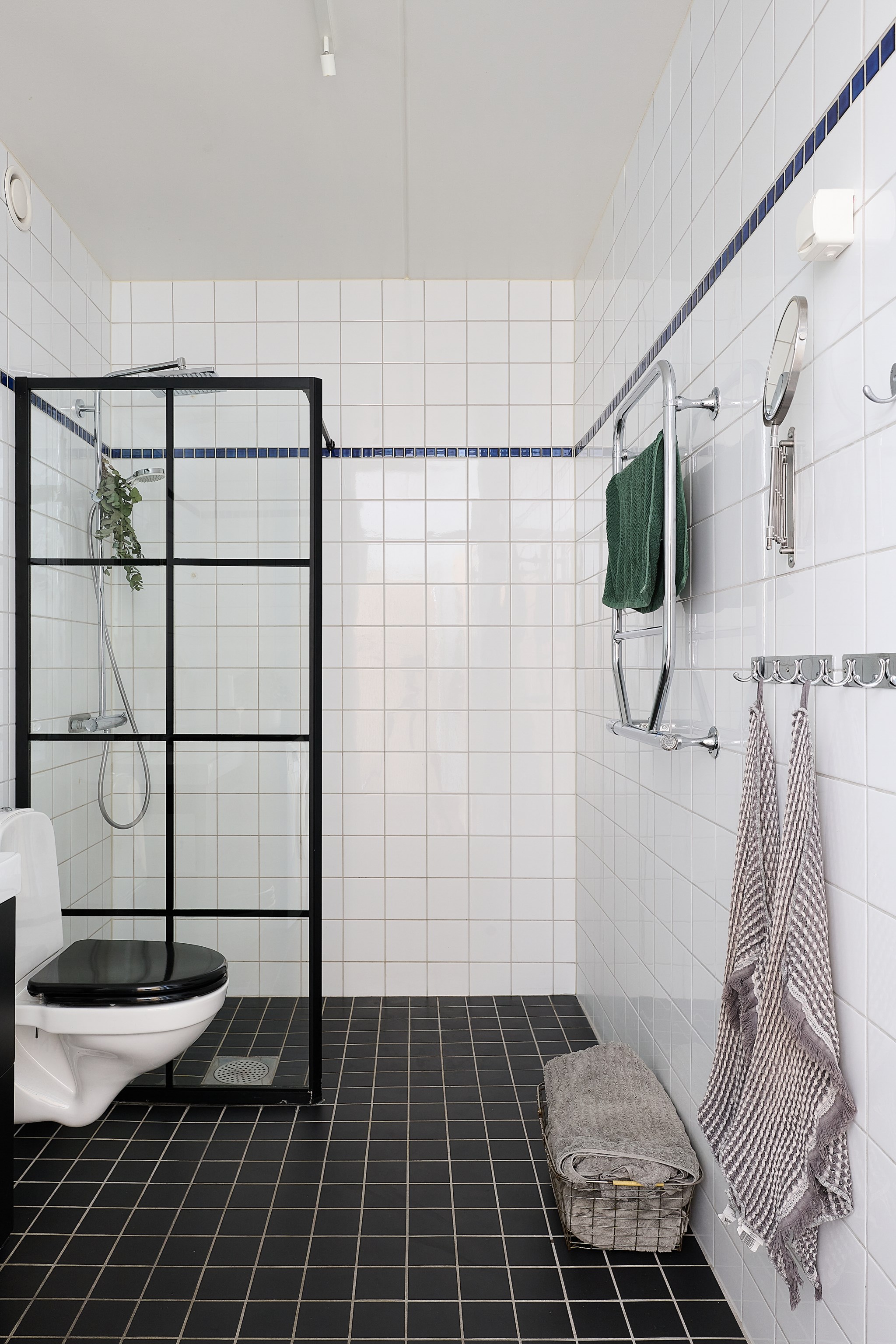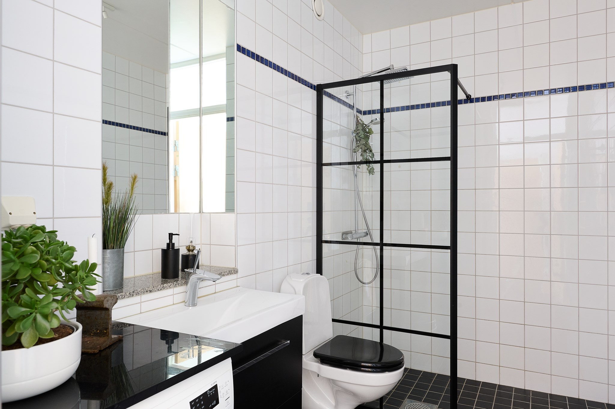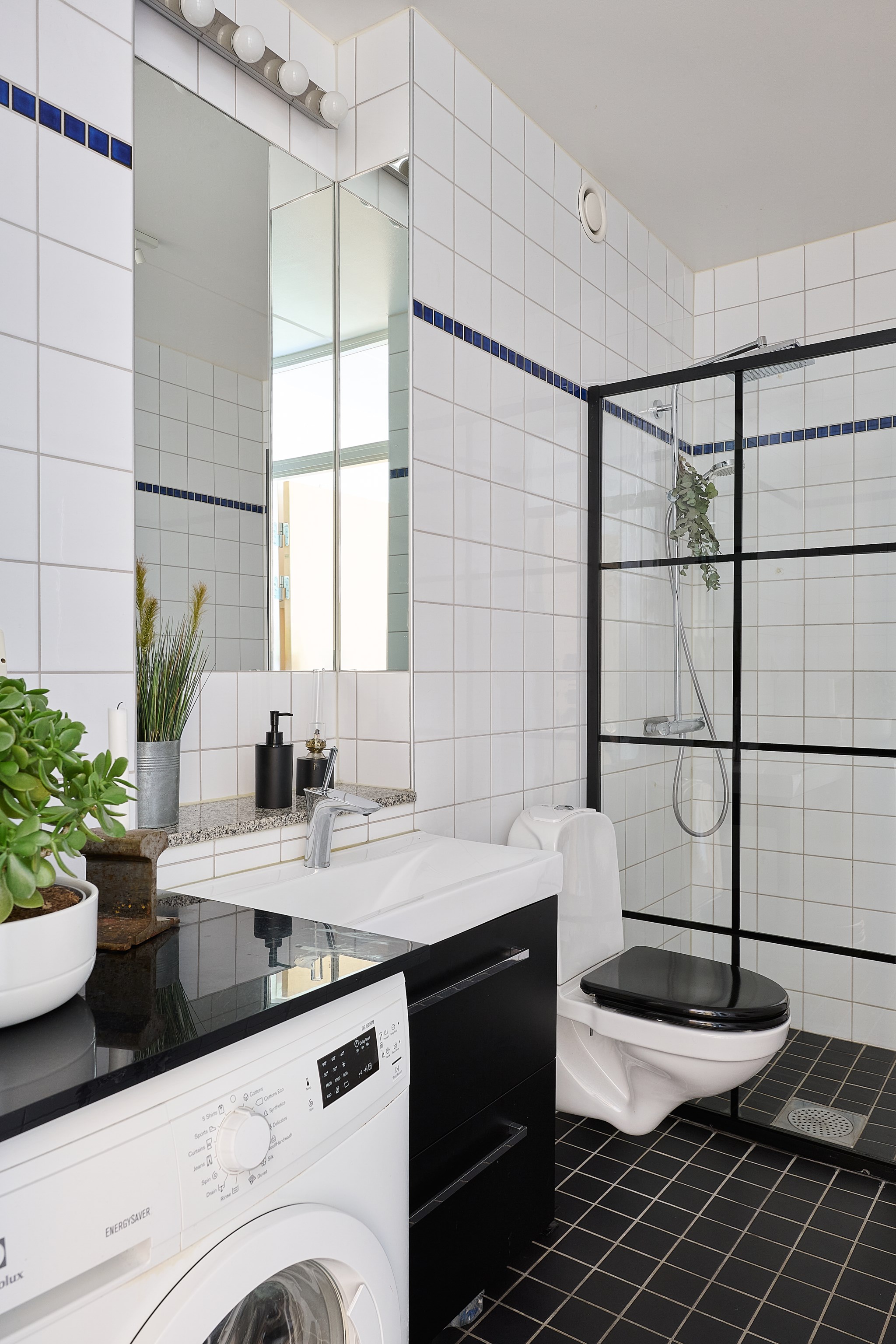 Stilrent badrum med vitkaklade väggar med bord i blå mosaik samt svart klinkergolv med golvvärme. Badrummet är utrustat med kombinerad tvättmaskin/torktumlare med arbetsyta ovan, inkaklad spegel i nisch med avställningsyta i sten, tvättställ med kommod, wc samt dusch med takdusch och duschvägg i industriglas.