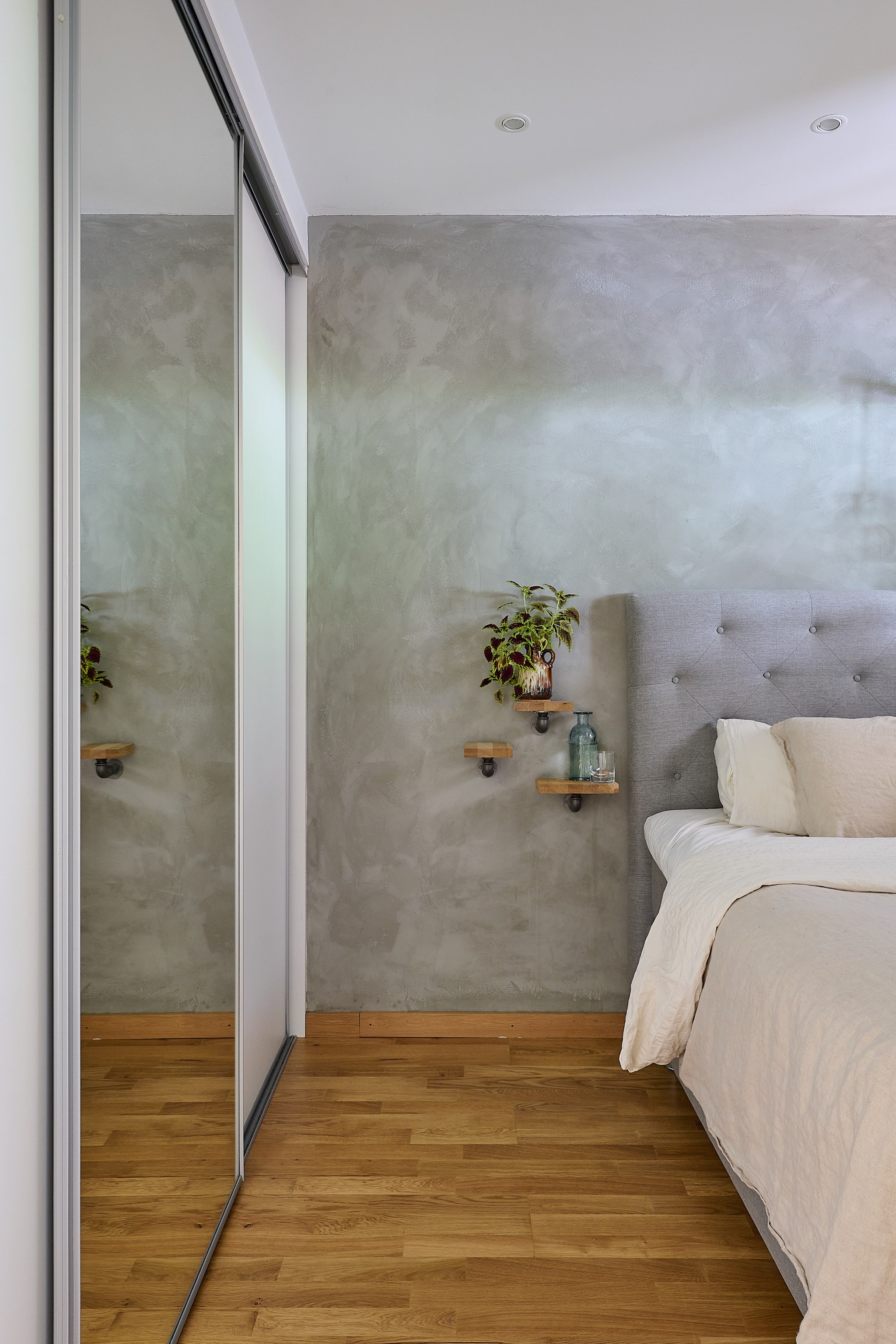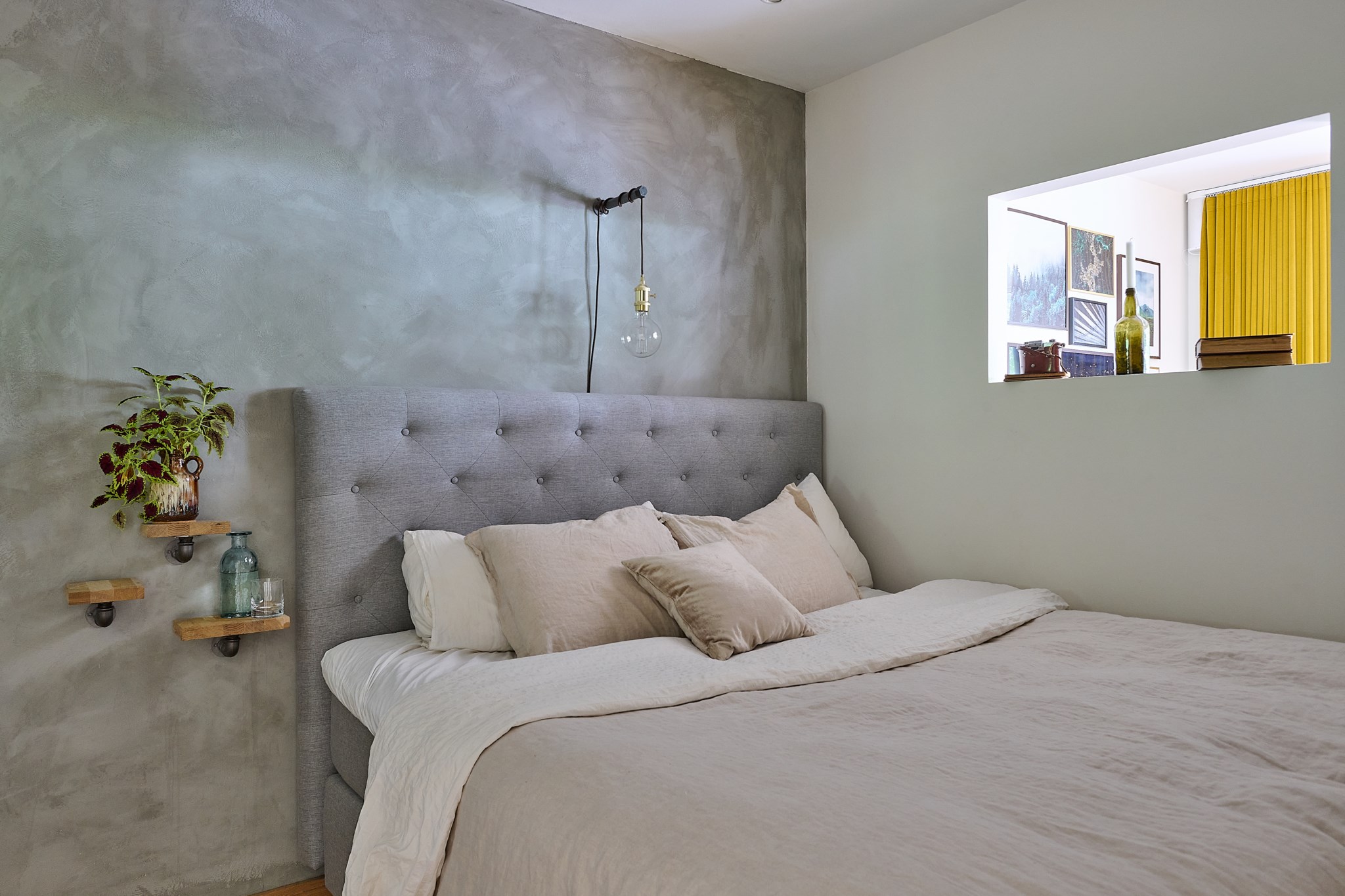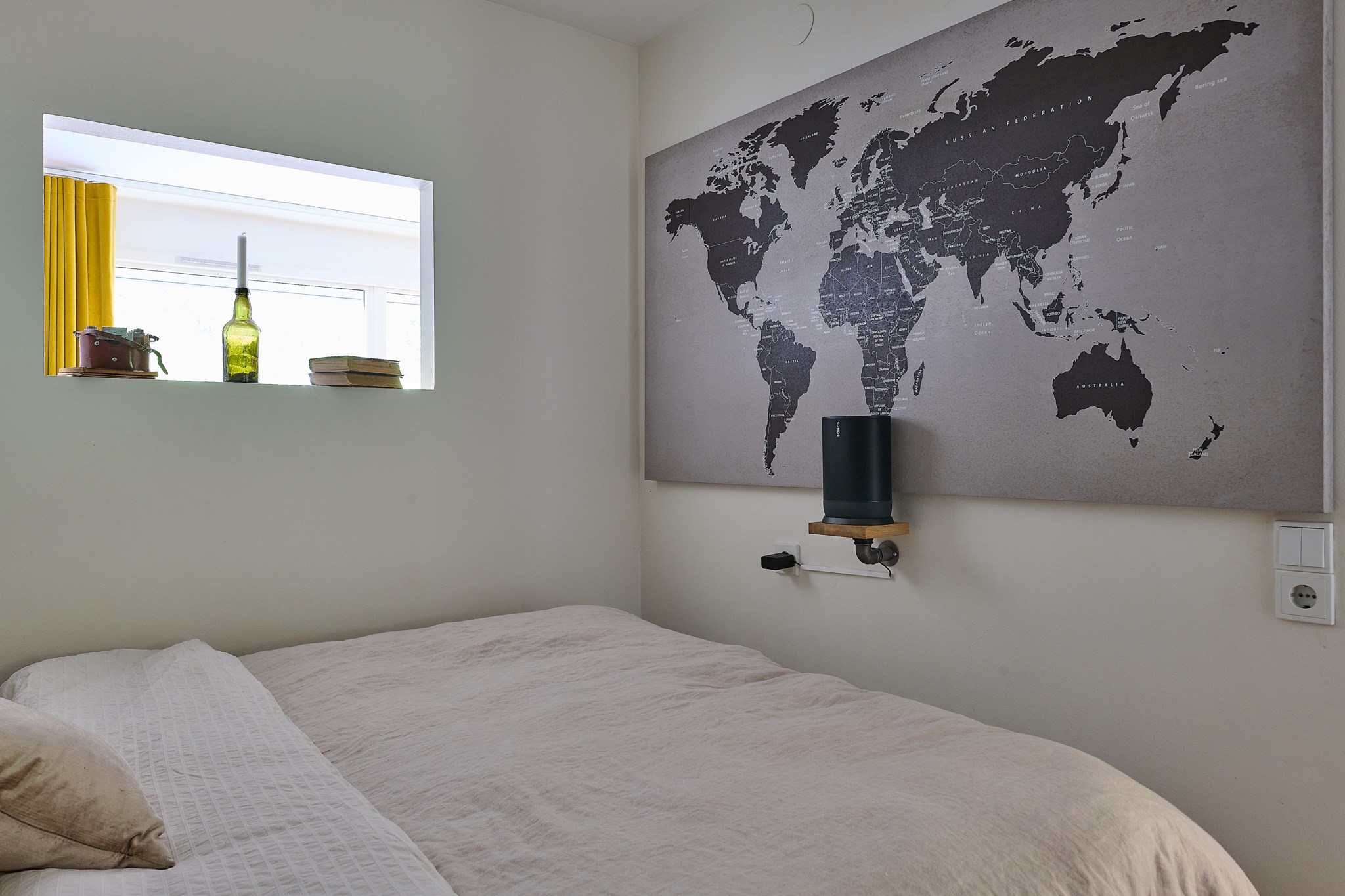 Separat sovrum med plats för stor säng samt förvaring i gedigen skjutdörrsgarderob. Bra belysning via infällda spotlights i tak.