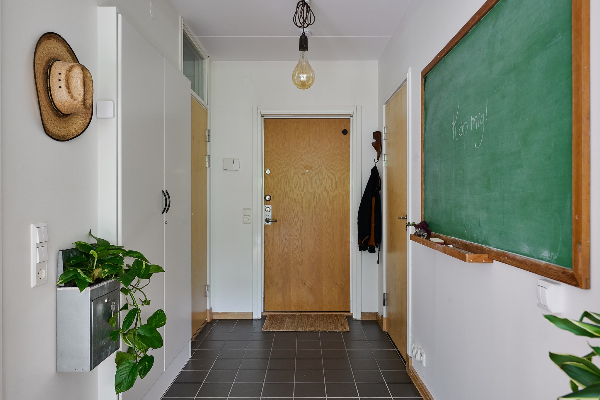Välkomnande hall med praktiskt mörkt klinkergolv.