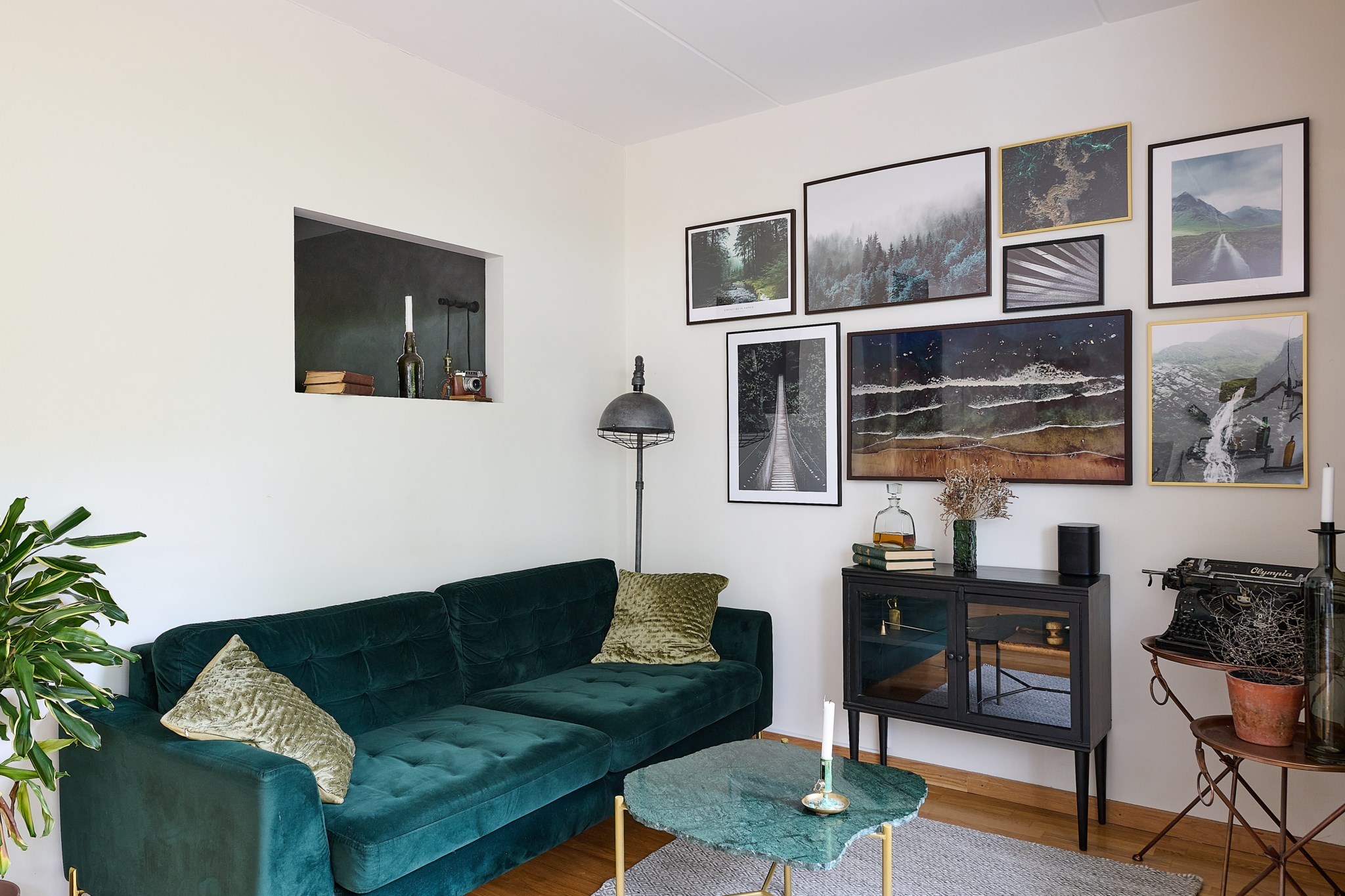 Kök och vardagsrum ligger i öppen planlösning och tillsammans utgör de en social och trivsam yta perfekt för bjudningar. Här finns plats för soffa och tillhörande möblemang.