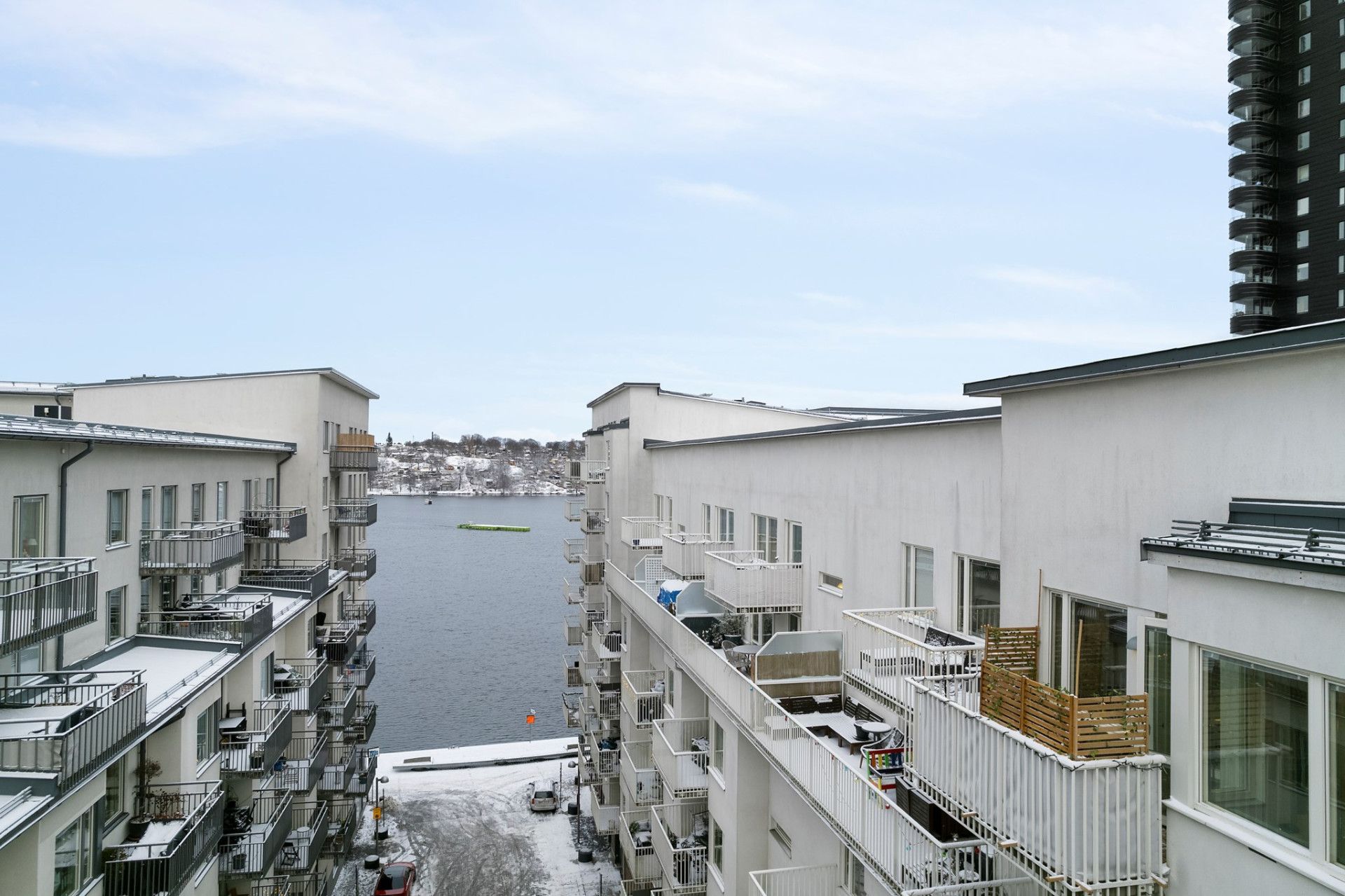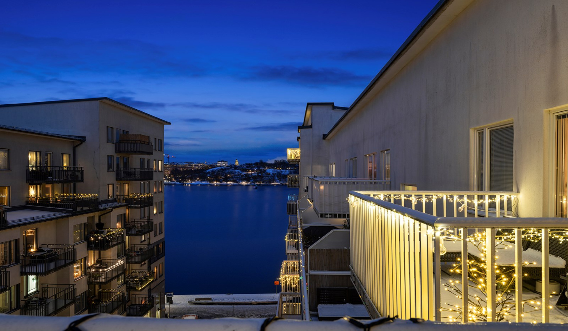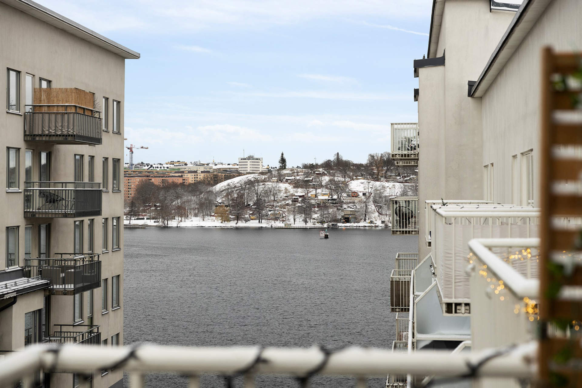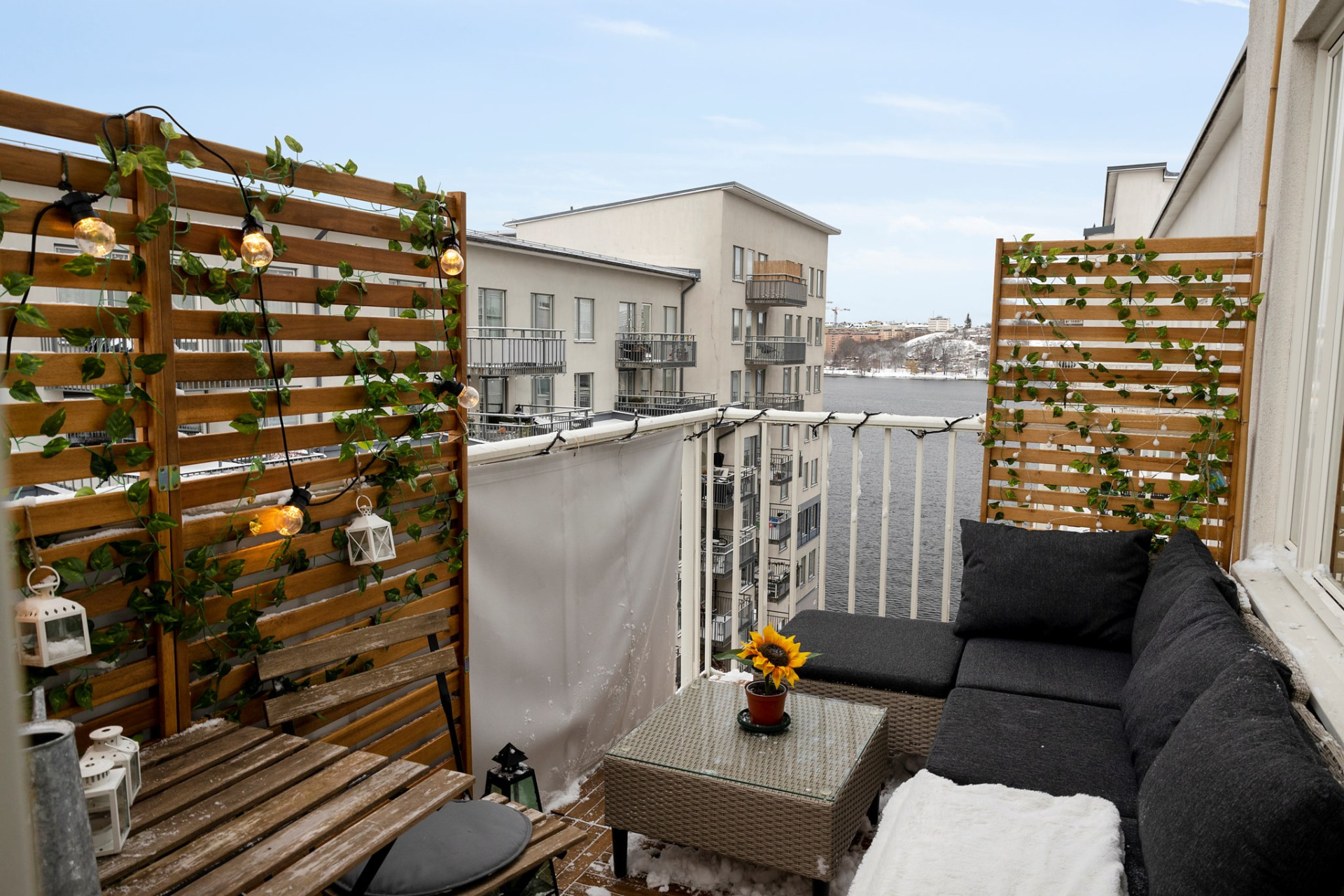 Modern trerummare högst upp i huset med stor balkong i västläge som bjuder på kvällssol och sjöutsikt över Årstaviken.