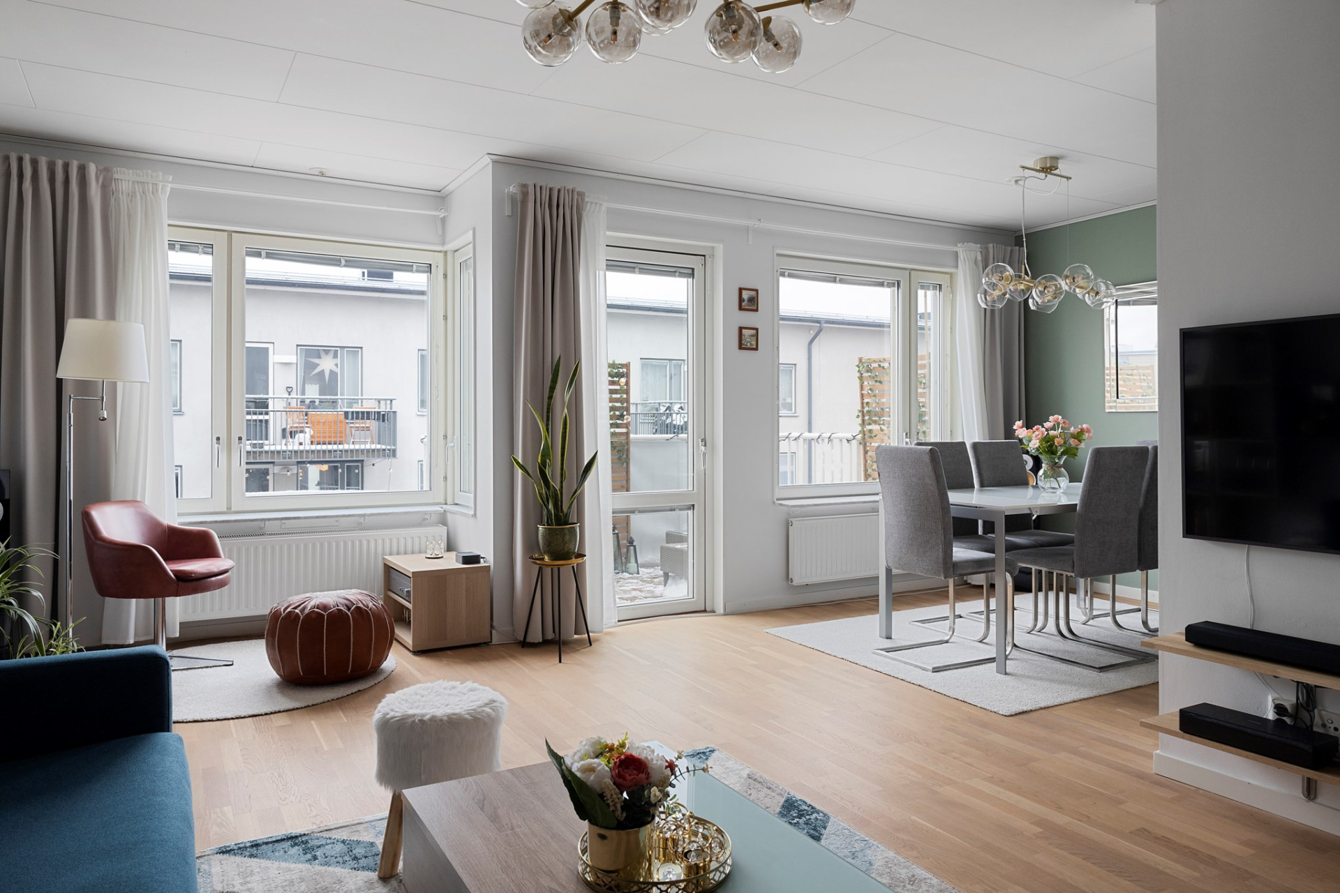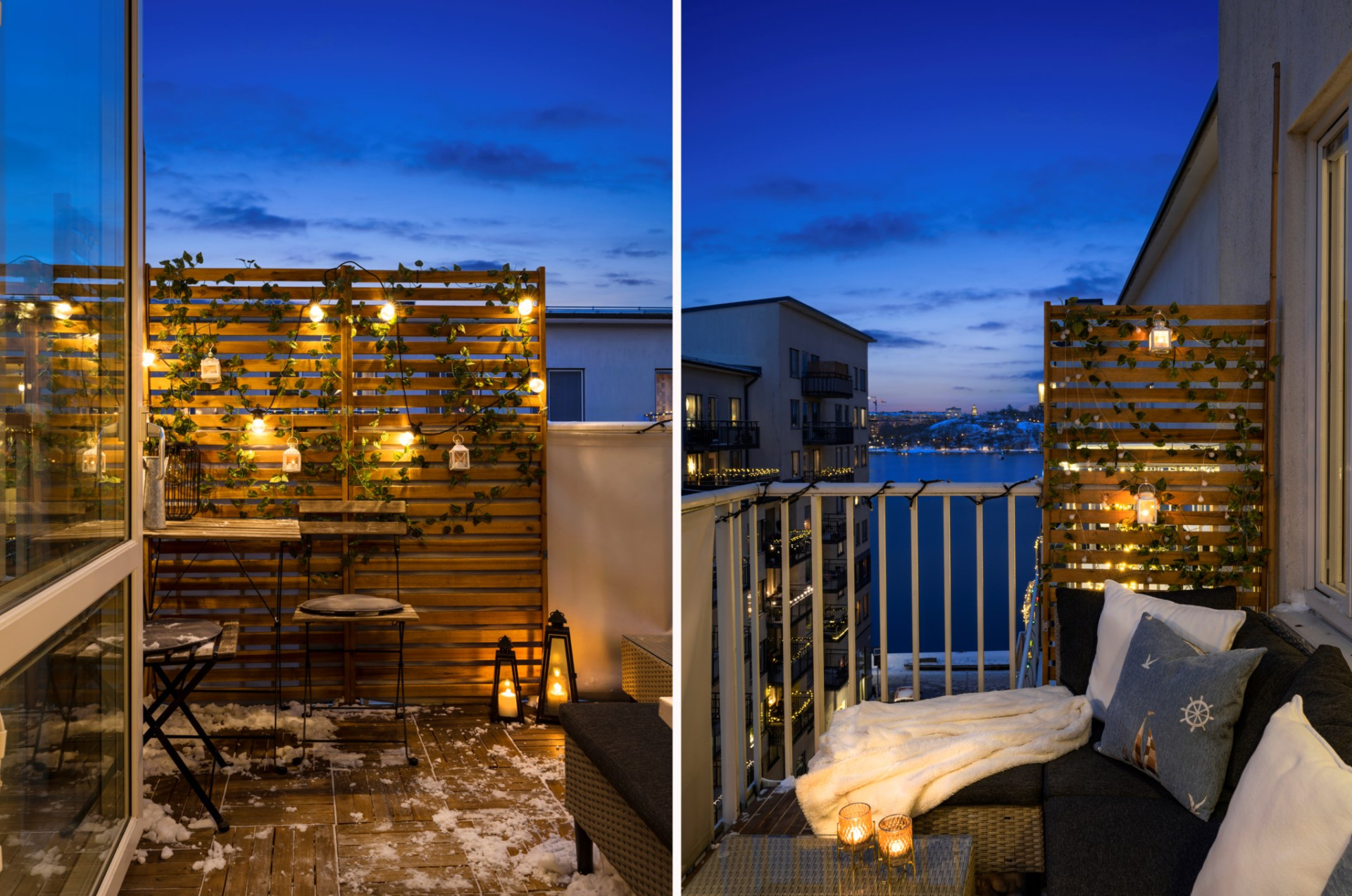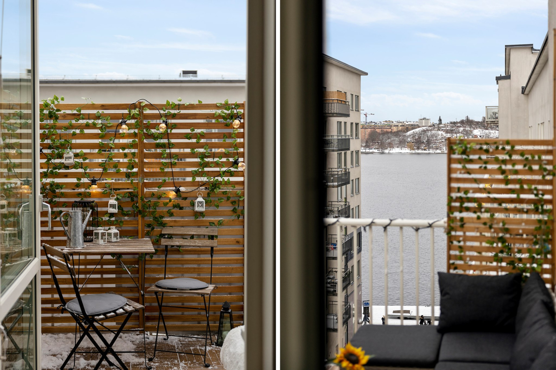 Modern trerummare högst upp i huset med stor balkong i västläge som bjuder på kvällssol och sjöutsikt över Årstaviken.