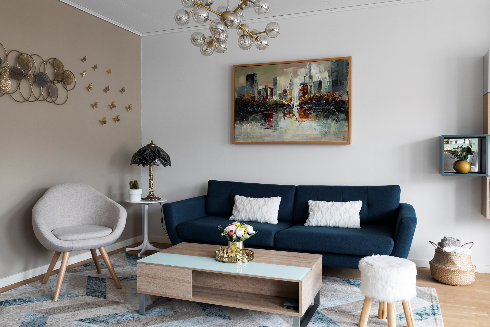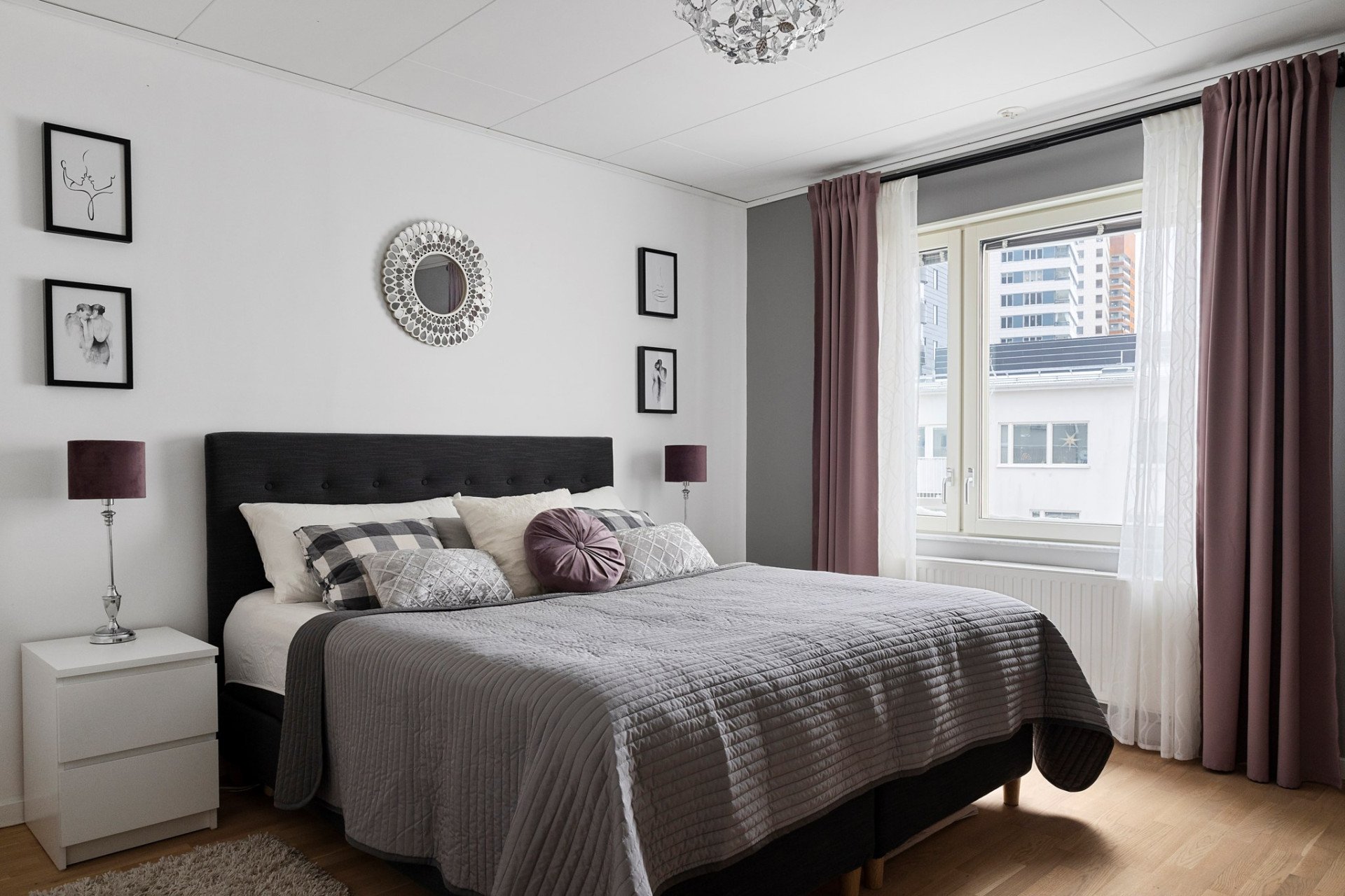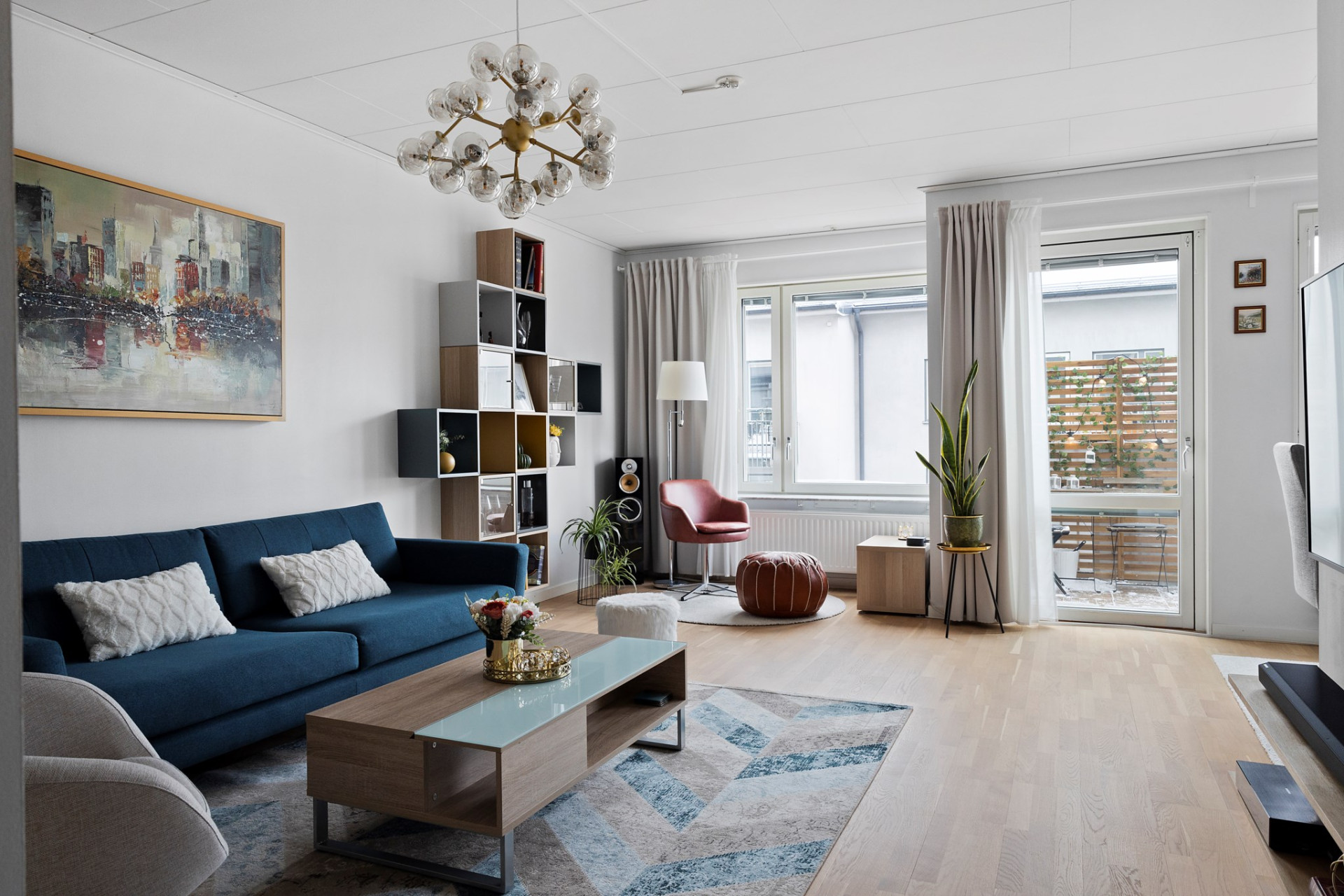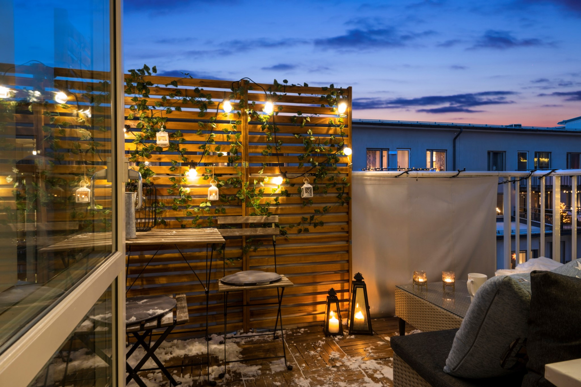 Modern trerummare högst upp i huset med stor balkong i västläge som bjuder på kvällssol och sjöutsikt över Årstaviken.