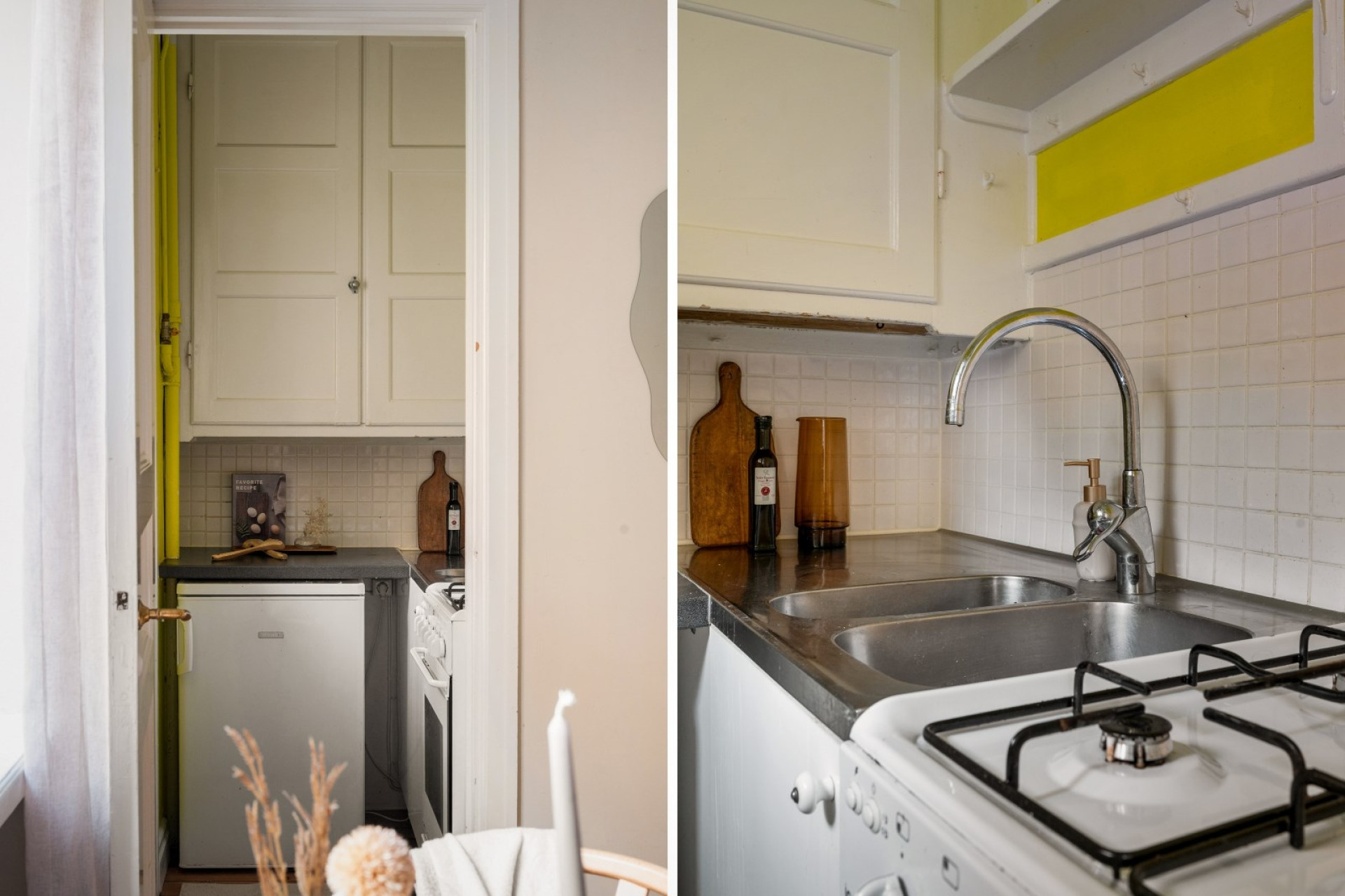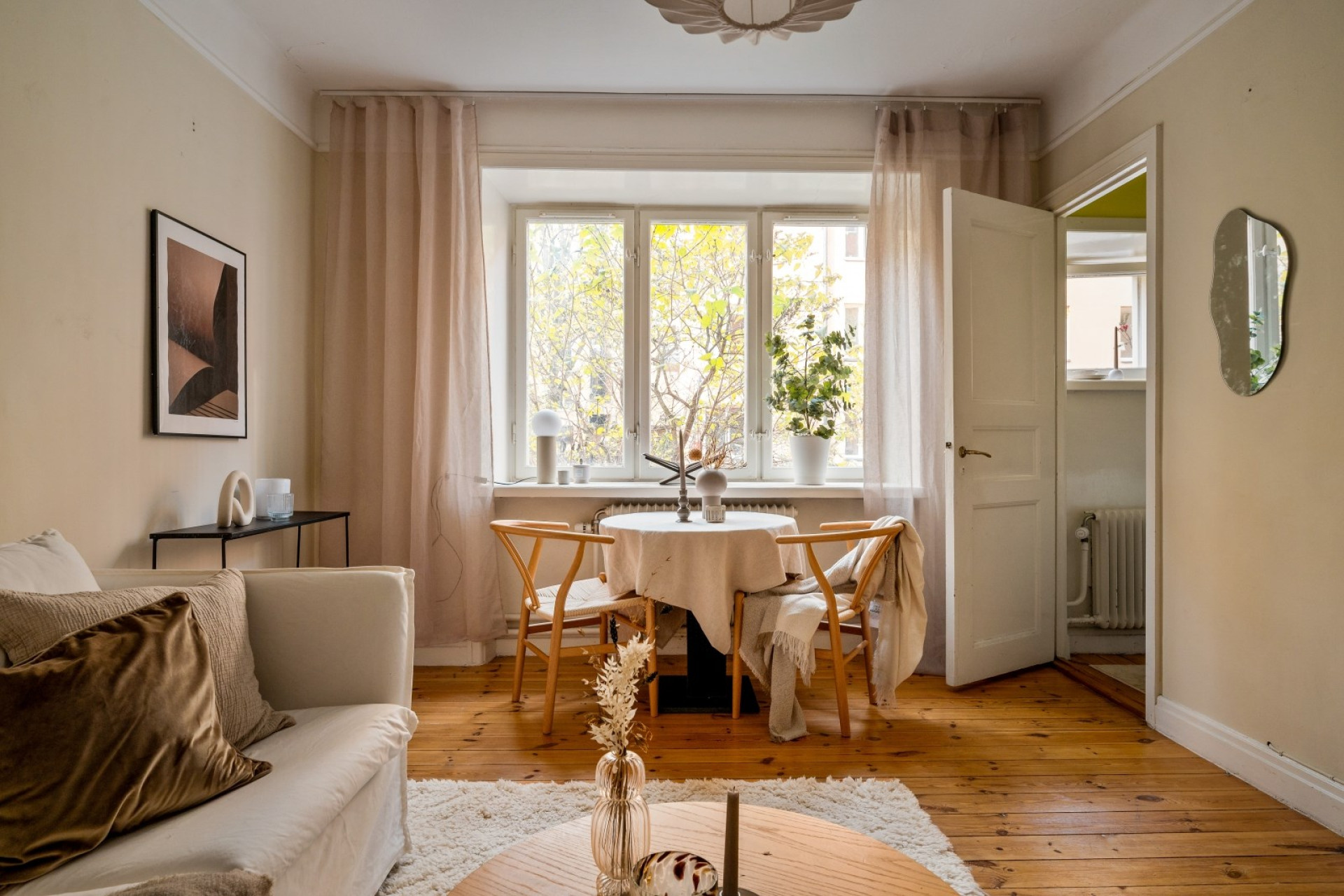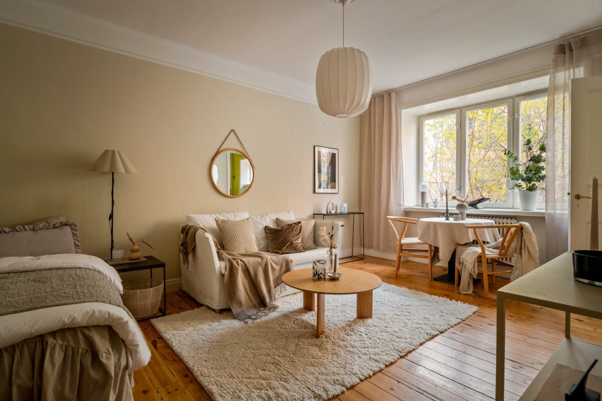 Välplanerad etta om 23 kvm med högt i tak, vackra originaldetaljer och ett fint ljusinsläpp