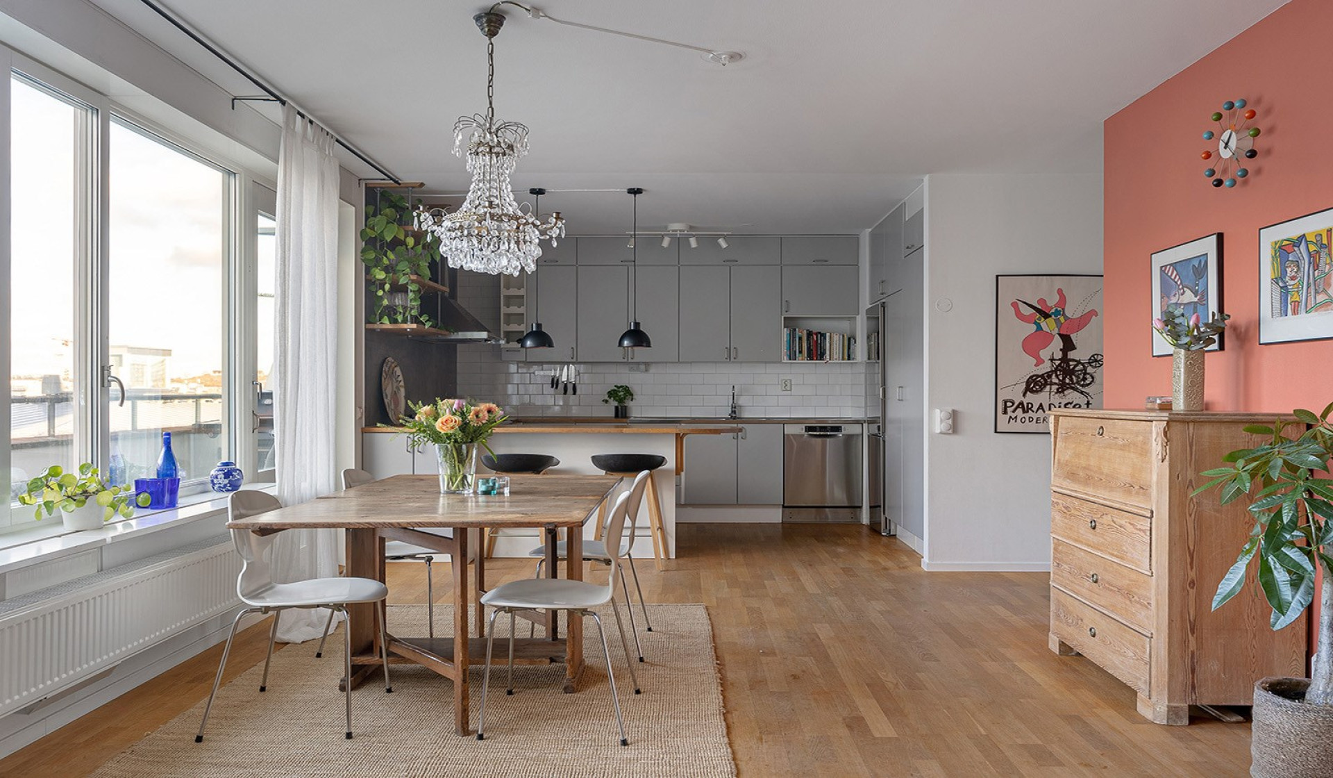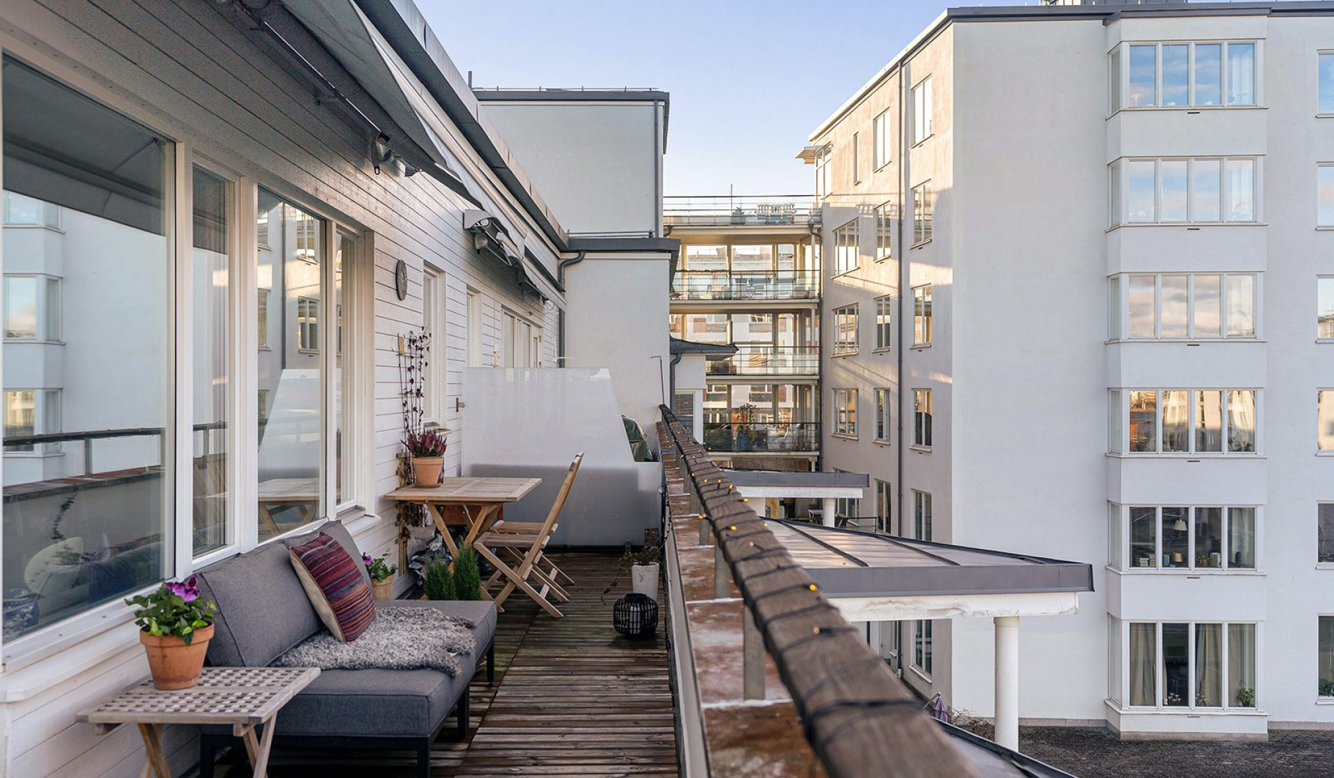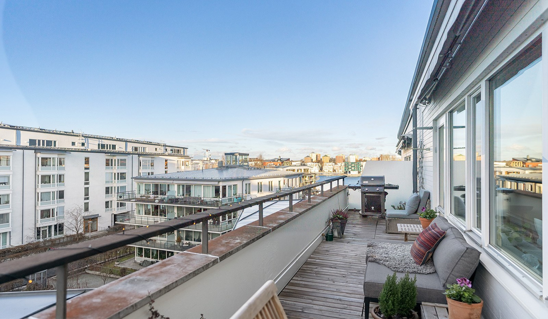 Högst upp i huset med hänförande utsikt över Hammarby Sjö. Väl tilltagen terrass i västerläge med sol från strax efter lunch till sen kväll!