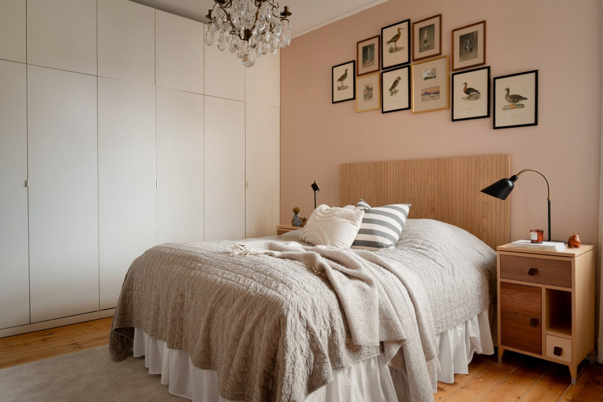 Genom en massiv spegeldörr når du det stora sovrummet som vetter mot den lugna innergården - ett rofyllt rum med plats för både vila och vardagsliv. Med högt i tak och en möbleringsvänlig planlösning ges utrymme för dubbelsäng, byrå och/eller skrivbord. En generös garderobsvägg erbjuder gott om praktisk förvaring.