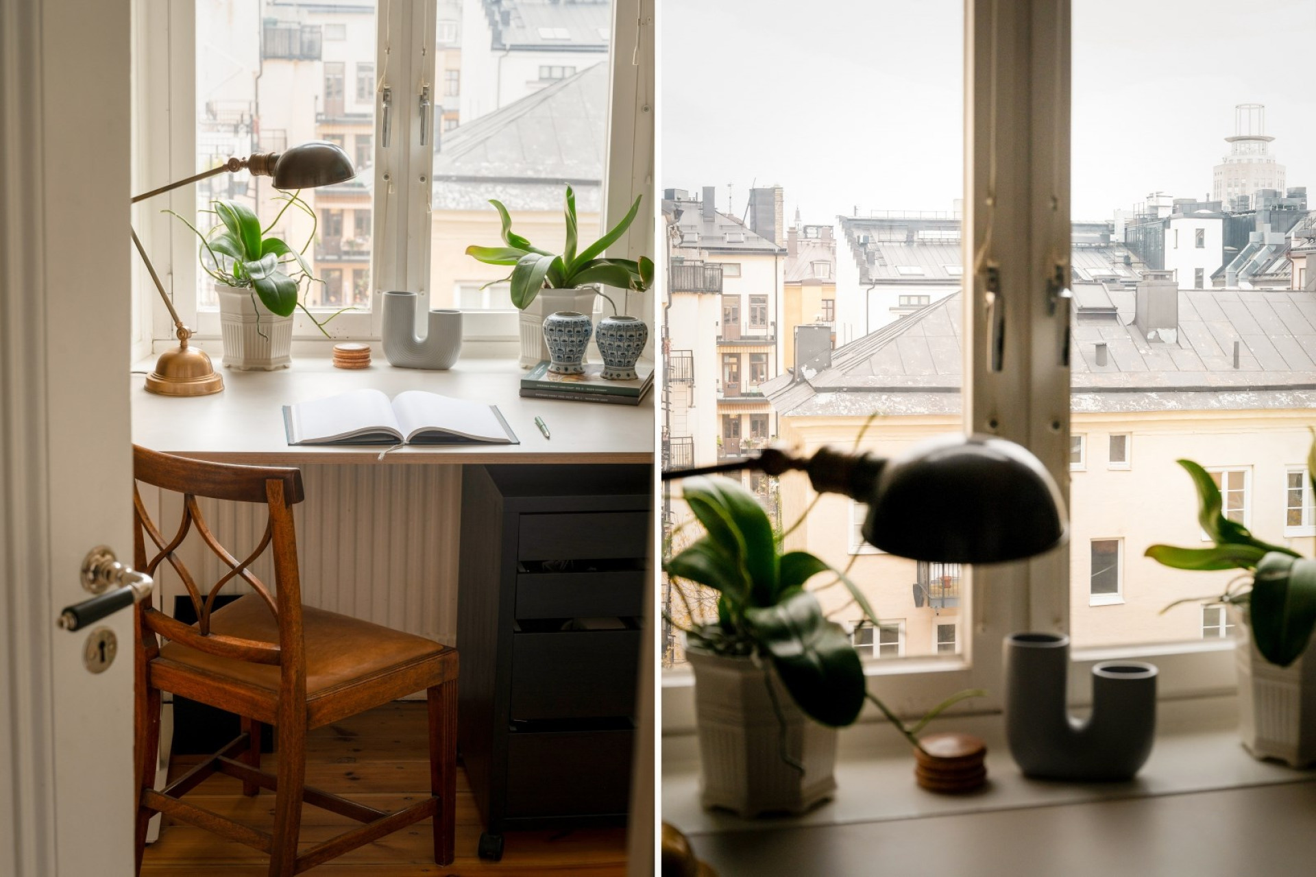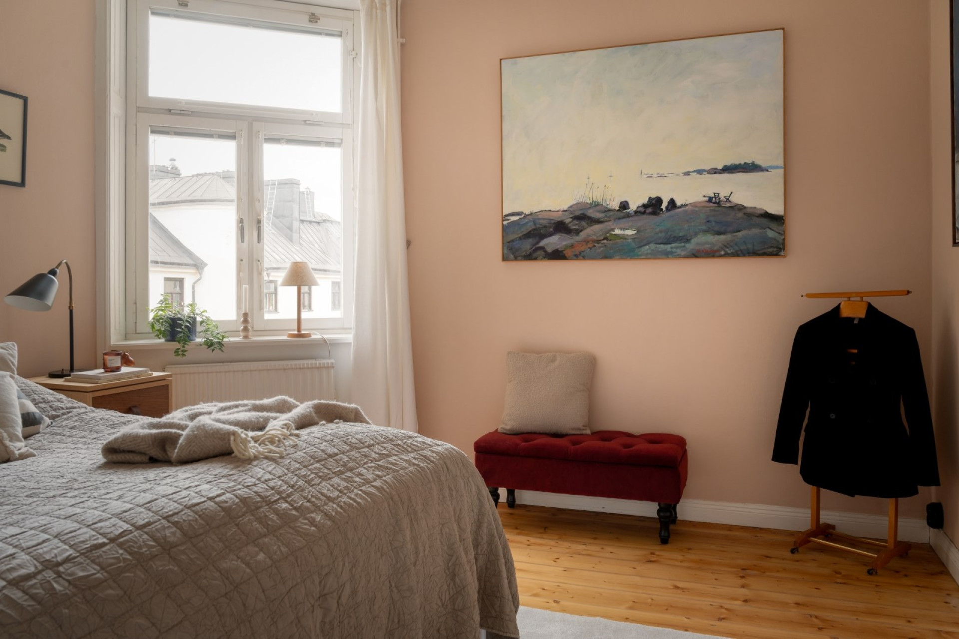 Det andra sovrummet, även detta med rofylld utsikt över takåsar och gård, kan med fördel användas som gästrum, kontor eller barnrum. Här ryms säng och övrigt möblemang efter behov.