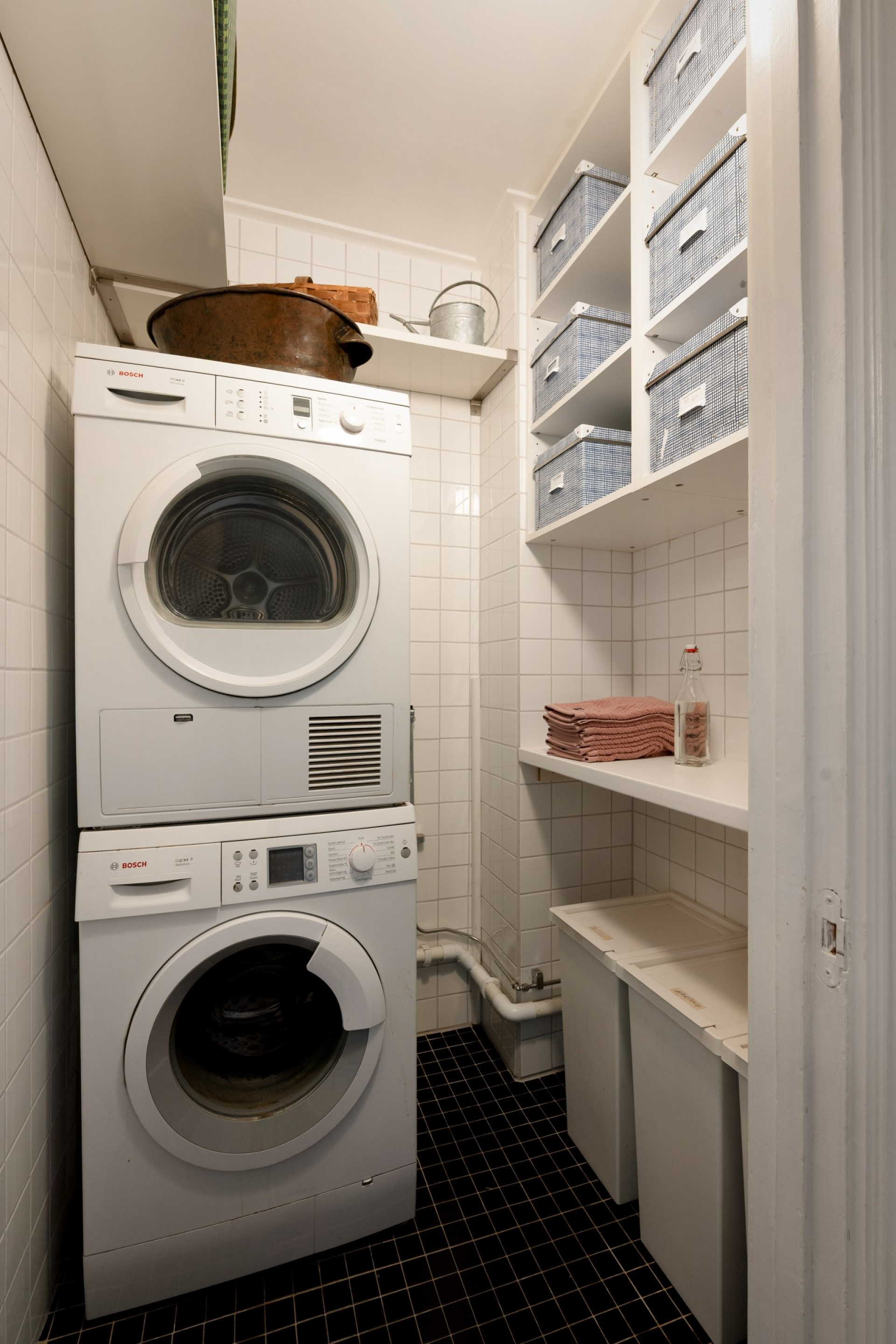 I direkt anslutning finns en praktisk tvättstuga med svart klinkergolv, vitkaklade väggar, tvättmaskin, torktumlare och hyllförvaring – en sällsynt bekvämlighet i denna typ av hem.