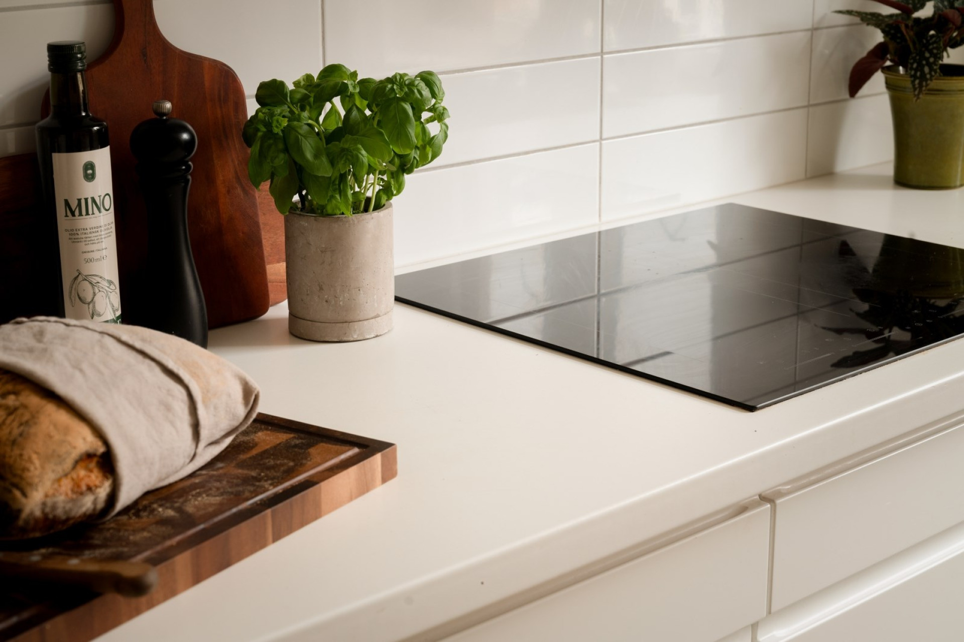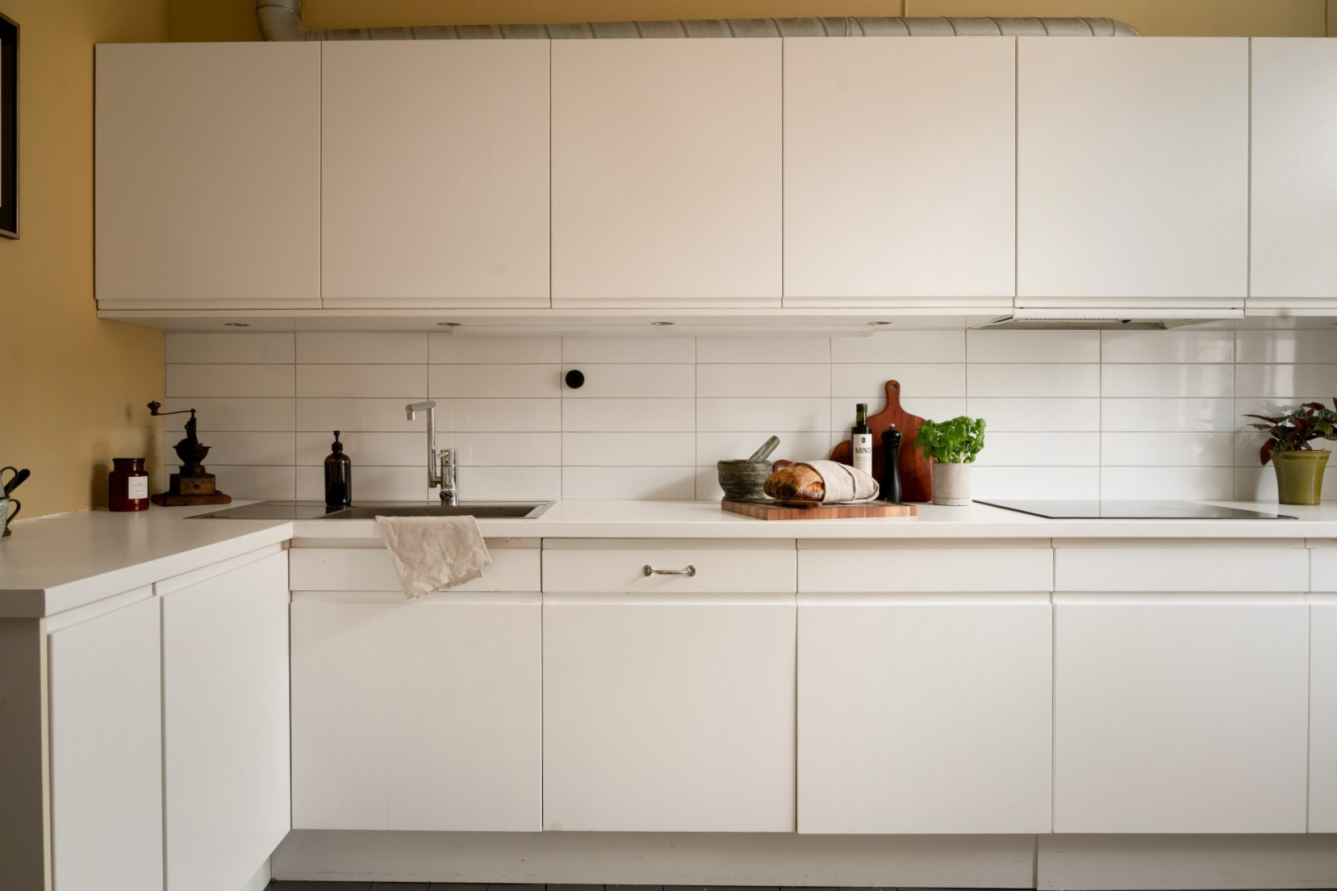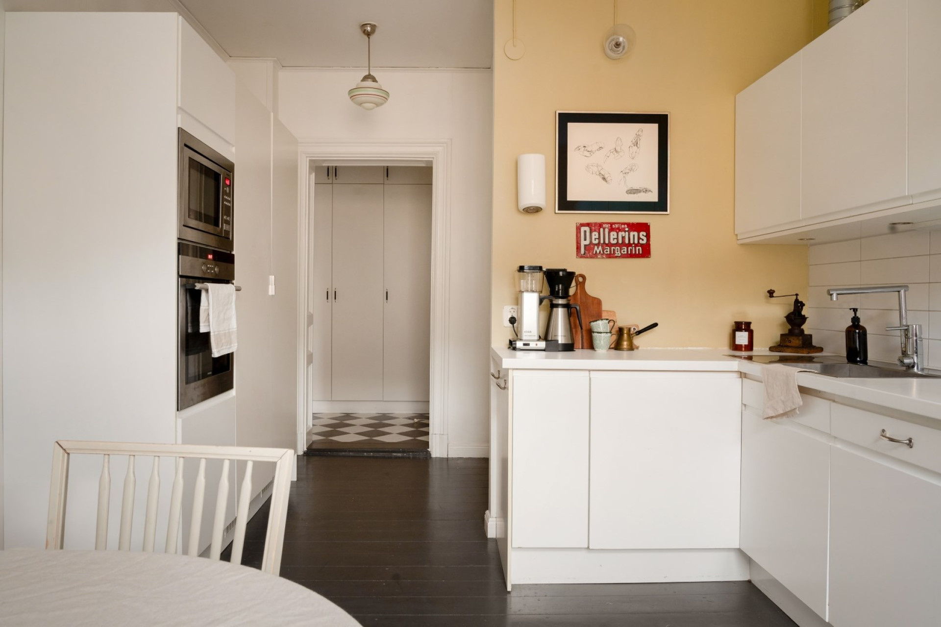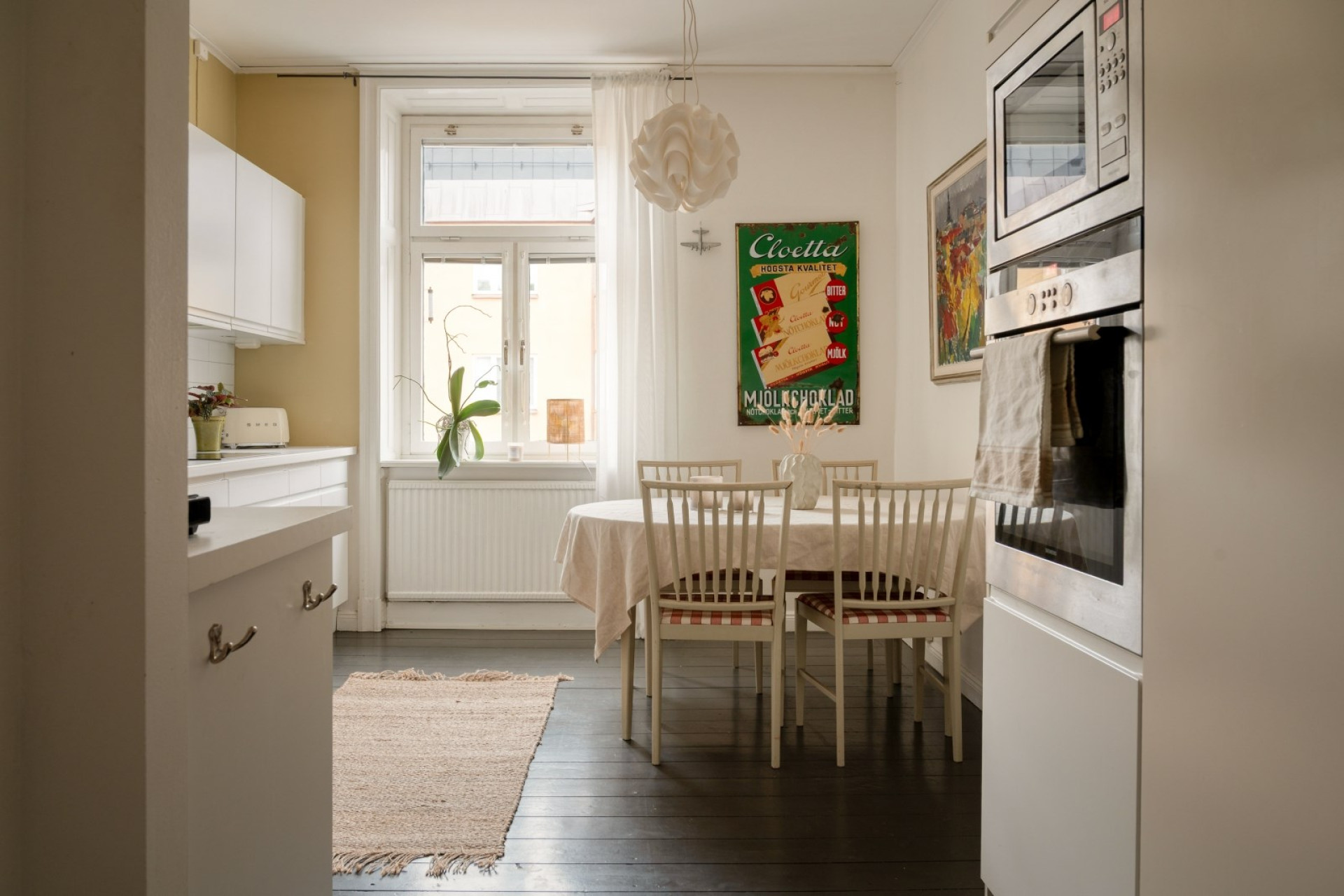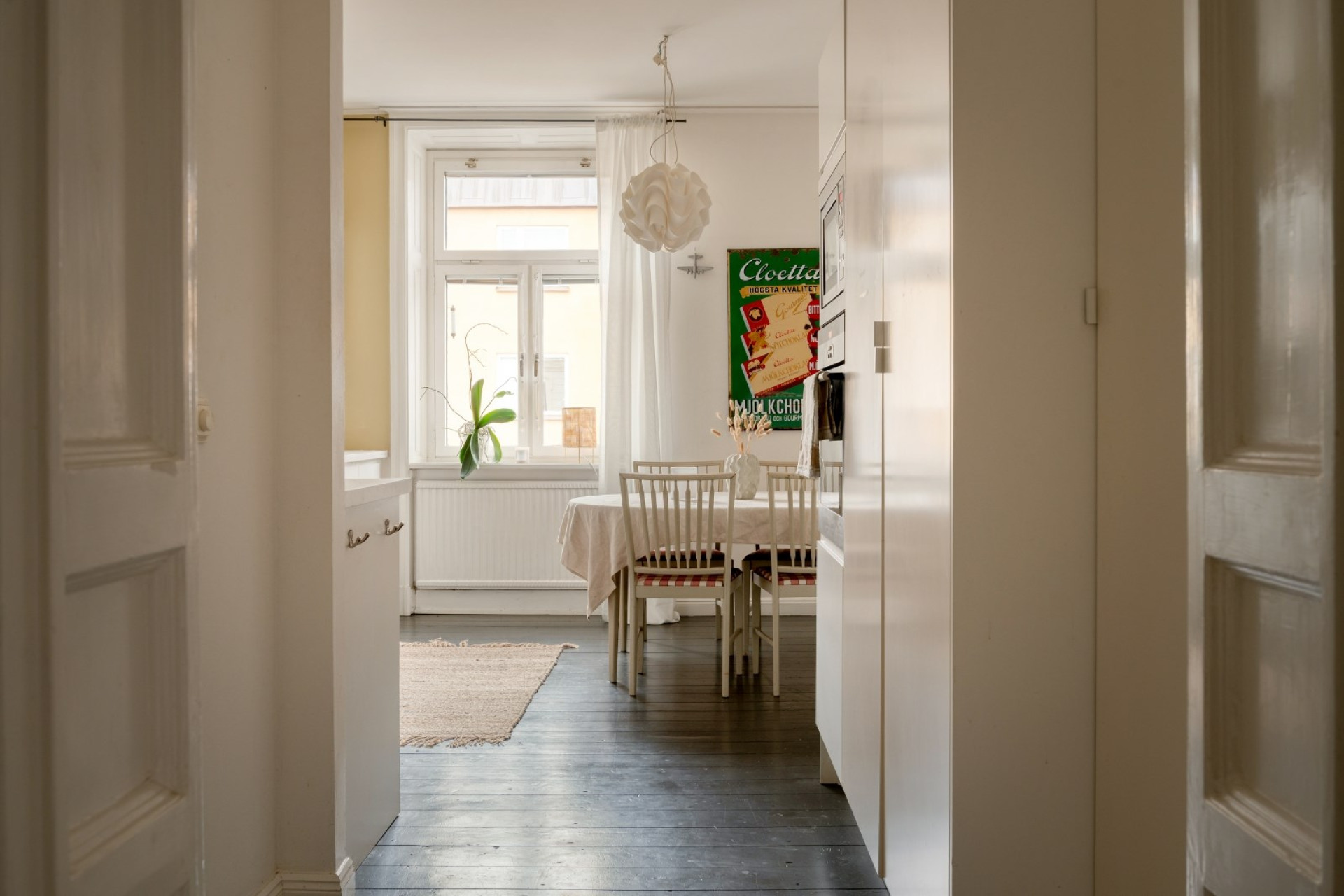 Till vänster från hallen öppnar sig det rymliga köket med plats för stort matbord intill fönstret. Här möts stilrena vita köksluckor, släta linjer och generösa arbetsytor i en smakfull helhet. Den integrerade belysningen under överskåpen lyser upp det vita kaklet över arbetsbänken och förstärker det ljusa intrycket. Köket är fullt utrustat med integrerad diskmaskin, induktionshäll, köksfläkt, inbyggd mikro och varmluftsugn i rostfritt samt fullstor kyl och frys. Golvet består av mörkt målat massivt trä och det vackra fönstret med spegelsmygar släpper in rikligt med ljus.