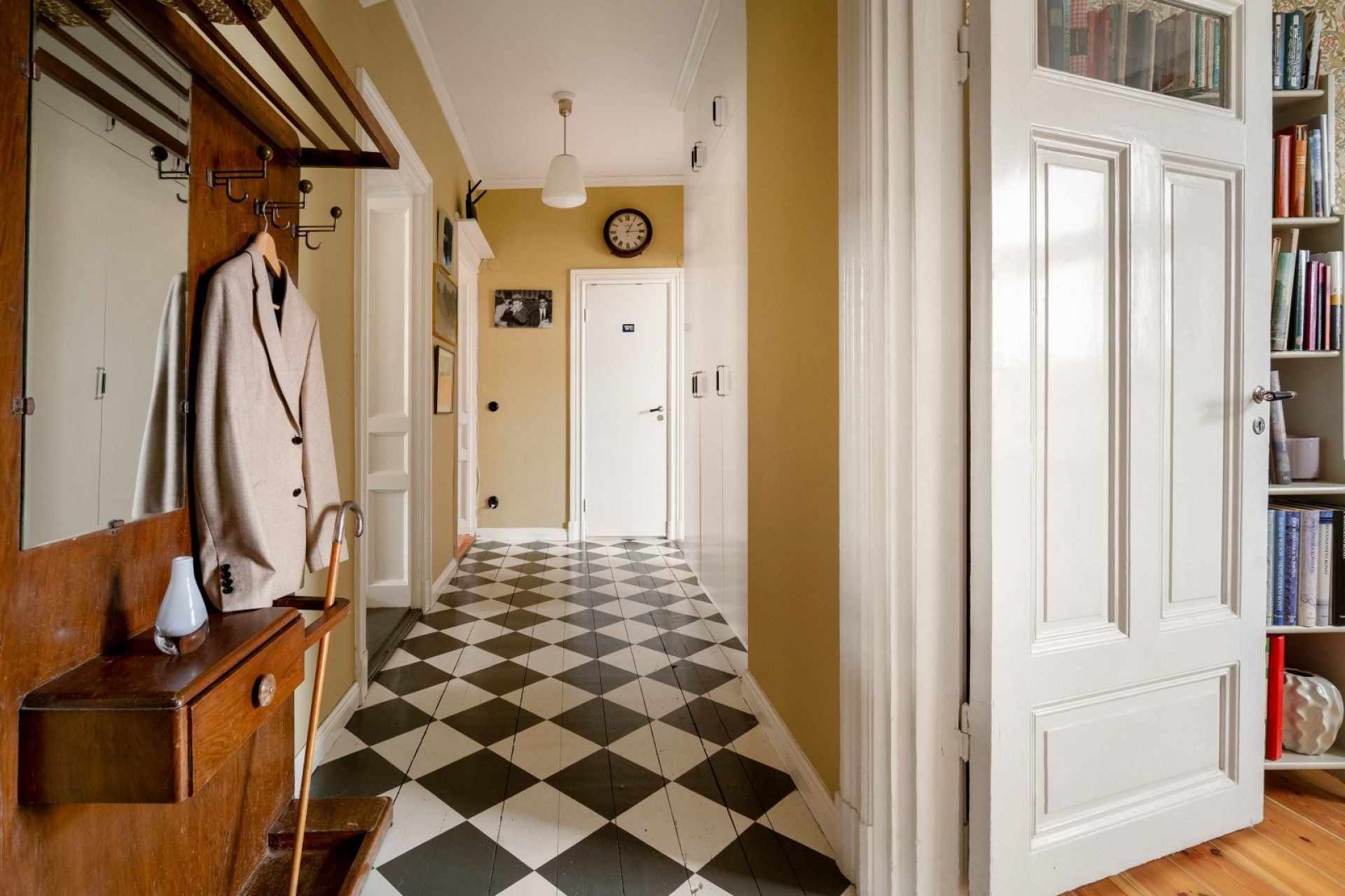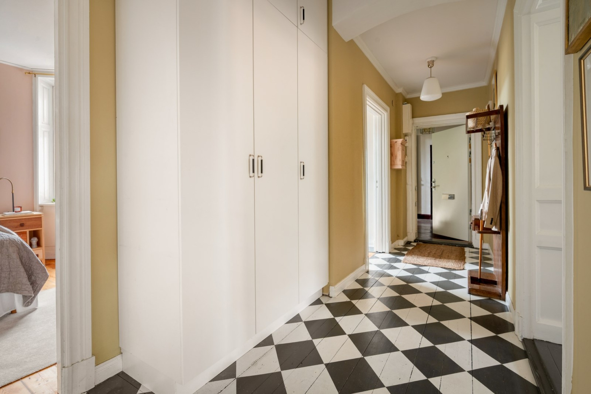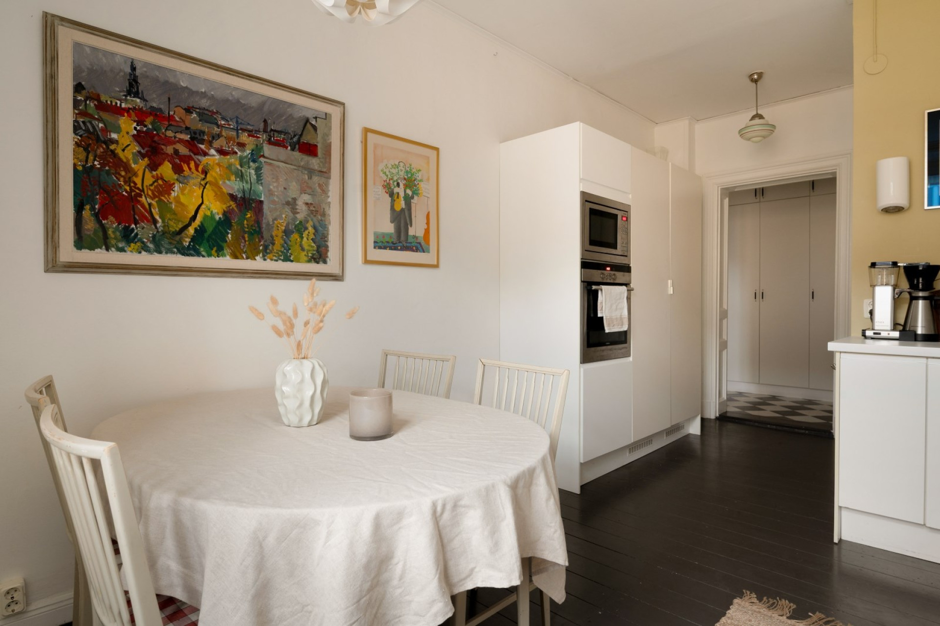 Redan i hallen möts du av en känsla av elegans och harmoni. Den generösa entrén binder samman bostadens alla rum på ett naturligt sätt och ger ett varmt första intryck. De målade massiva trägolven och väggar i varm ton skapar en inbjudande atmosfär. Här finns gott om plats för avhängning direkt innanför säkerhetsdörren, samt ytterligare förvaring i tre praktiska garderober längre in i hallen.