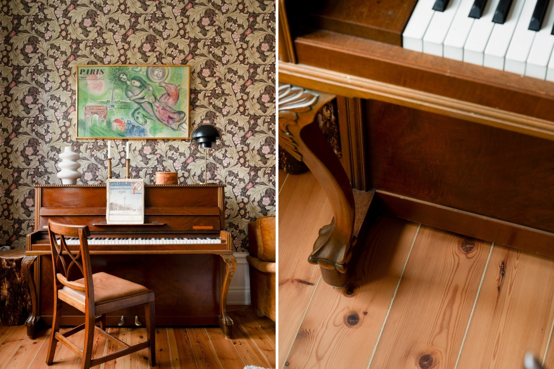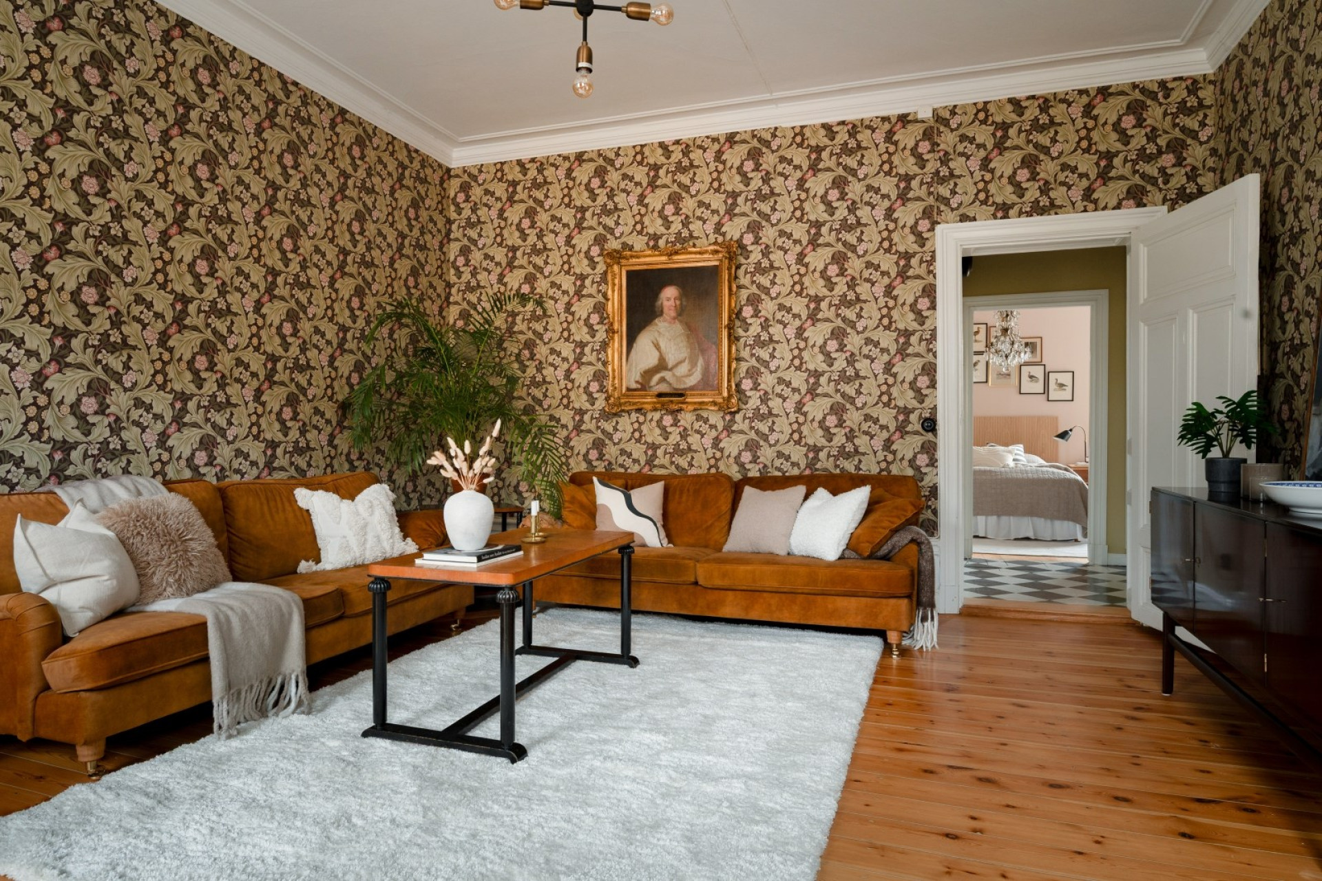 Lägenhetens vardagsrum imponerar med sin generösa rymd och takhöjd om hela 3,10 meter. Genom de stora fönstren strömmar ljuset in och lyfter fram det vackra massiva trägolvet på ett harmoniskt sätt. Tapetserade väggar och höga, klassiska golvlister förstärker sekelskifteskänslan. Här finns gott om plats för både sällskapsdel och matgrupp – en självklar samlingspunkt för familj och vänner.