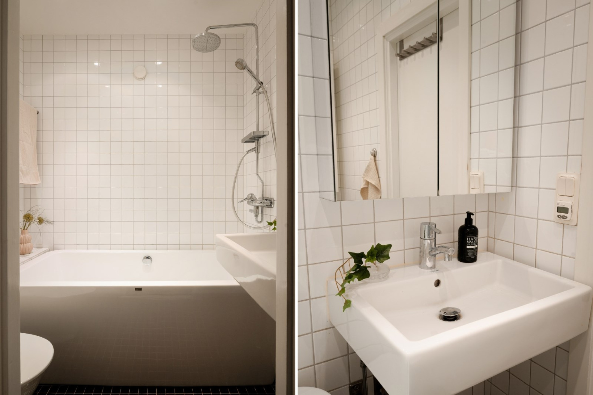 Längst in i bostaden finns det stilfulla badrummet – helkaklat i vitt med svart klinkergolv och behaglig golvvärme. Här finns ett elegant designbadkar med både tak- och handdusch, spegelskåp ovan handfat, vägghängt förvaringsskåp samt spotlights i taket som skapar en lyxig känsla.