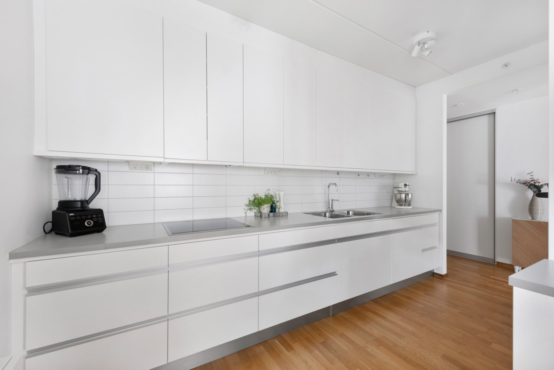 Köket går i vitt med full maskinell utrustning, gott om förvaring och fina arbetsytor som gör matlagningen till ett nöje. Intill fönstren ryms utan problem ett stort matbord, här dukar du gärna långbord för släktmiddagar, högtider och spontana besök.