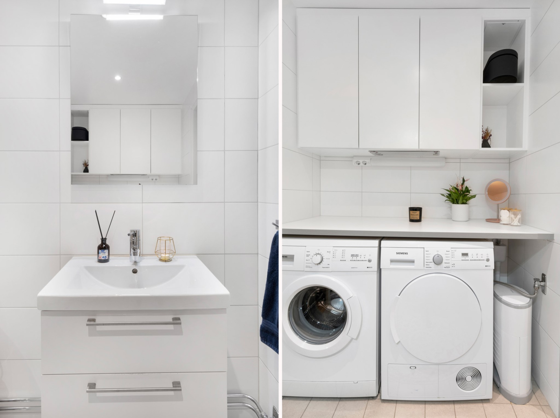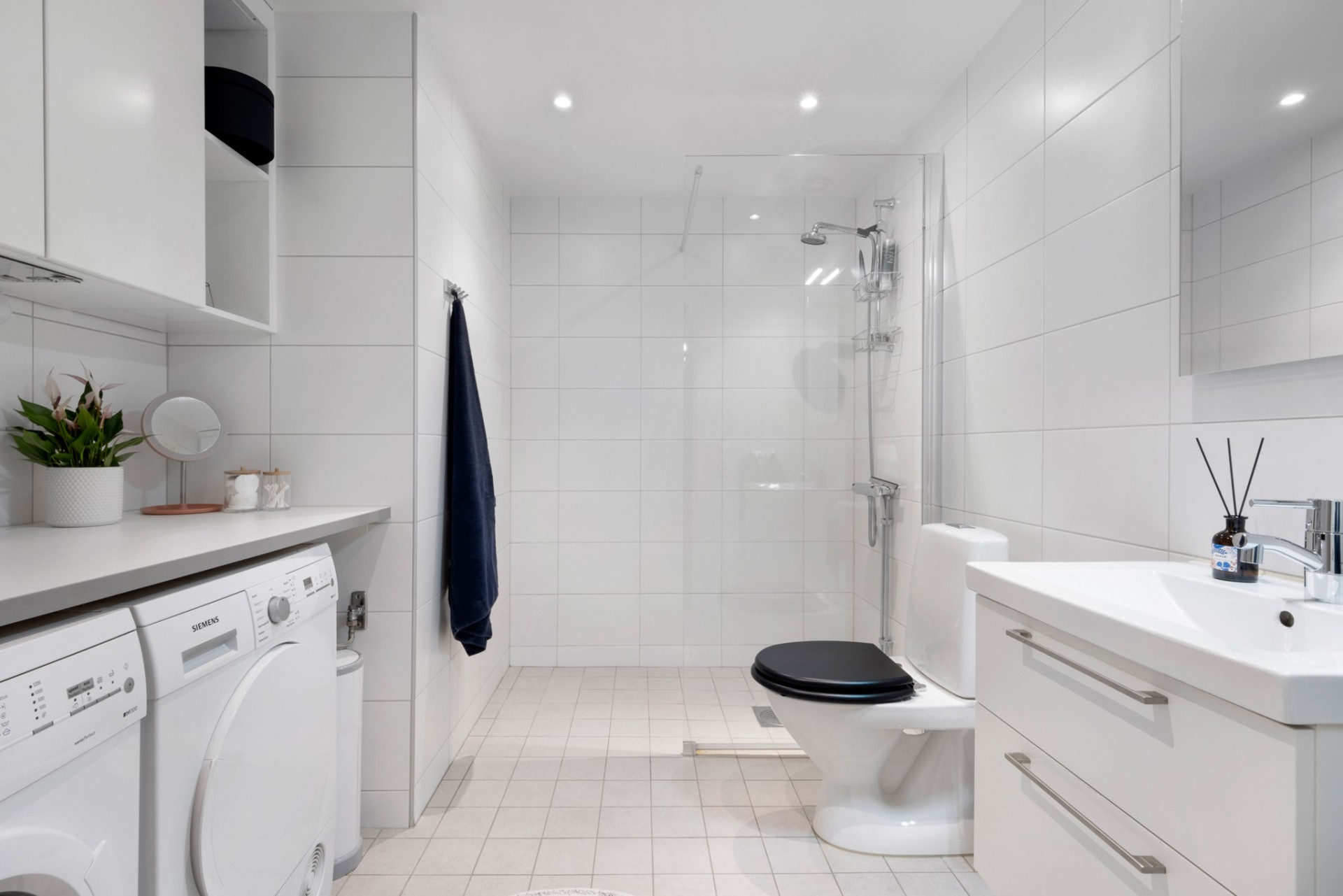 Badrummet är stilrent helkaklat och erbjuder både komfort och funktion med dusch, wc och en praktisk tvättavdelning med tvättmaskin, torktumlare, arbetsbänk och skåp.