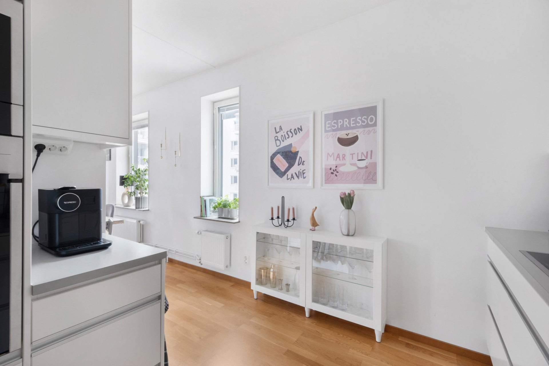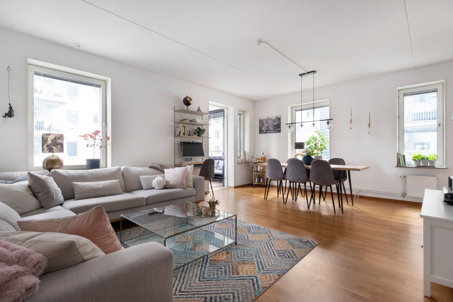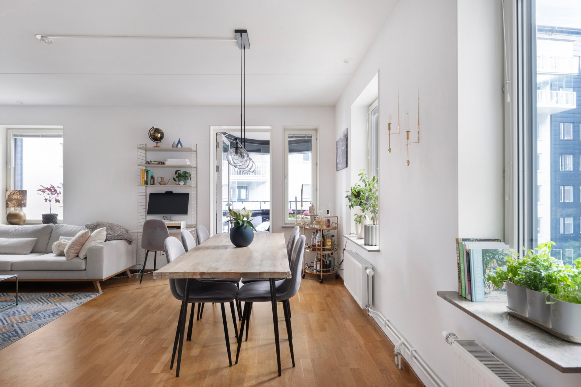 Vardagsrummet är rymligt och bjuder in till sociala stunder. Härifrån når du också den stora, inglasade balkongen, en härlig förlängning av vardagsrummet som fungerar som ett extra uterum större delen av året. Med utsikt över både föreningens gröna innergård och Årstavikens vatten blir detta snabbt en favoritplats för frukostkaffet, middagar eller en lugn stund med en bok.