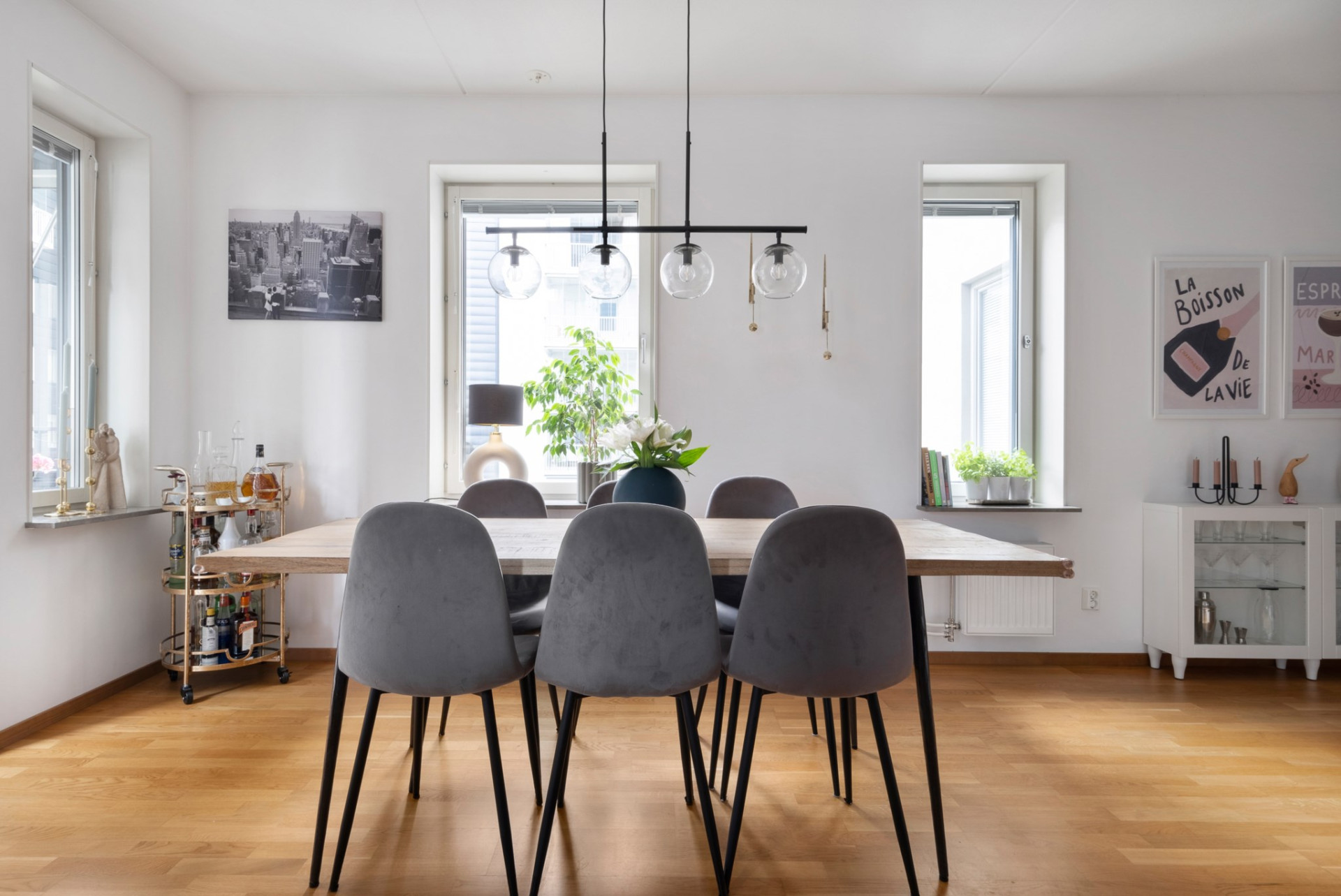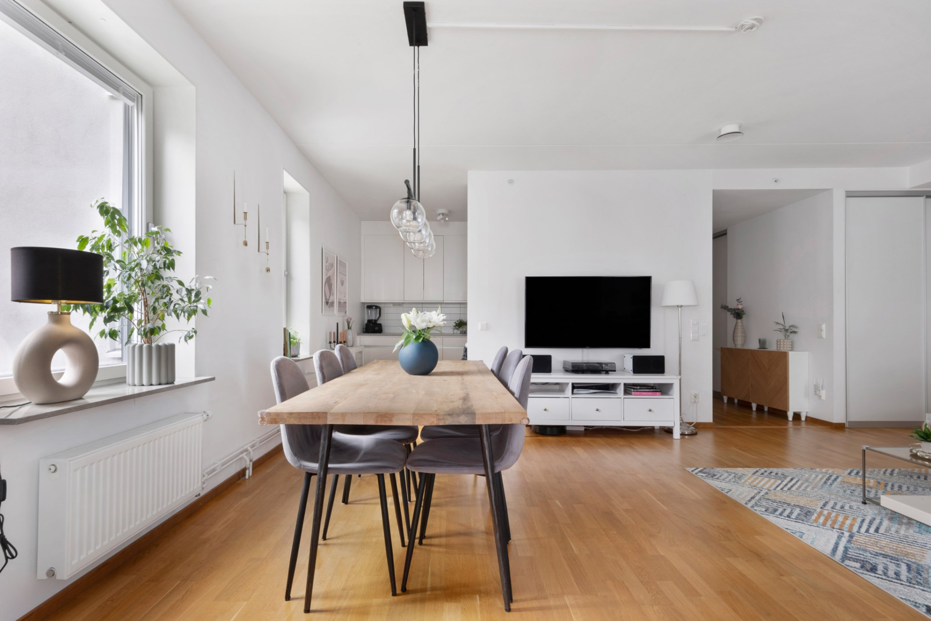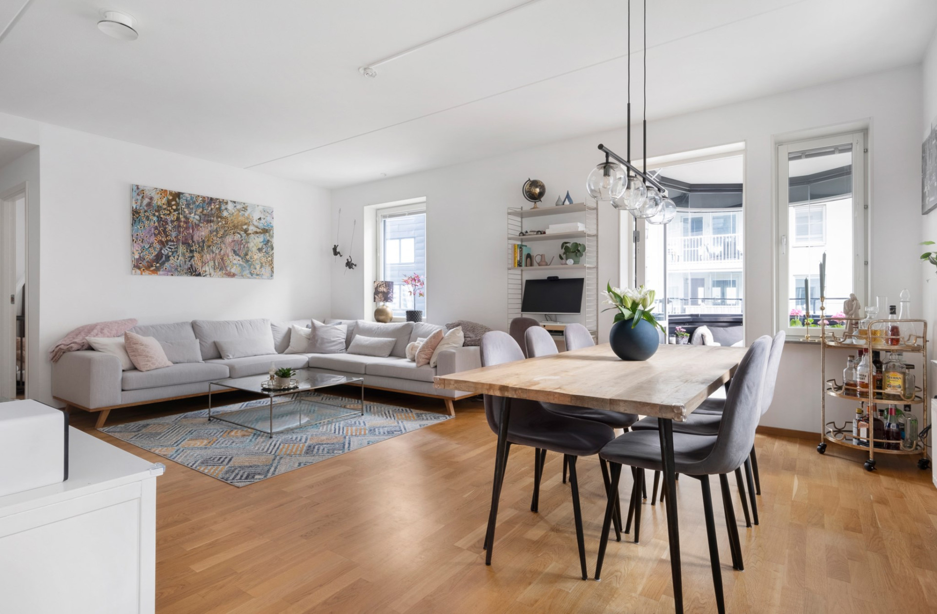 Lägenheten bjuder på en genomtänkt planlösning med generösa ytor och stora fönsterpartier som släpper in rikligt med ljus och skapar en luftig, inbjudande atmosfär. Den öppna planlösningen mellan kök och vardagsrum blir hemmets naturliga samlingsplats, perfekt för både vardagsliv och festliga middagar.