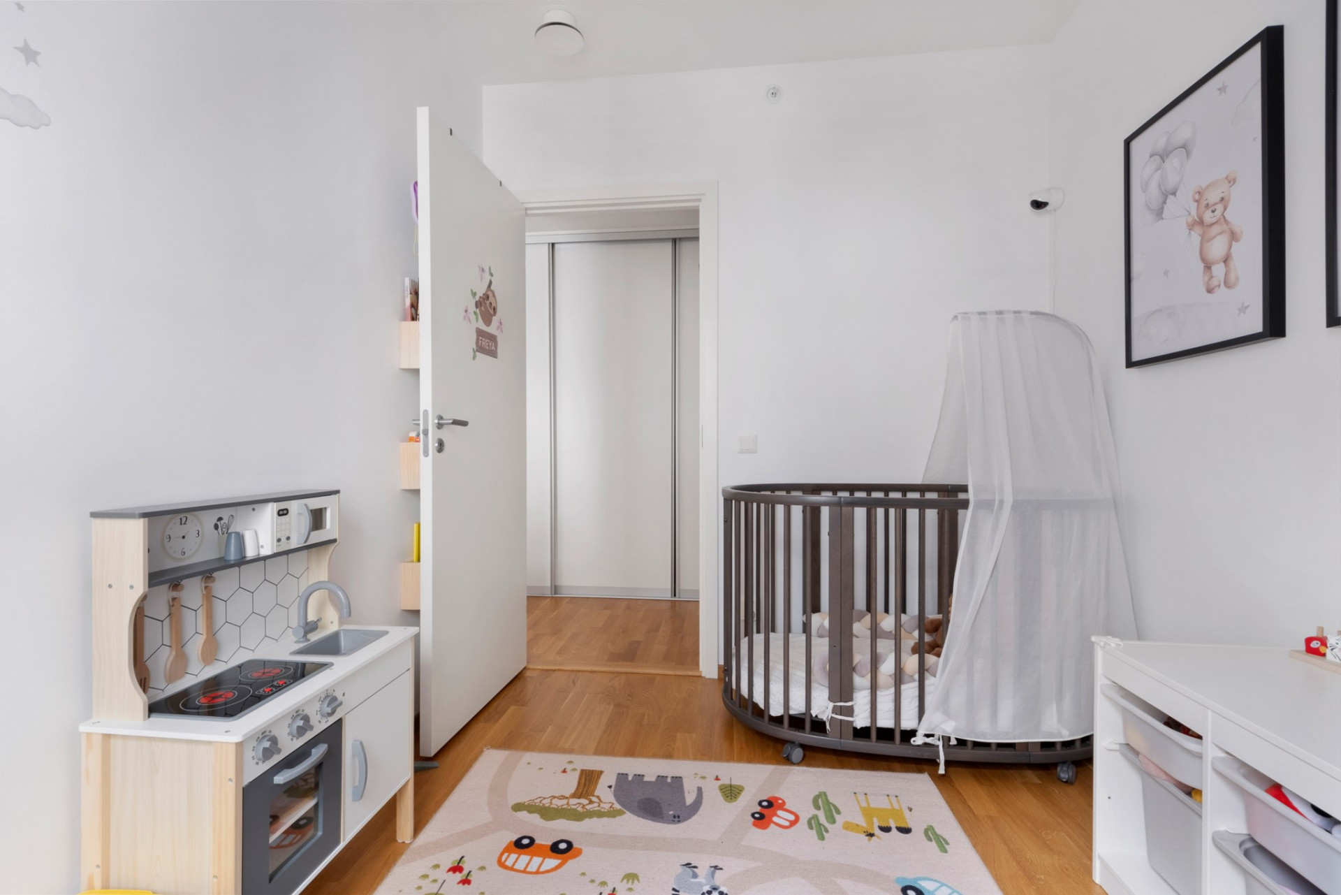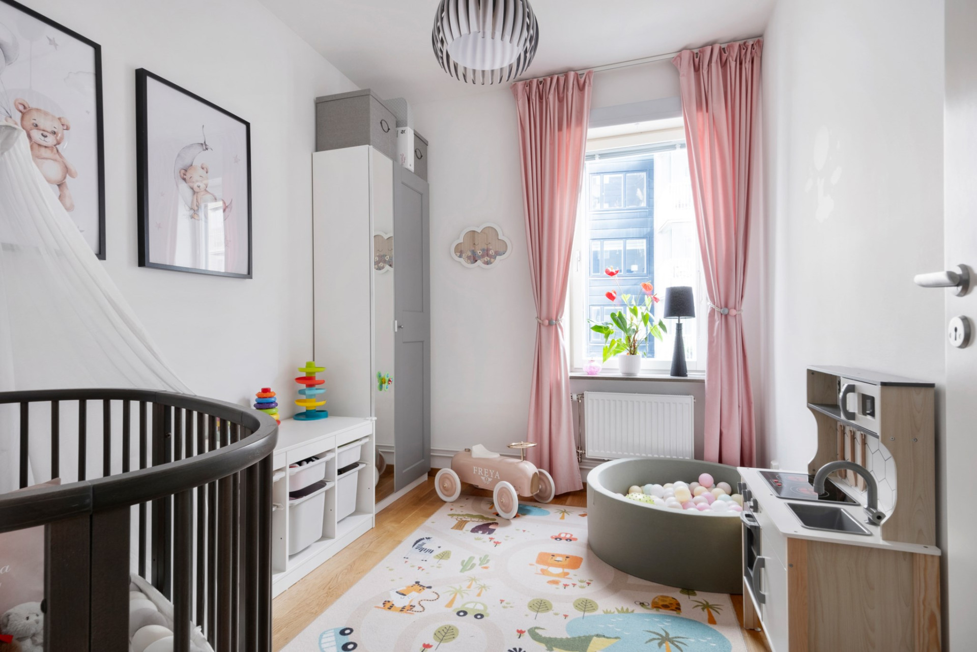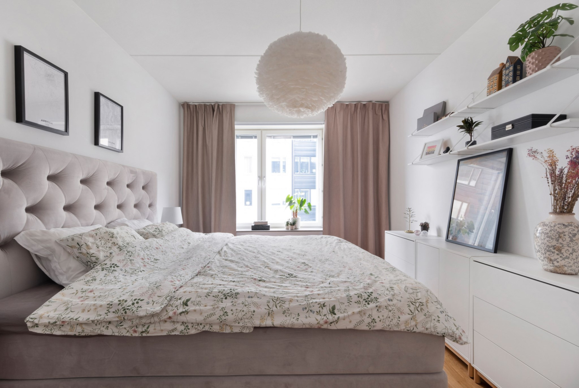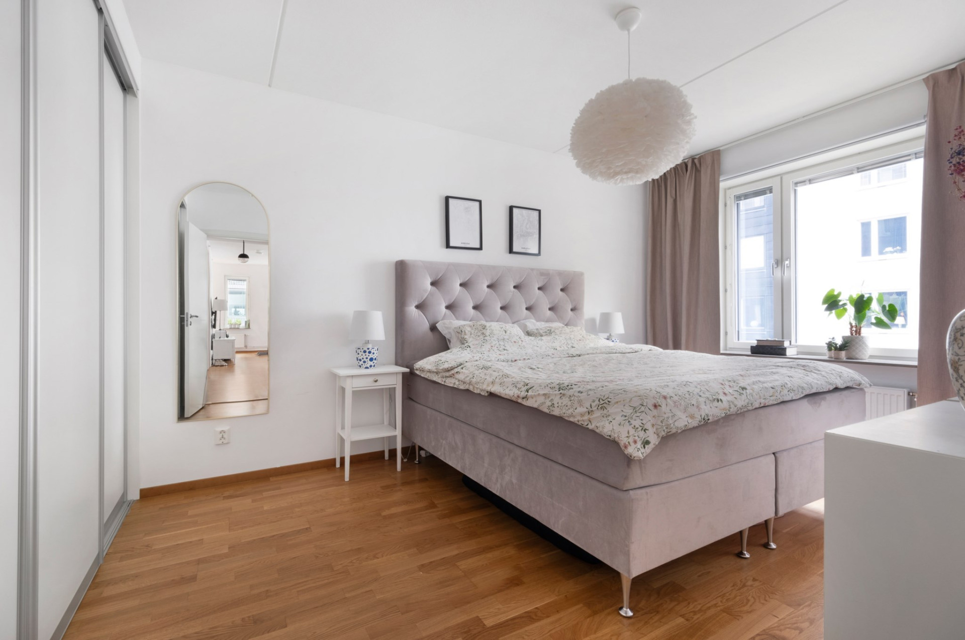 Sovrummen ligger mot den tysta innergården och erbjuder skön avskildhet. Master bedroom har gott om plats för dubbelsäng och generös förvaring i skjutdörrsgarderob, medan det andra rummet passar utmärkt som barnrum, gästrum eller hemmakontor.
