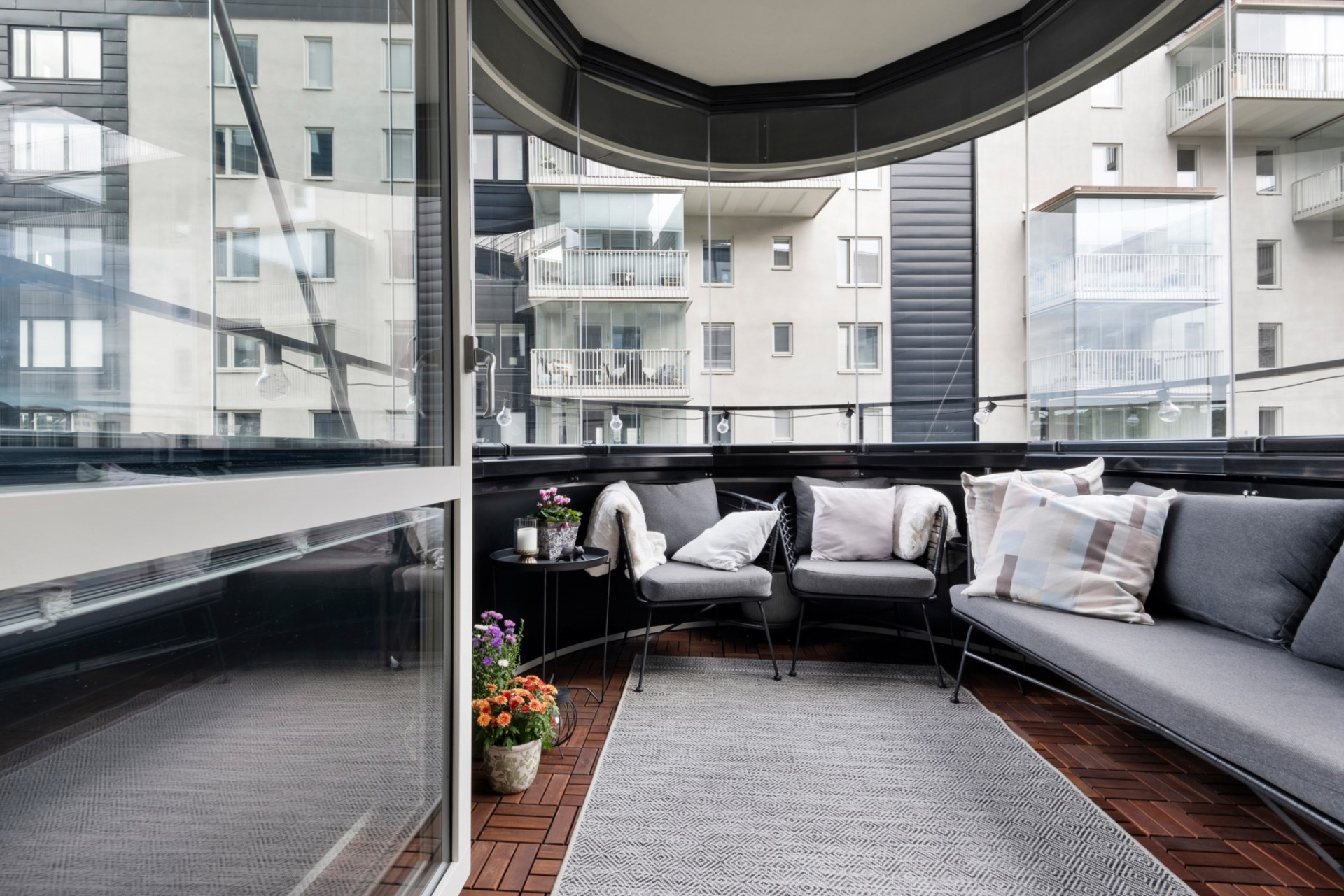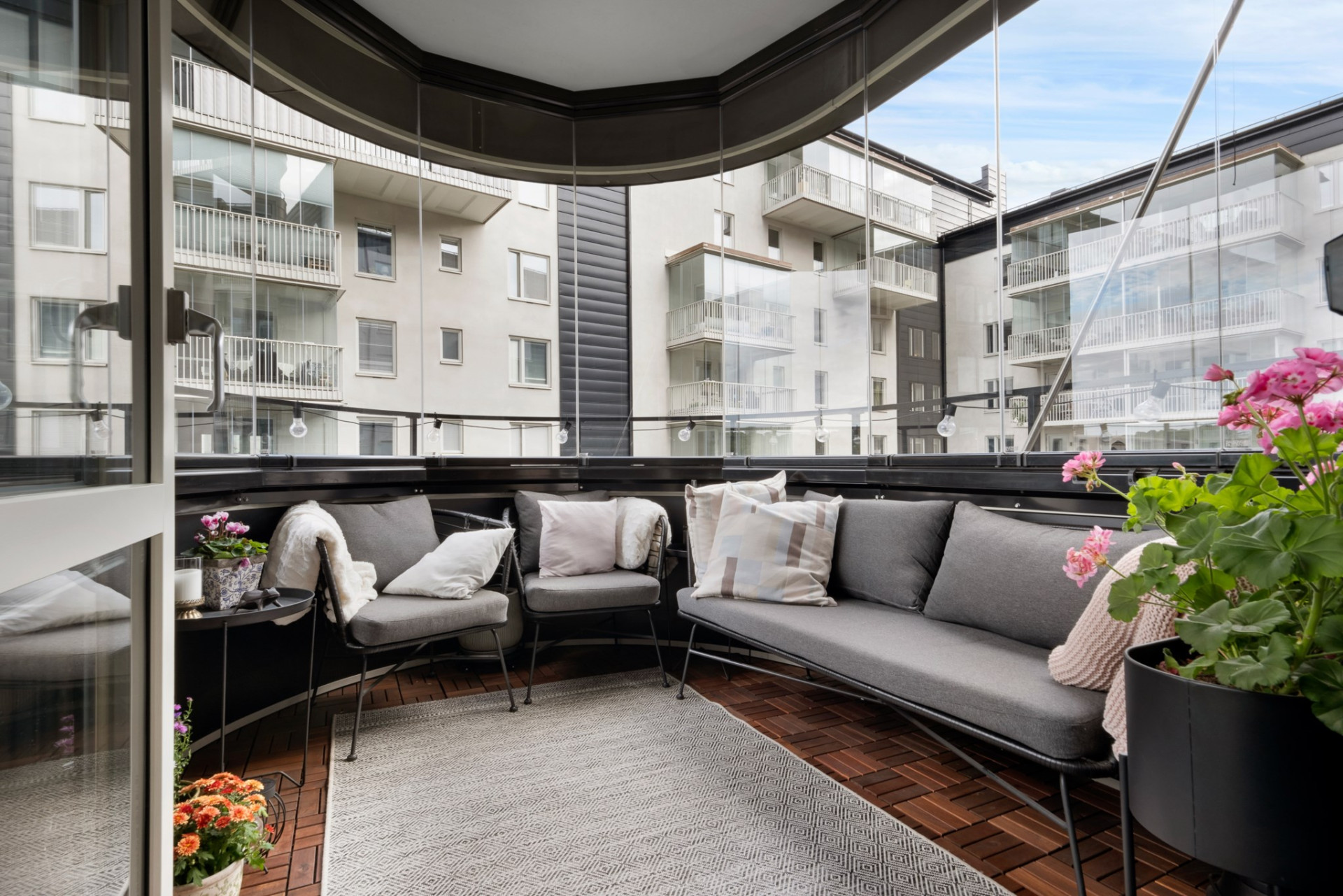 Inglasad och rymlig balkong mot sluten innergård samt fin utsikt på Årstaviken, Tanto och Södermalm. Ett härligt uterum om våren, sommaren och hösten.