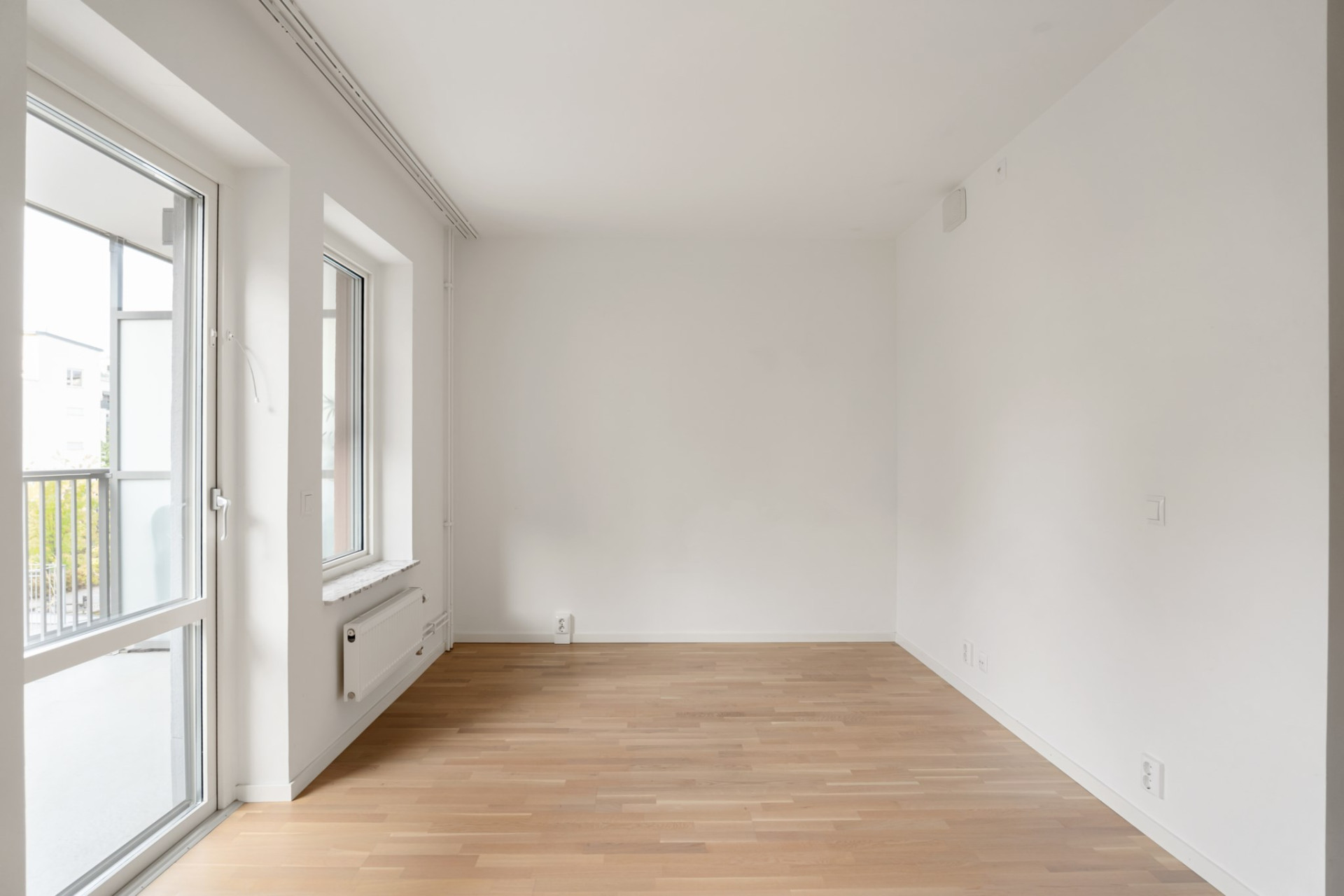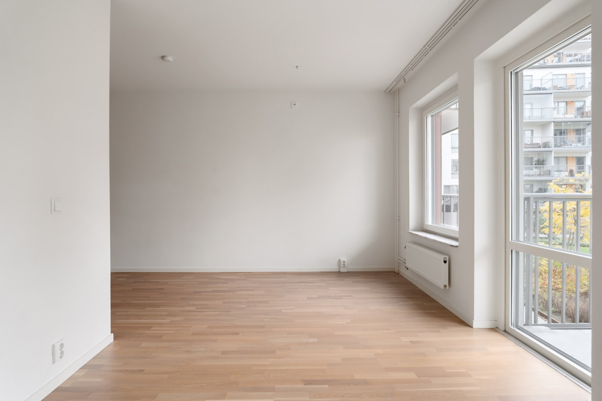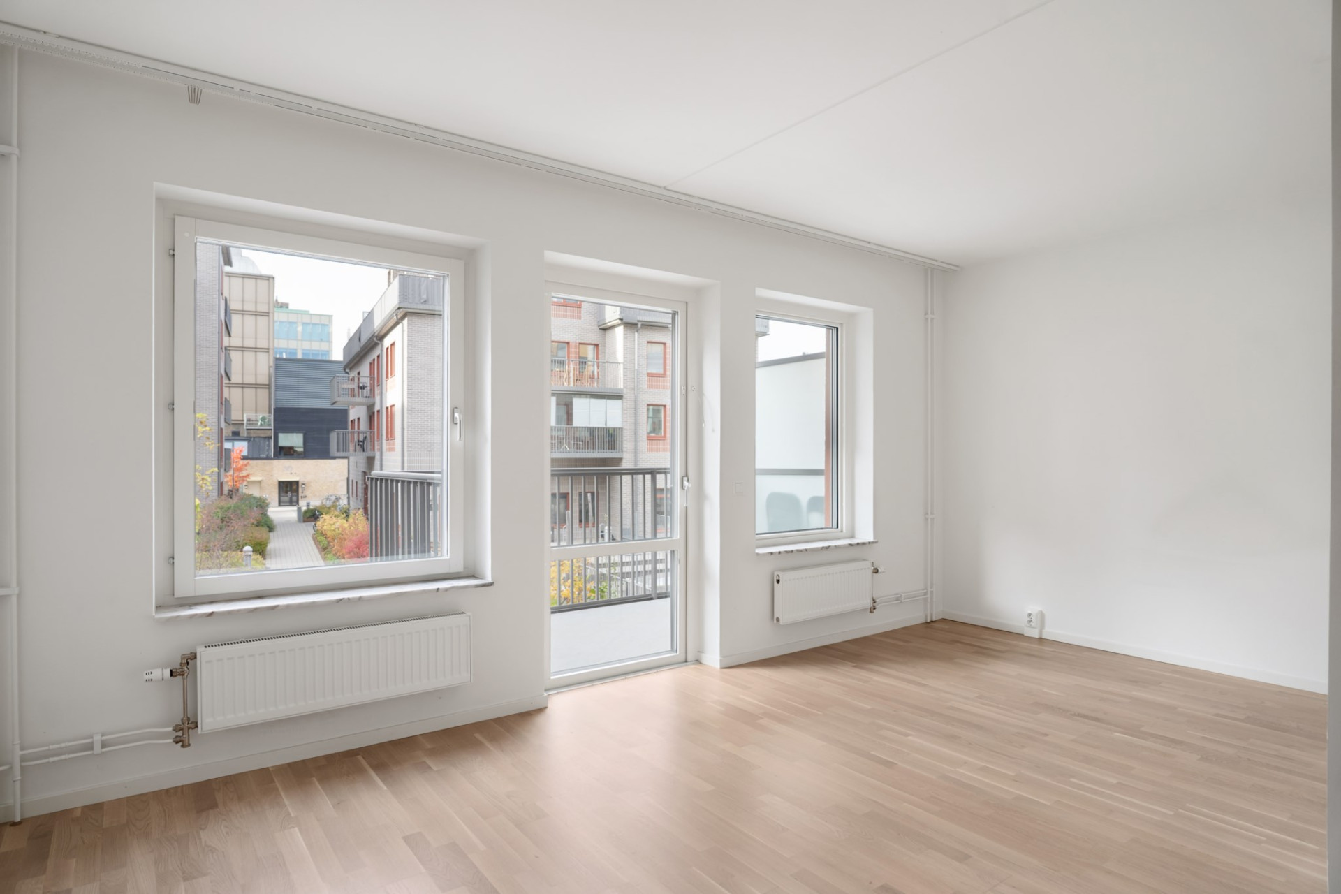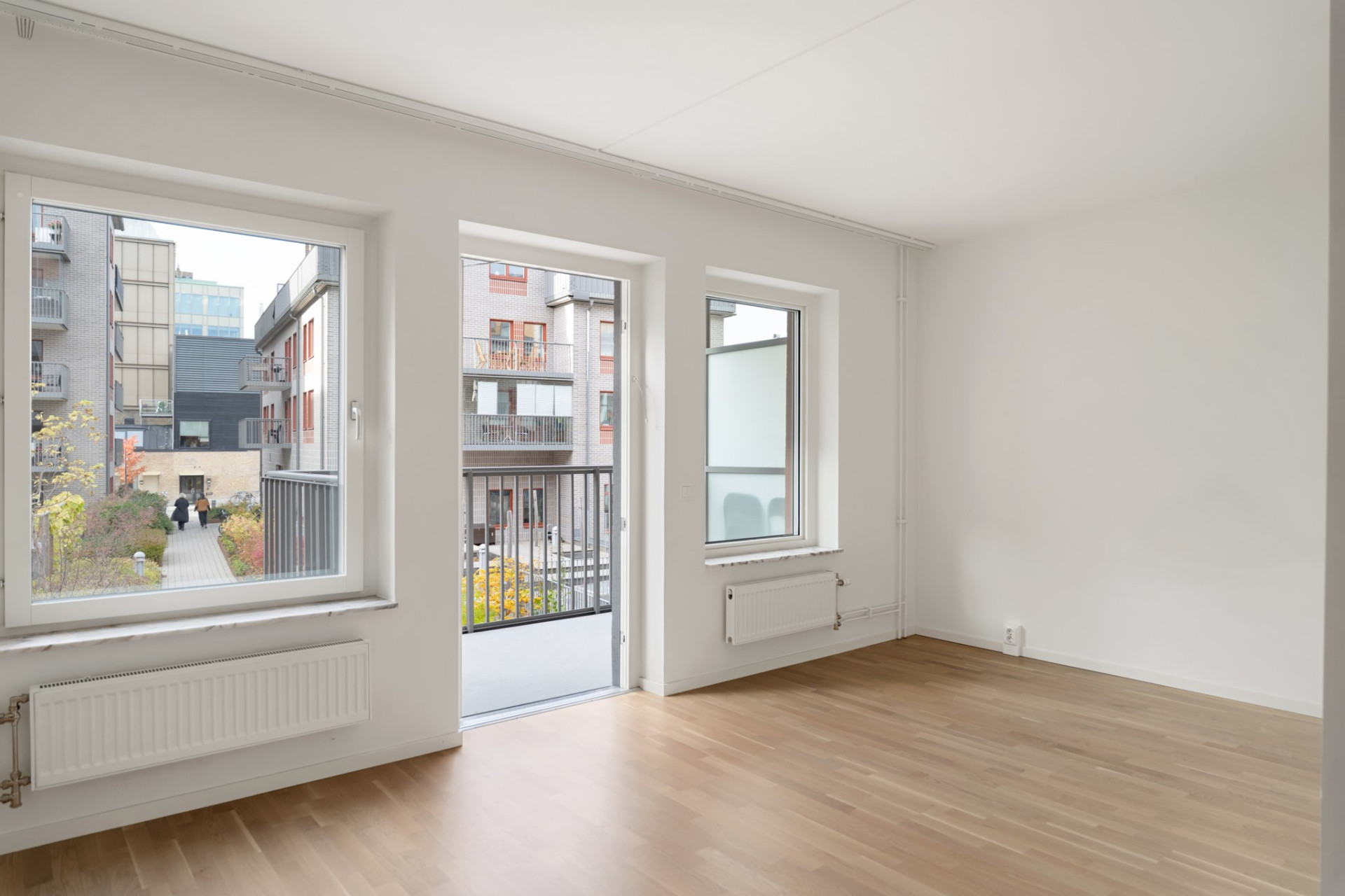 Från köket kommer vi vidare in till vardagsrummet med härligt ljusinsläpp från stora fönster och helglasad balkongdörr. Här ryms soffa med soffbord och i den inre delen kan med fördel inredas till ett trivsamt avskilt sovrum. Från vardagsrummet nås även bostadens balkong.