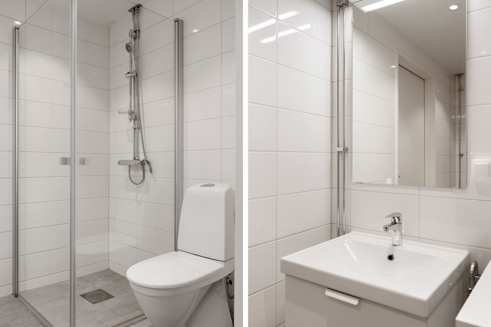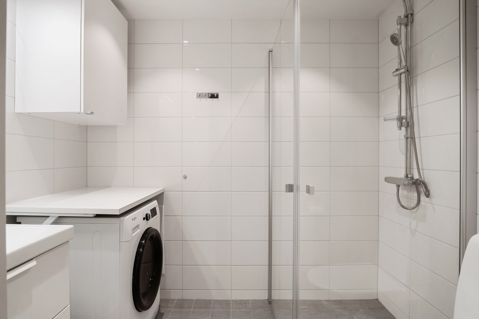 Stilrent och modernt badrum med vitkaklade väggar samt ljusgrått klinkergolv. Den dimbara belysningen låter dig vakna till i egen takt. Badrummet är utrustat med tvättställ med kommod, kombinerad tvättmaskin/torktumlare, dusch samt wc.