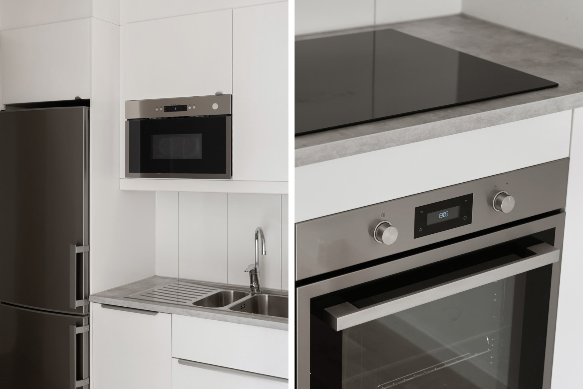 Vidare in i bostaden åt vänster möts vi av ett modernt kök med bra förvaring bakom vita luckor och lådor. Bra arbetsyta på ljusgrå bänkskiva med stänkskydd i vitt kakel ovan. I anslutning till köket finns plats för matbord och stolar. Köket är utrustat med kombinerad kyl/frys, diskmaskin, mikrovågsugn, ugn samt spishäll med spisfläkt.