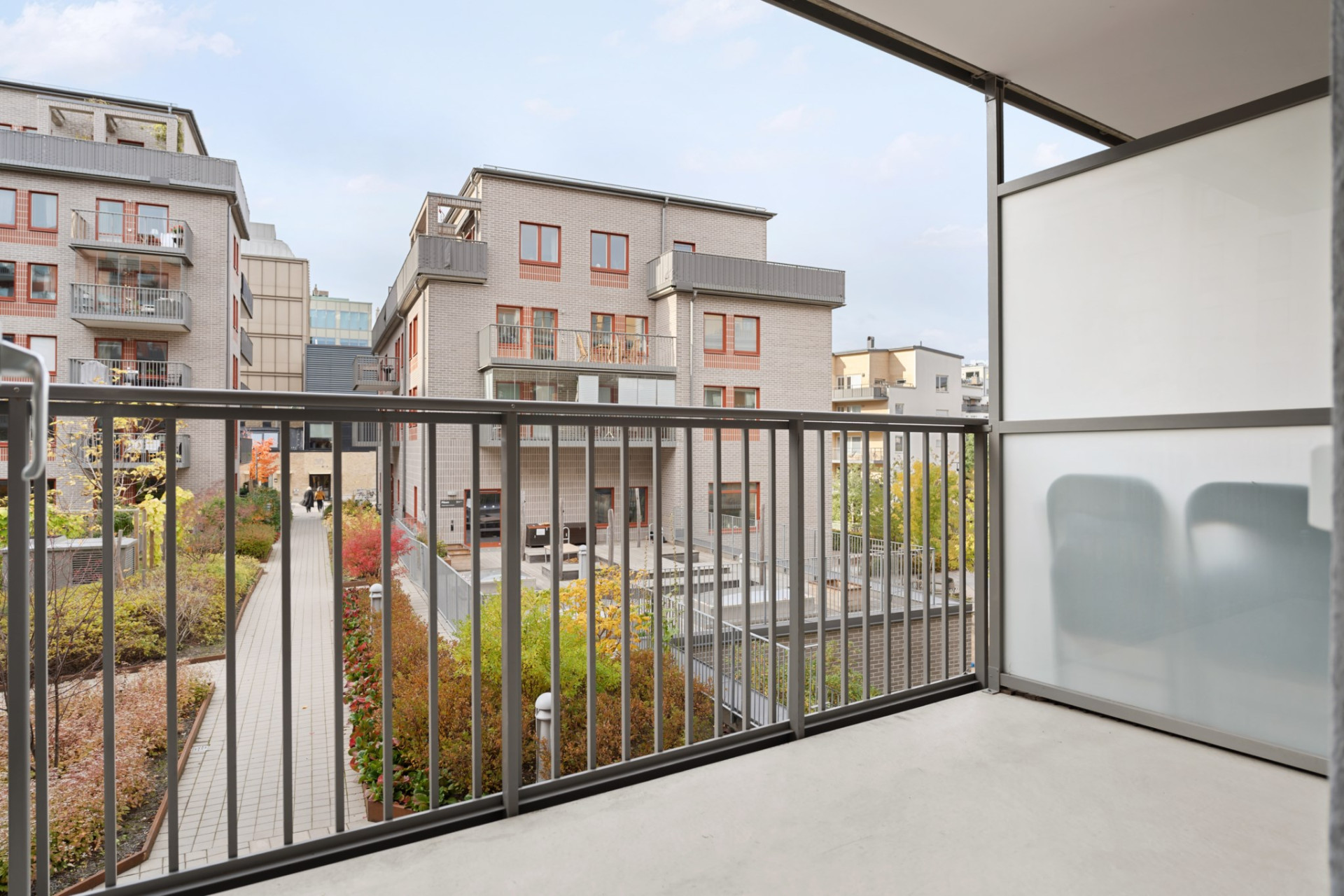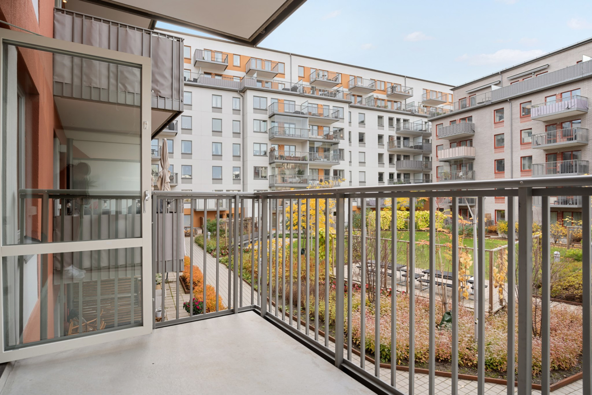 Den väl tilltagna balkongen blir en trevlig förlängning av bostaden och rymmer enkelt balkongmöbler och växter. Här kopplar man av till en fin vy över grönskan på gården. Tack vare västerläget har man ett eftertraktat solläge med sol hela eftermiddagen och kvällen.