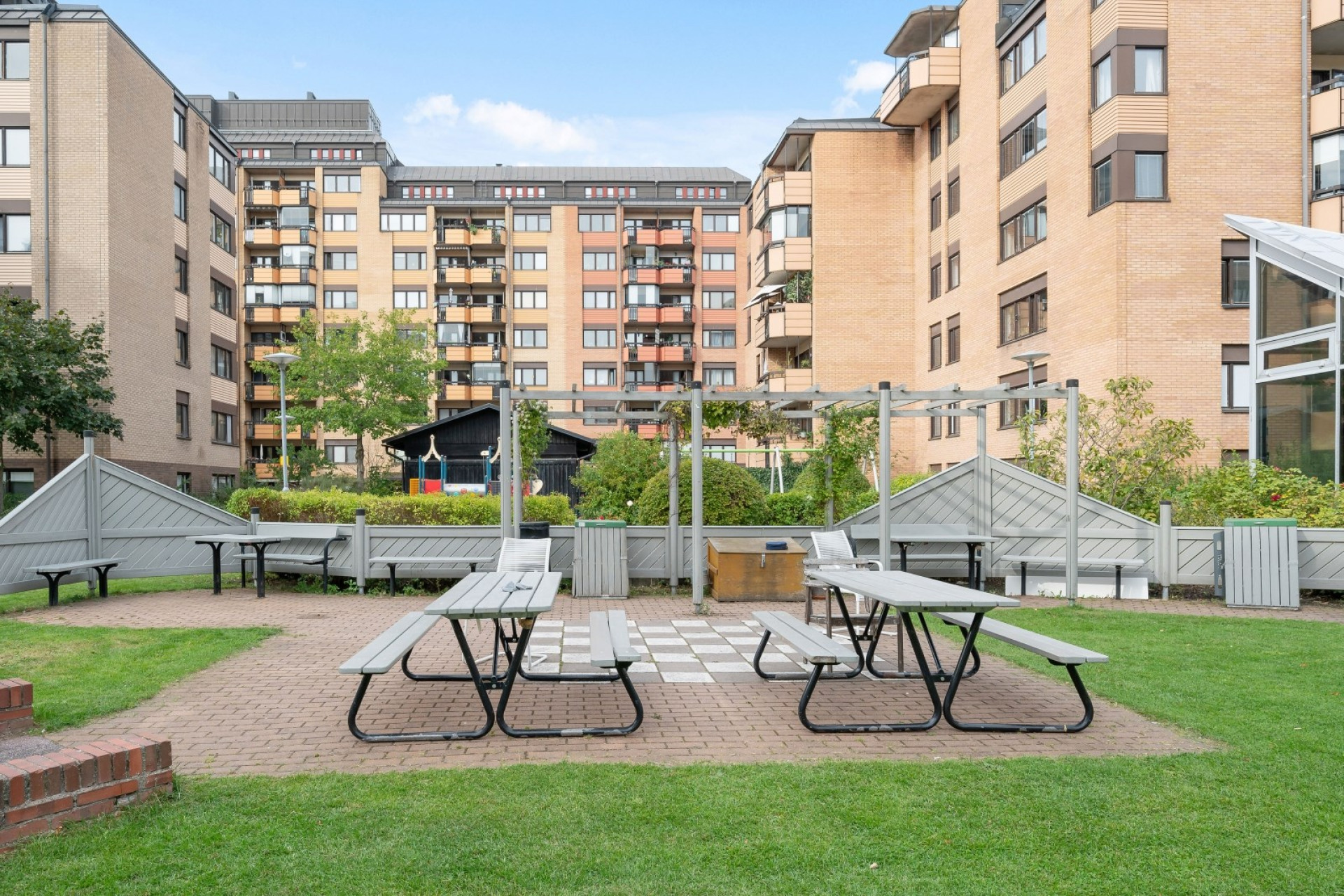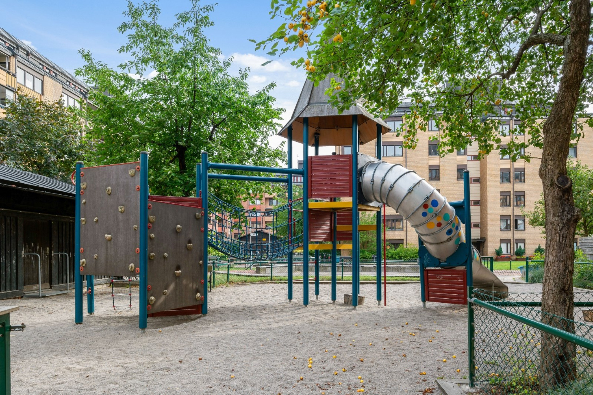 Här har ni allt ni behöver - trevliga helgalunden rätt runt hörnet och en vacker innergård med bl a grillplatser och mysiga utegrupper. Här bor du i hjärtat av Södermalm och via gården kommer man smidigt ned till Ringens köpcentrums bägge entréer och även ut mot Ringvägens övergångställe ned till Årstaviken och Eriksdalsbadet. Det finns även ett garage i huset (tillhör ej föreningen) som hyr ut parkeringsplatser via Aimo Park.