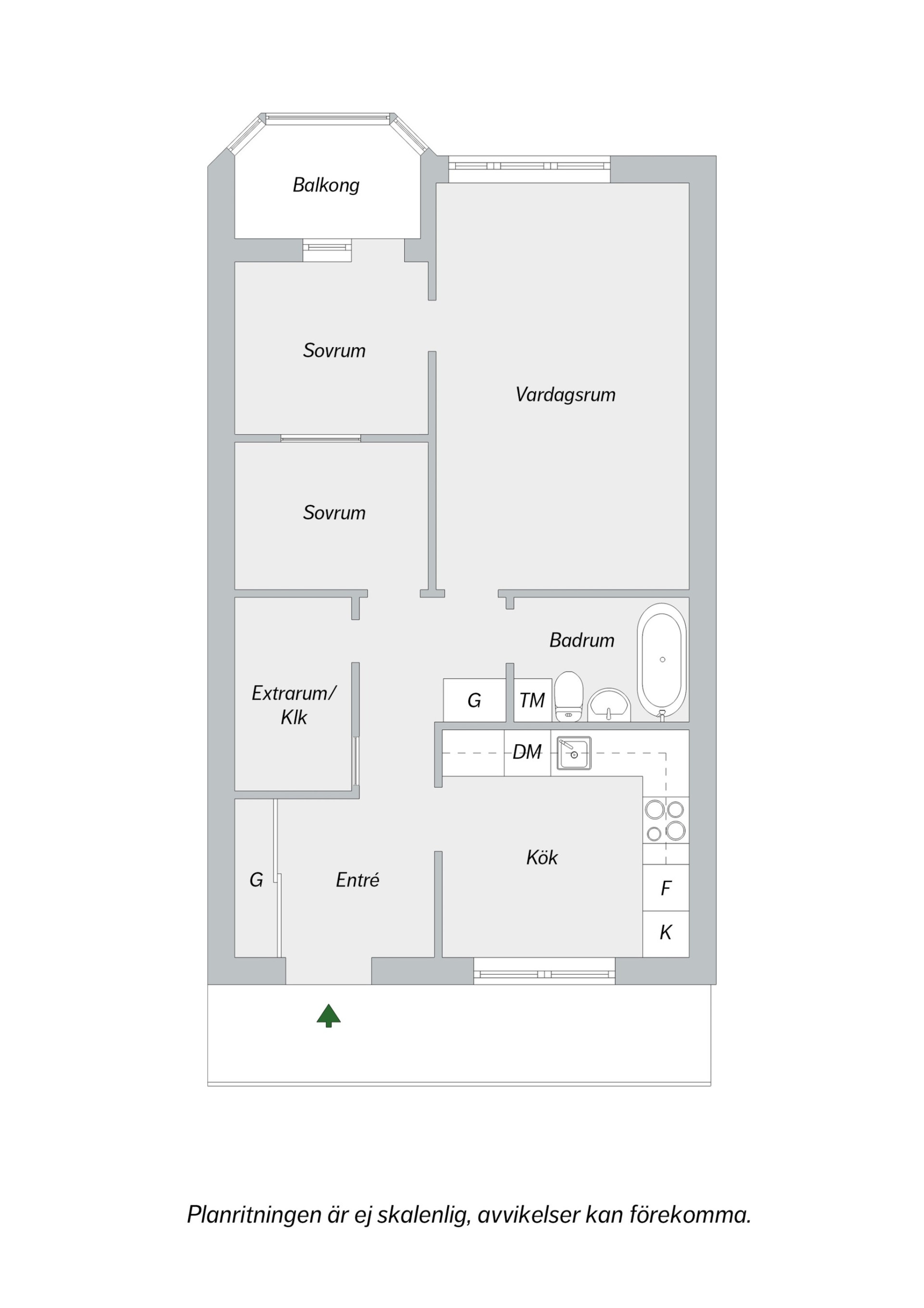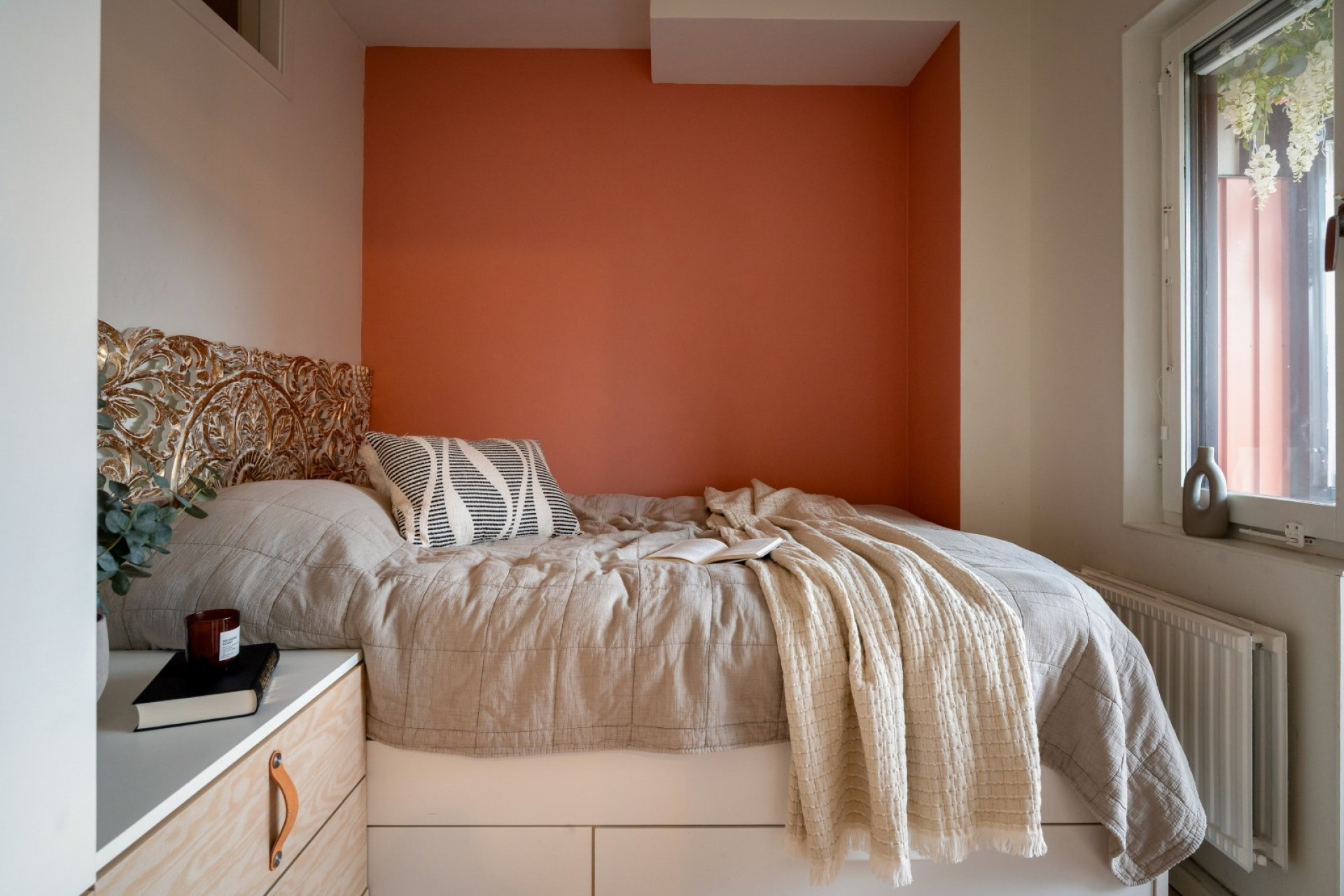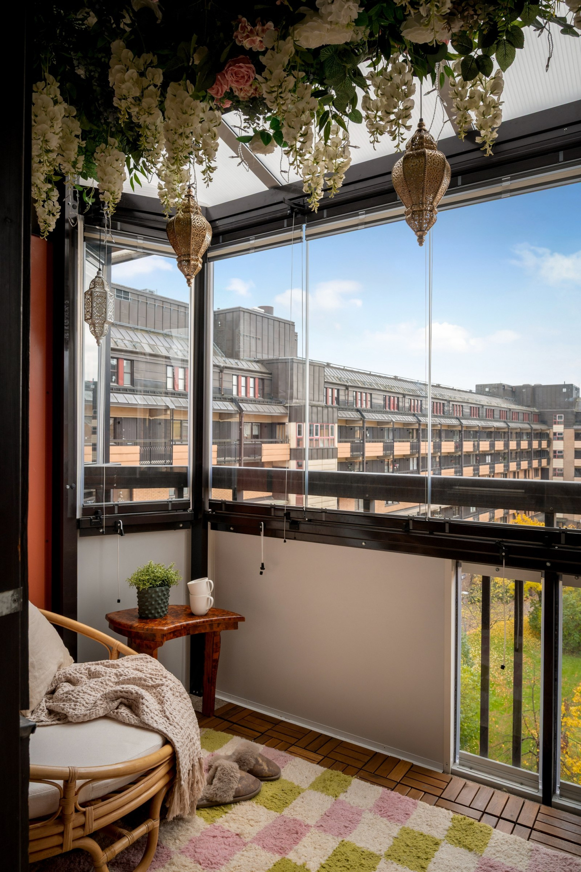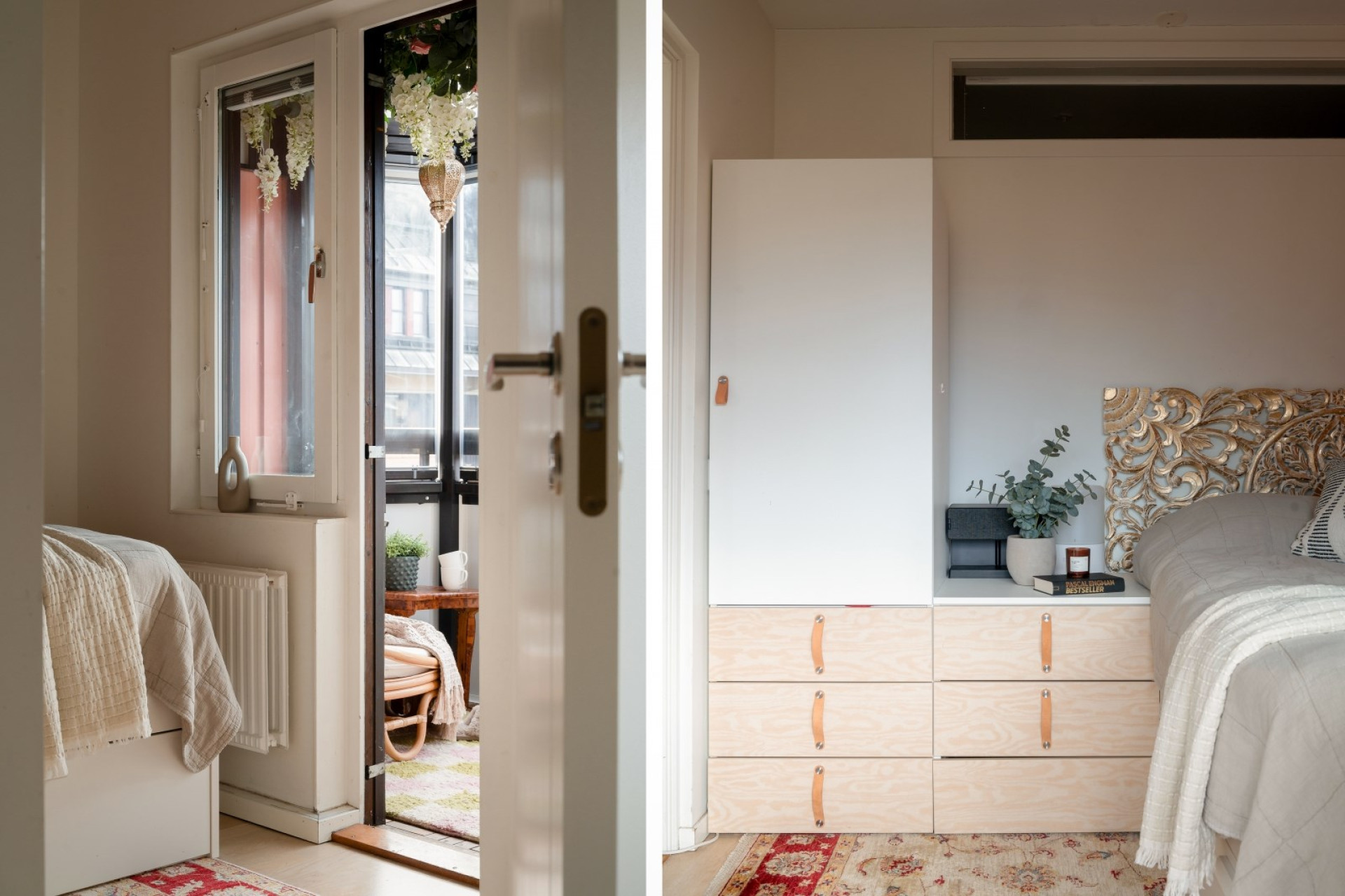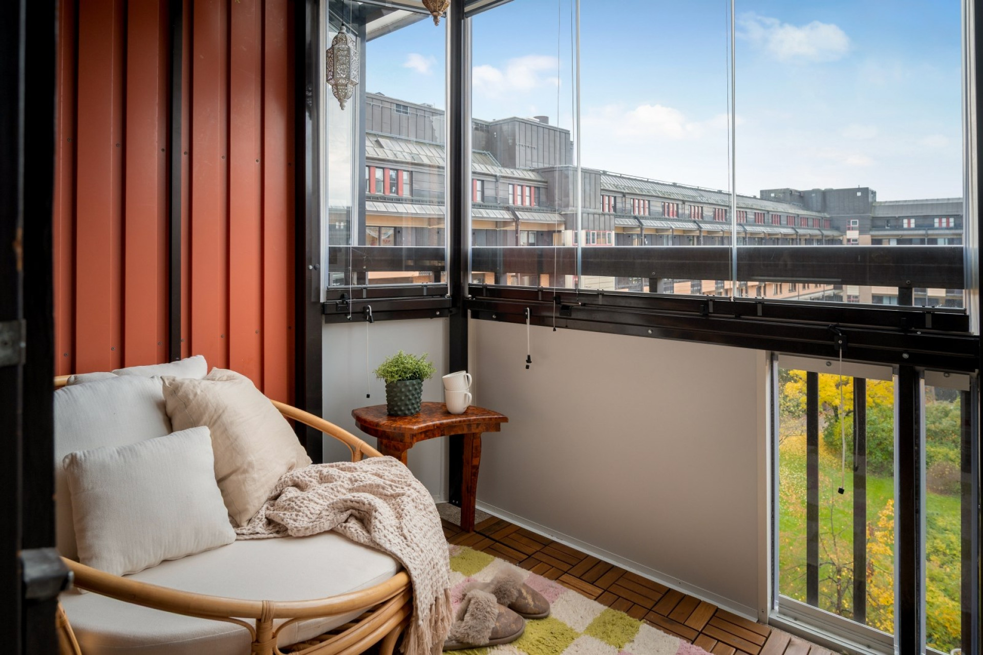 Från sovrummet når man bostadens trevliga balkong i västerläge med utsikt över innergården.
