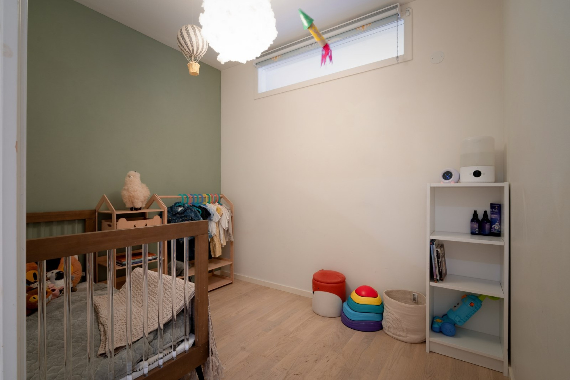 Stort sovrum som har delats av till två. Det ena med fönster ut mot gården och plats för dubbelsäng, och det andra nyttjas idag som barnkammare.