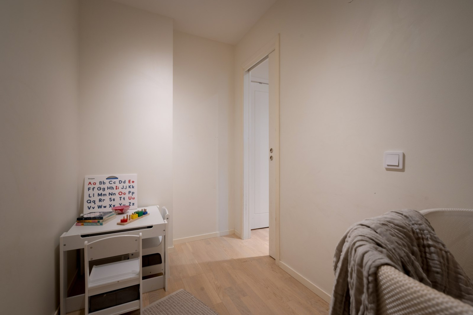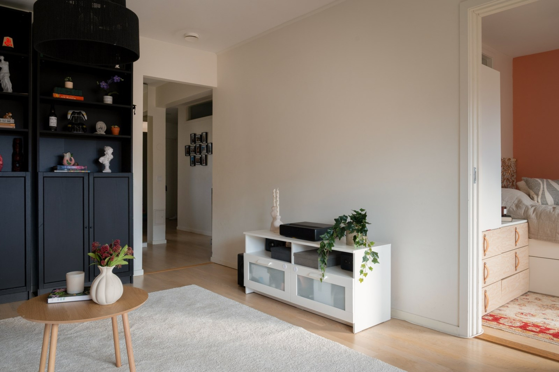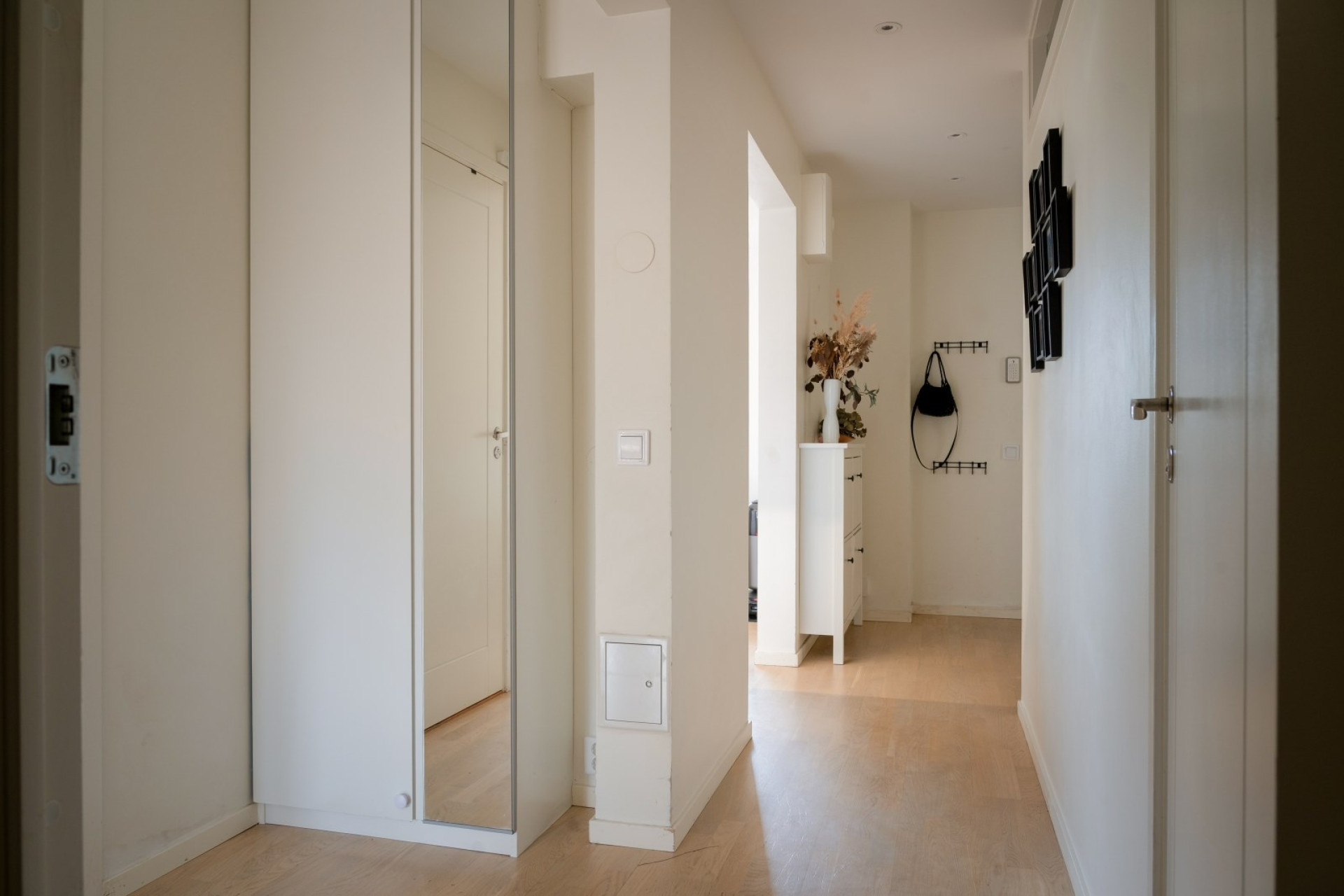 Hallen är rymlig och inbjudande med fina golv som ackompanjeras av ljusa väggar, vilket är ett genomgående för lägenheten. Här finns gott om plats för avhängning av ytterkläder. Hallen ansluter vidare till bostadens samtliga rum.
