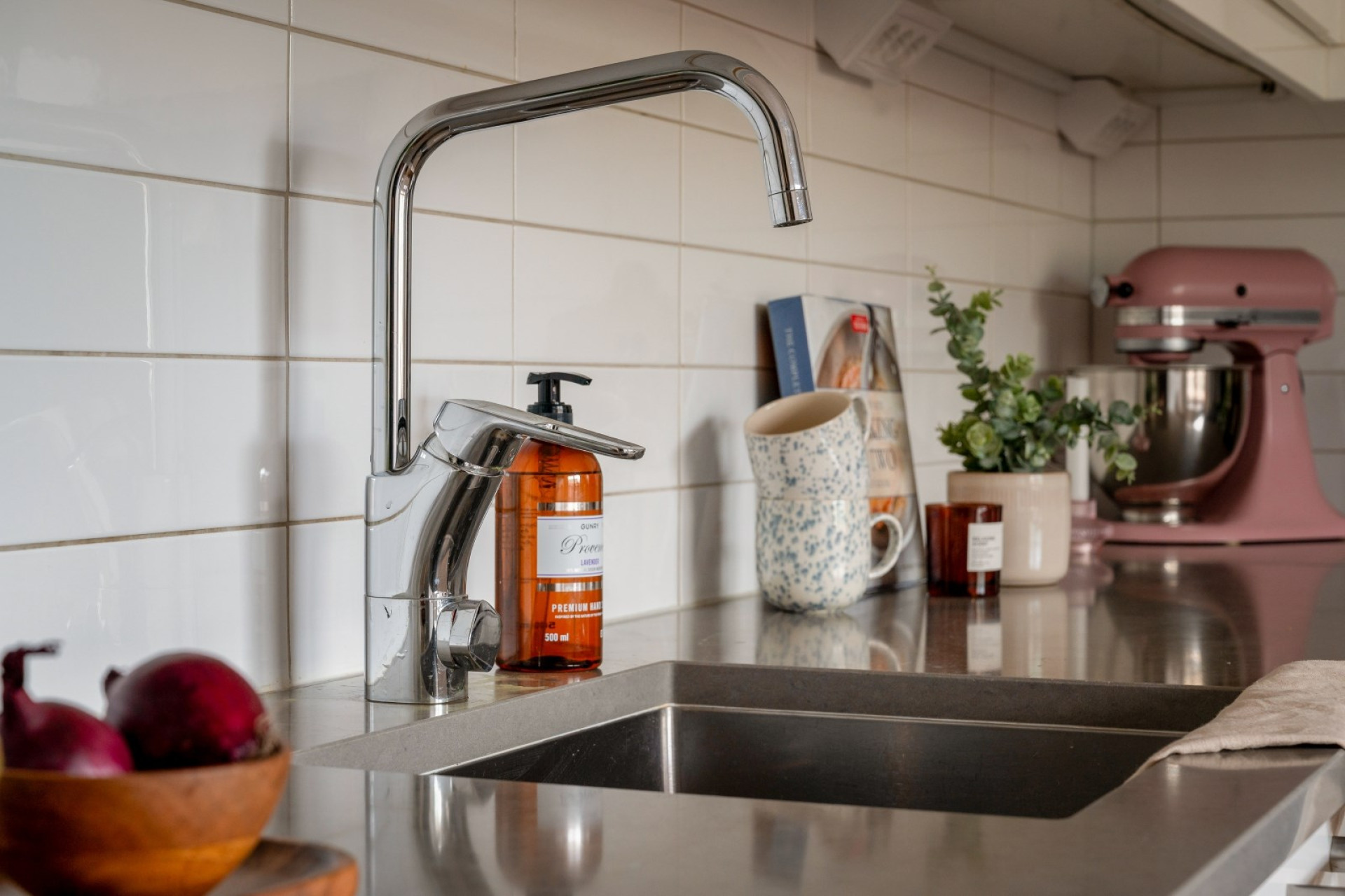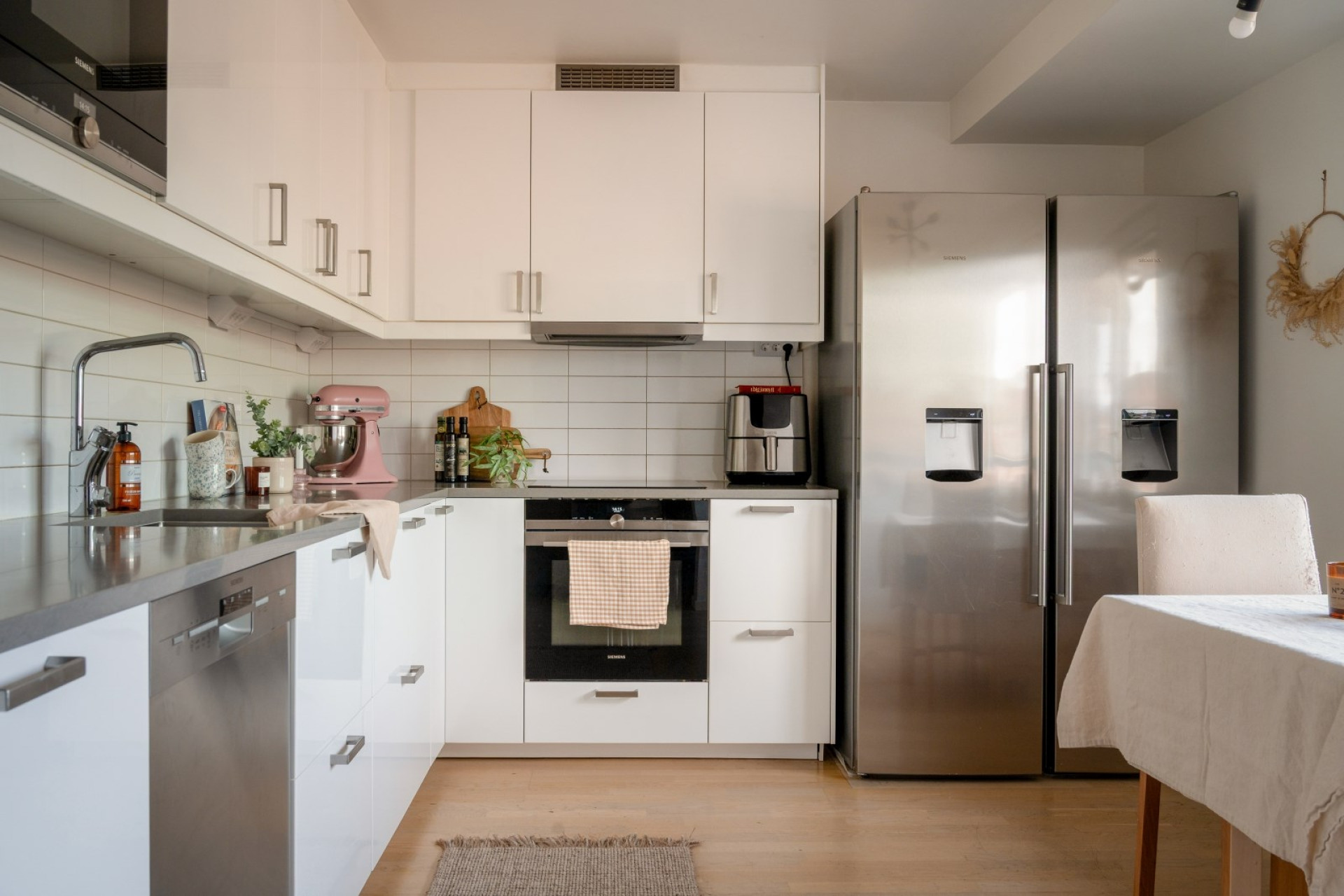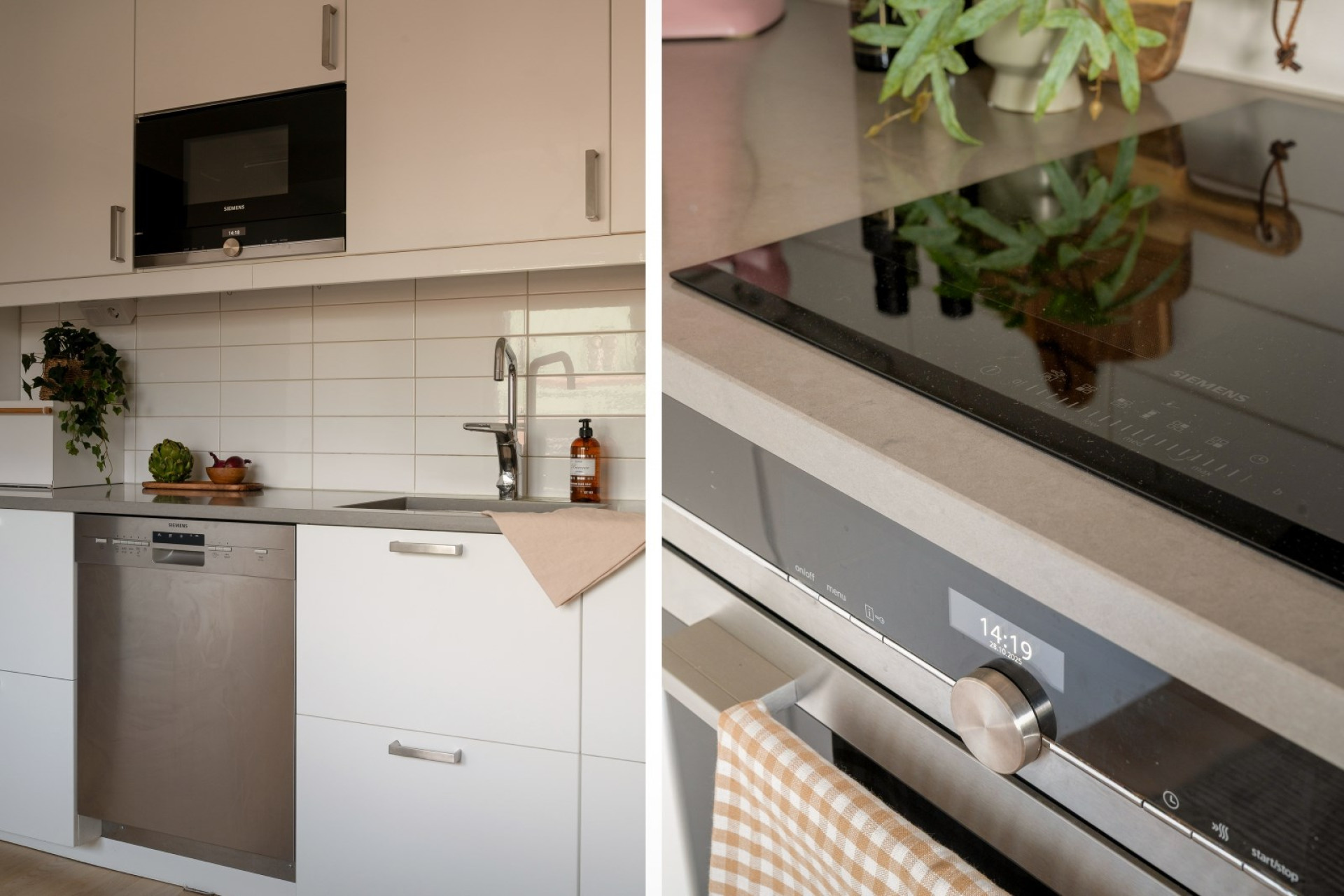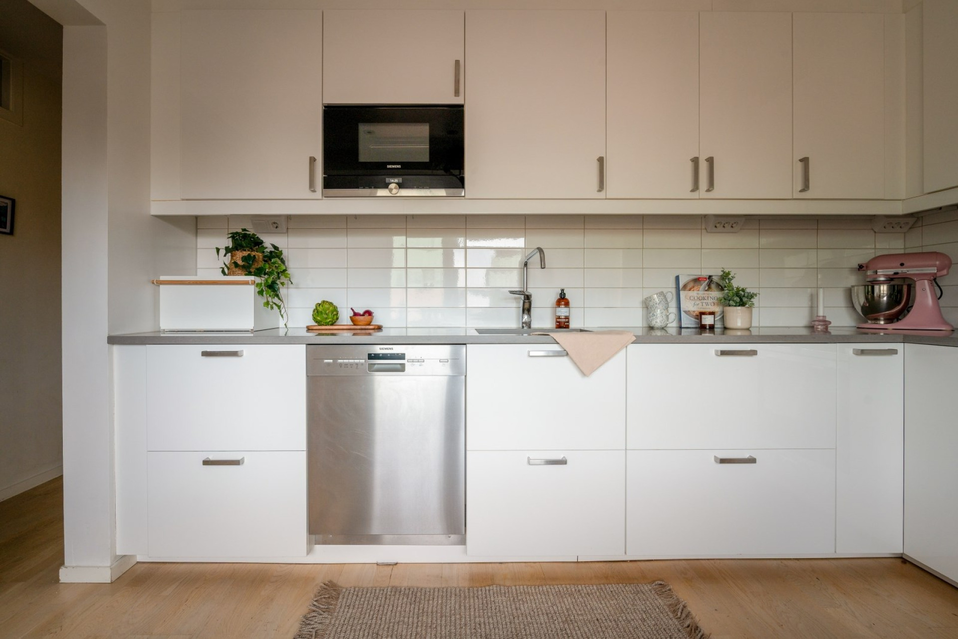 Rymligt, modernt och stilrent renoverat kök. I köket har man goda arbetsytor samt gott om förvaring bakom de stilrena luckorna. Den maskinella utrustningen består av kyl, frys, diskmaskin, infälld spishäll, inbyggnadsugn och fläkt. Här får man plats med matbord för upp till 4 personer.