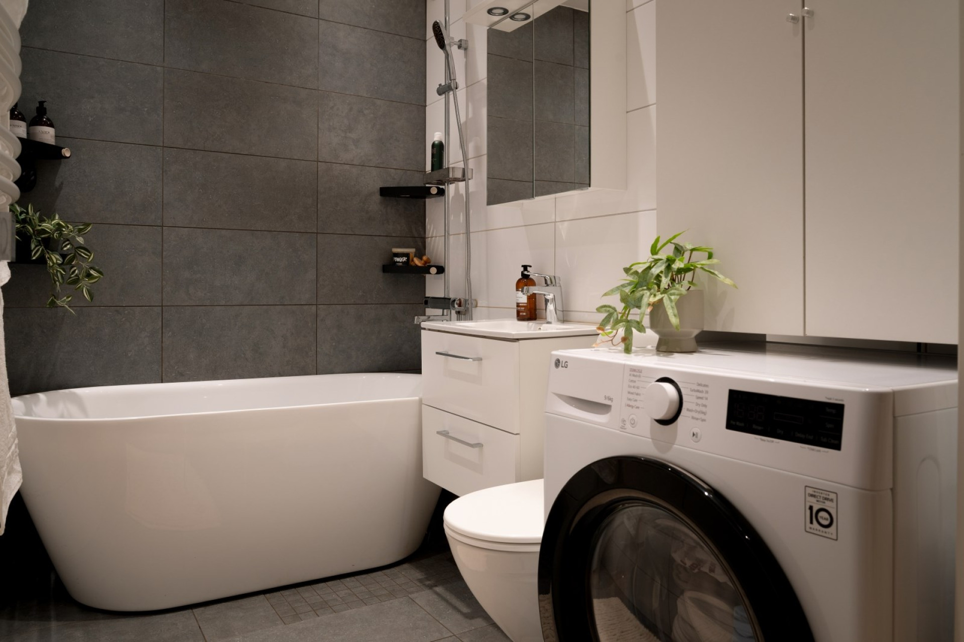 Modernt helkaklat badrum med golvvärme och en inredning genom tvättställ, wc och dusch samt en tvättmaskin.