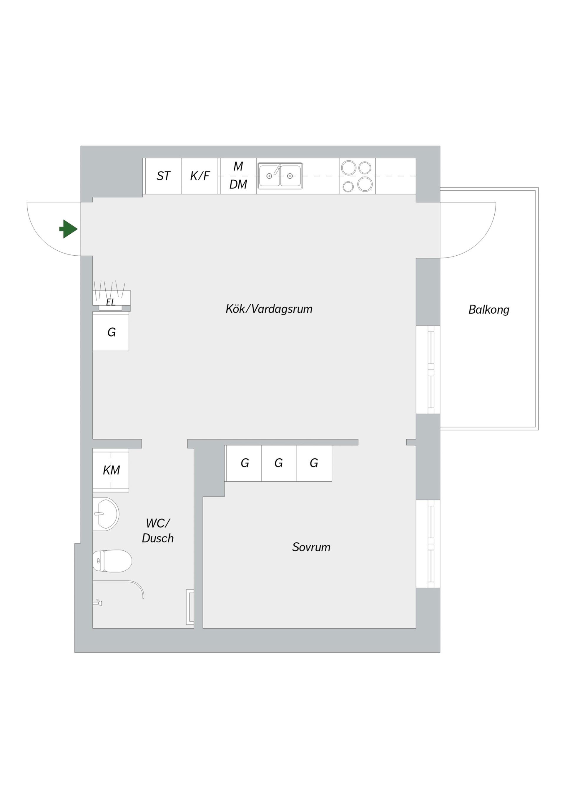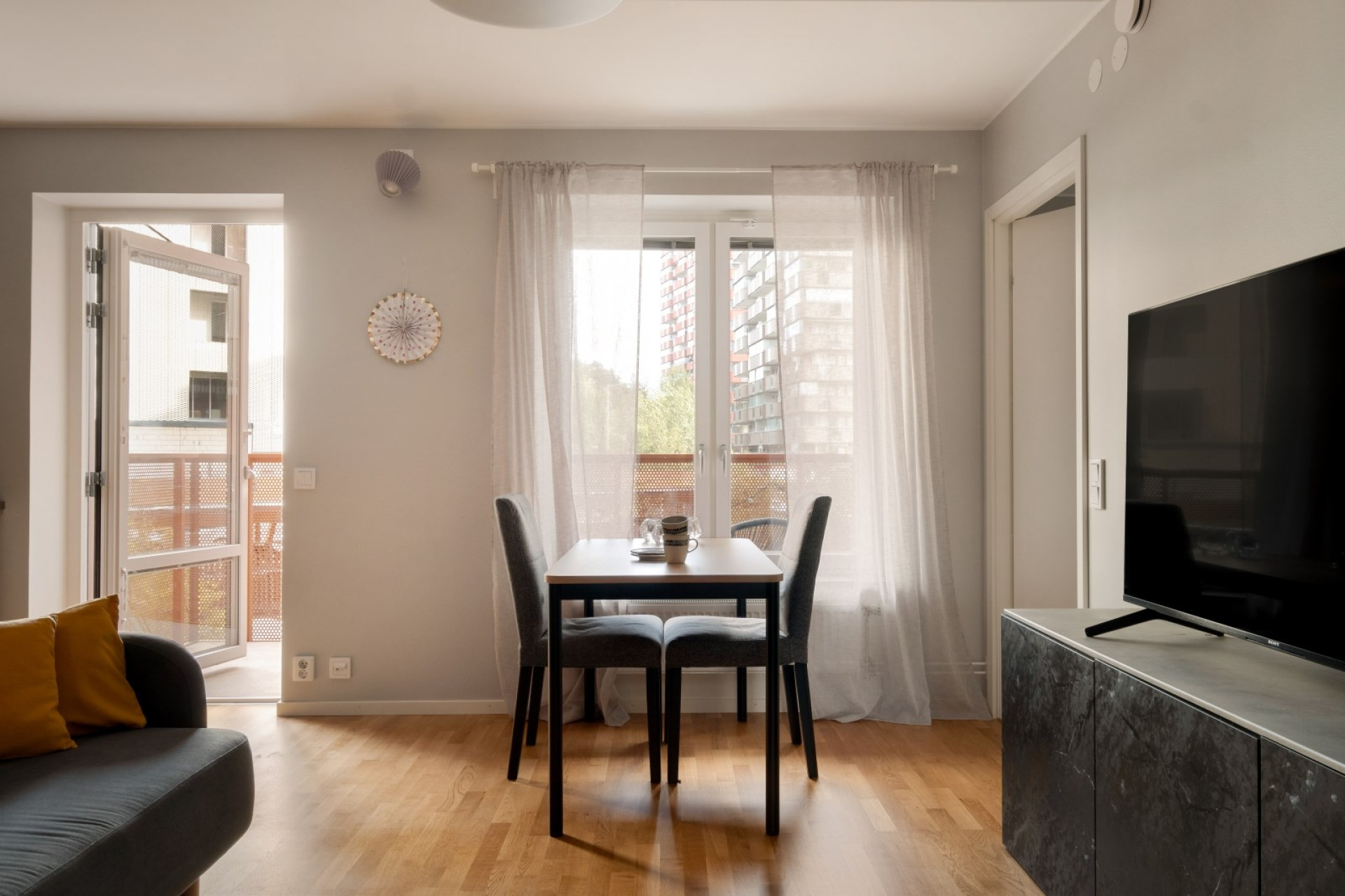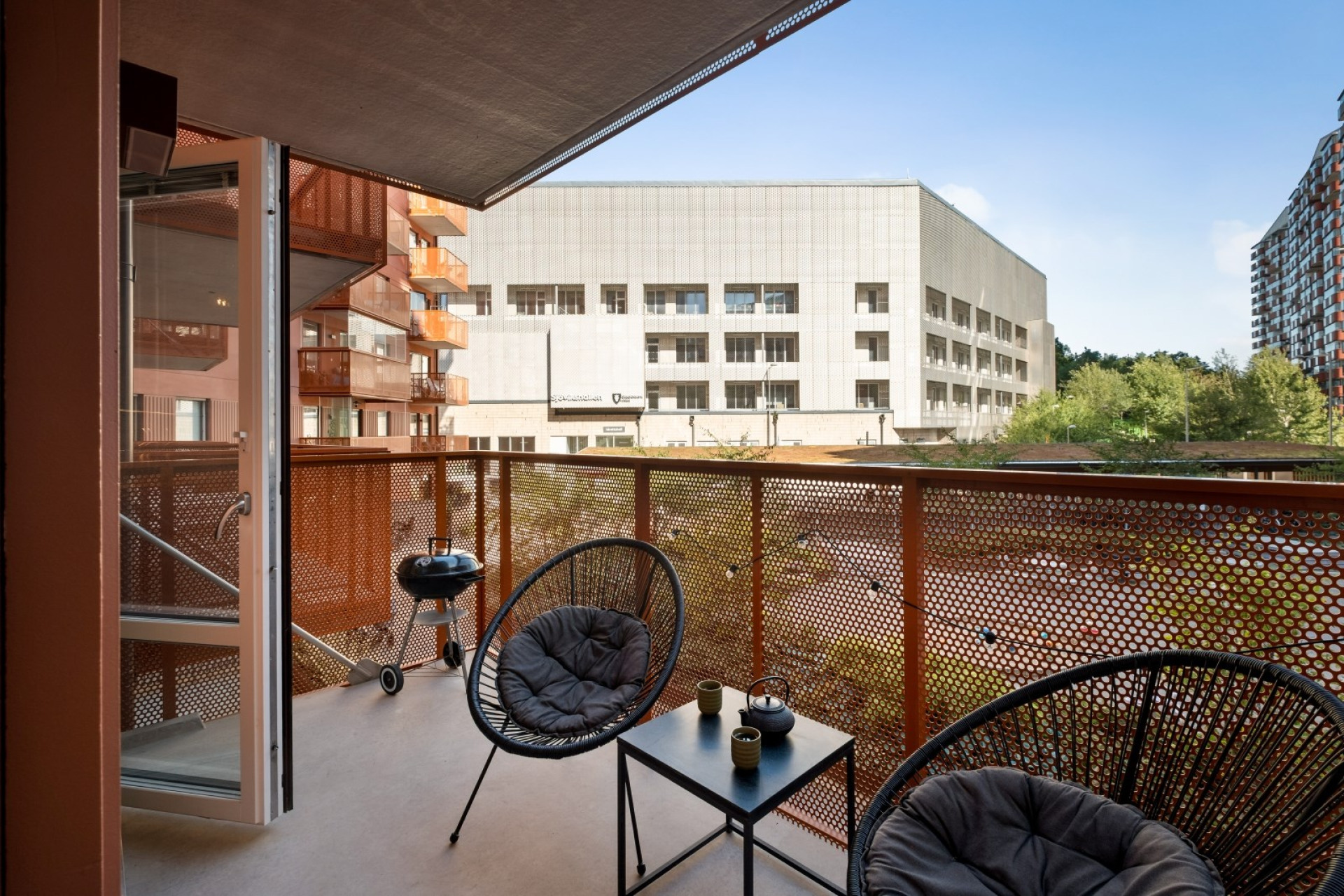 Utgång till balkong som vetter mot föreningens gård. Balkong är om ca 6 kvm och bidrar till den öppna känslan i lägenheten.