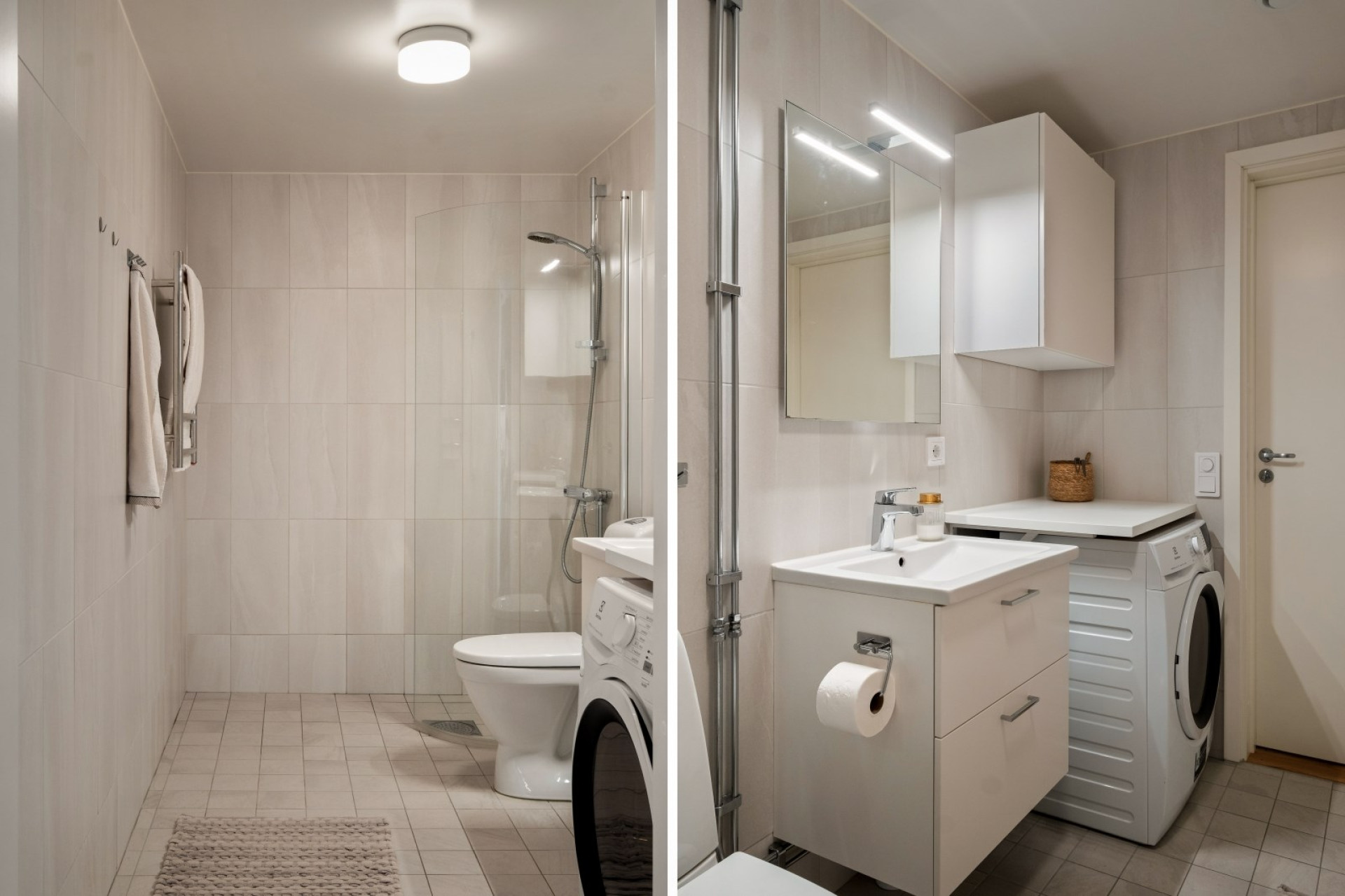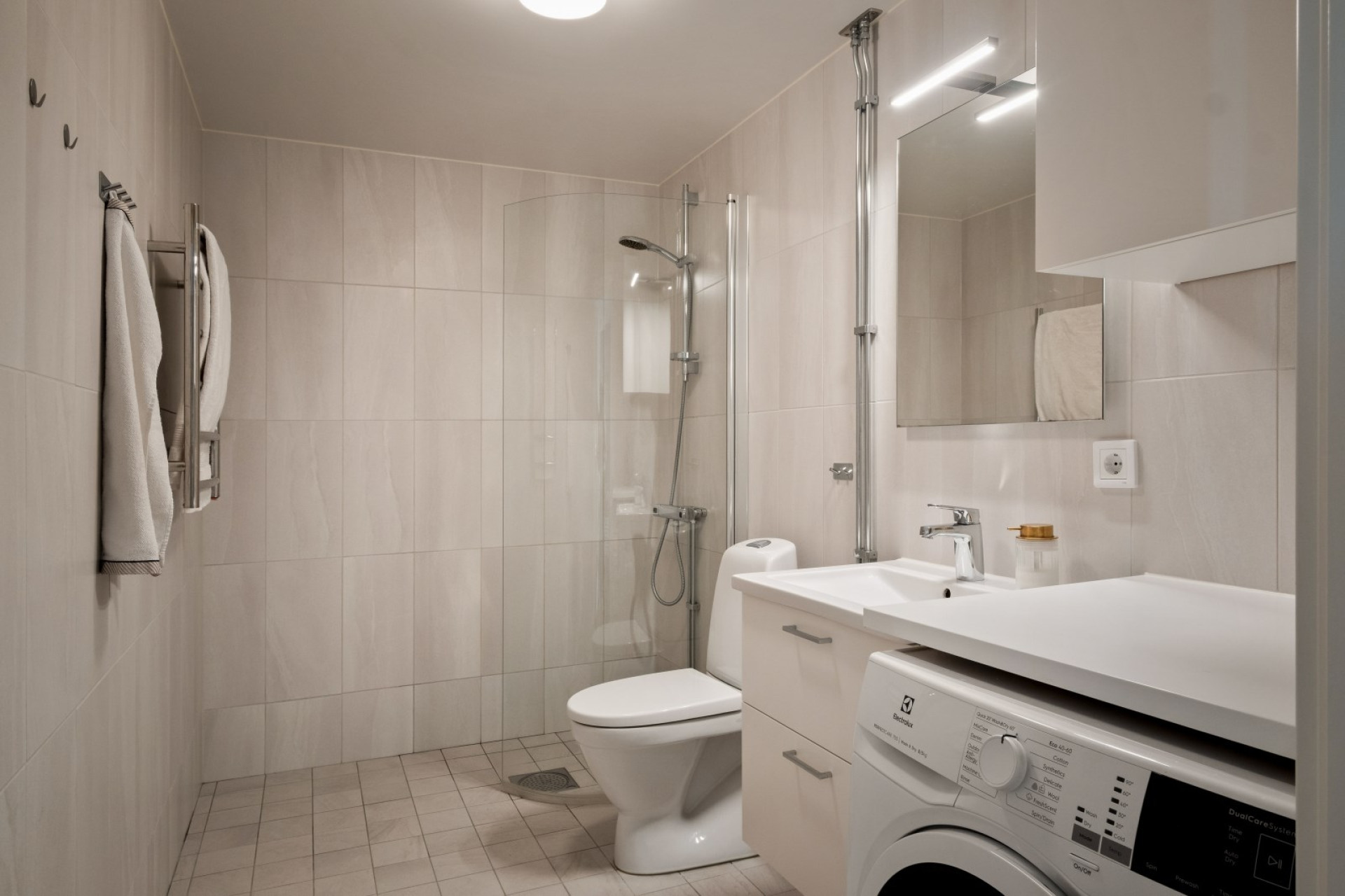 Härligt badrum med stora kakelplattor på vägg samt klinkergolv. Badrumsinredningen består av dusch med frostat glasvägg, handdukstork med glasvägg, wc, handfat och badrumsskåp med spegel. Kombinerad tvättmaskin/torktumlare (Electrolux) gör det enkelt att ta hand om tvätten hemma.